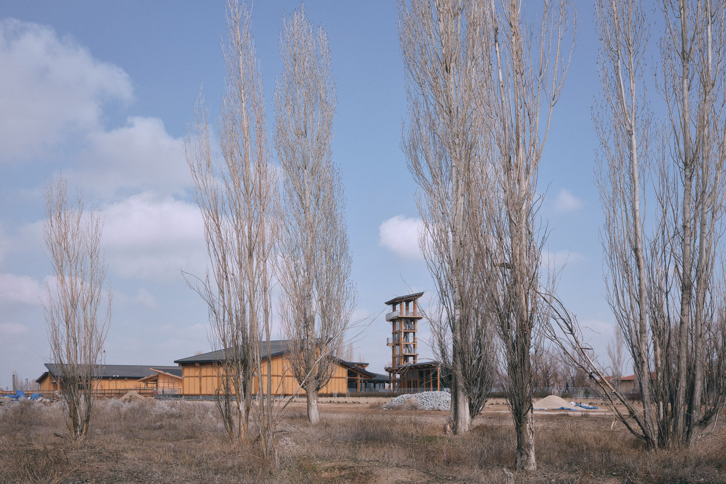 To the east, a 22-metre high wooden tower rises above the centre to provide visitors with views over the two archaeological mounds of the ancient settlement and across the adjacent plains.
