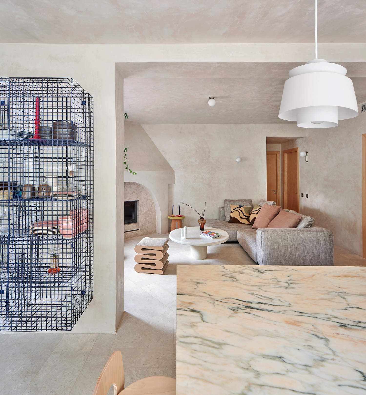 Casa Montesa는 하이랜드와 모던한 디자인 요소를 결합해 자연과의 연결을 강조한 주택입니다. 깊은 창틀과 버건디 타일로 마감된 주방 아일랜드가 주요 요소로, 요리, 식사, 작업이 가능한 다목적 공간으로 설계되었습니다. 수작업으로 제작된 버건디 타일과 캠파스페로 석재 바닥의 조화는 공간에 독특한 텍스처와 색상의 대비를 더해, 미니멀리스트 디자인을 한층 고급스럽게 만들었습니다.