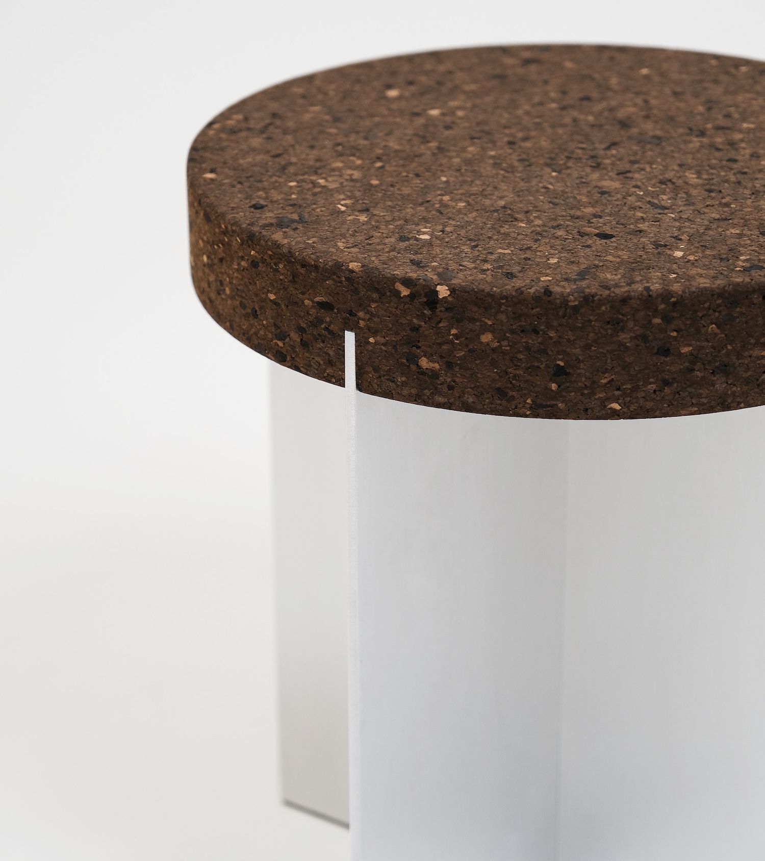 Collection Cork X is a minimalist collection of pieces designed by Germany-based designer Robert Megel. The collection pairs the tactile warmth of Portuguese cork with the precision and sleekness of satin-finished aluminum, creating pieces that emphasize both functionality and material expression. Each piece integrates aluminum elements as structural supports. The metal’s diffuse sheen adds a sense of lightness, while its sharp, filigree edges juxtapose the soft, grooved cork surfaces that form the seating.