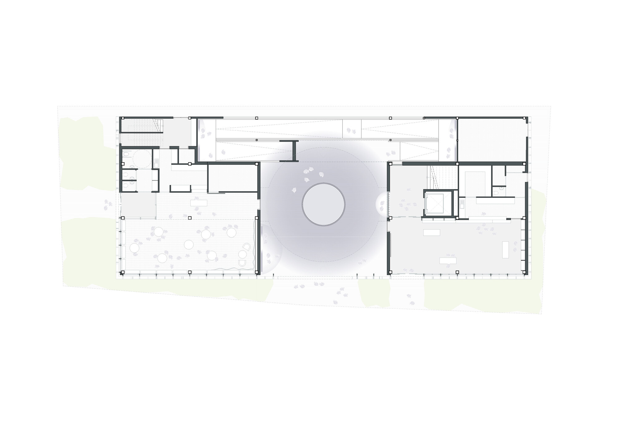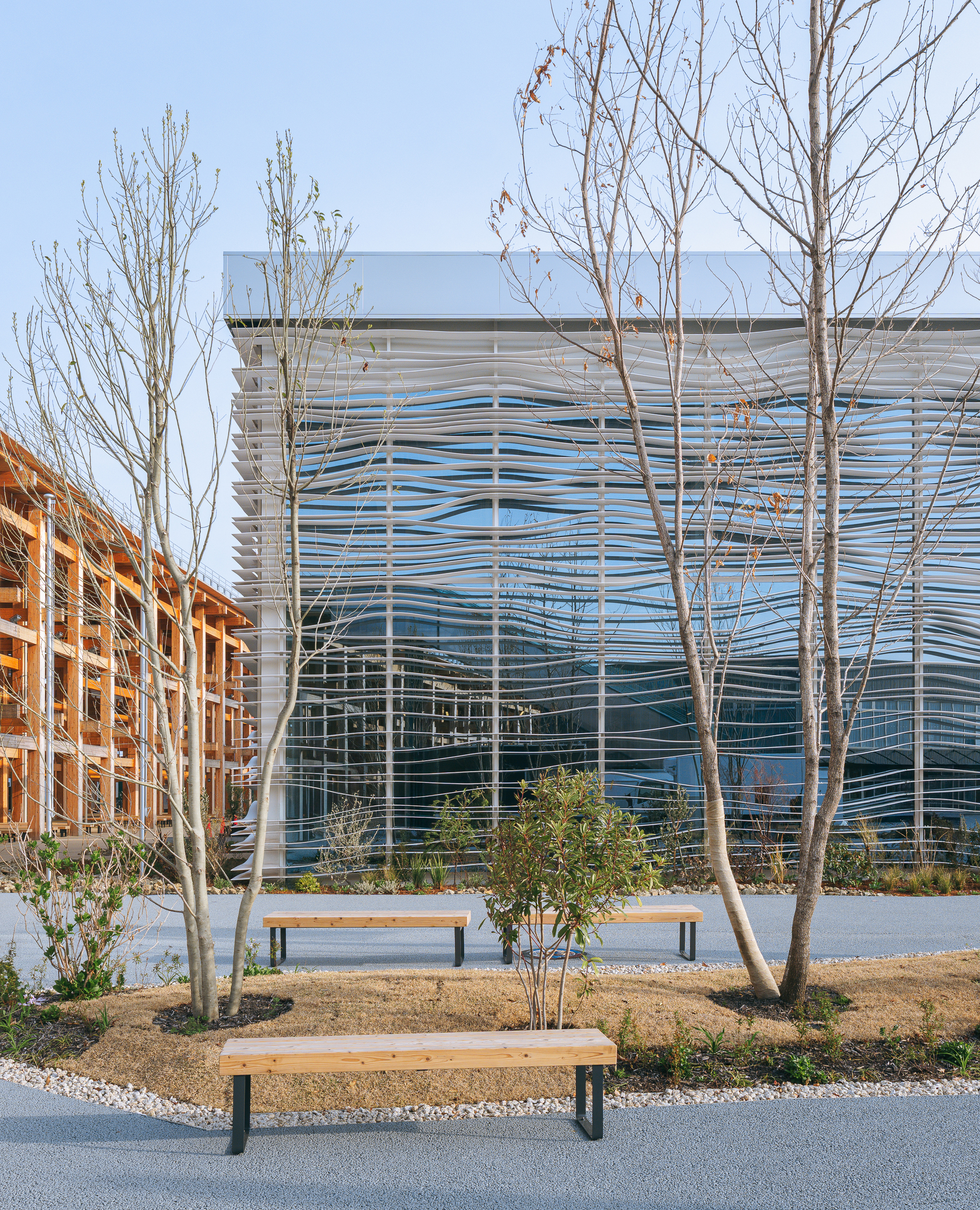 외부 공간은 간결함과 자연성이 돋보인다. 건물 주변에 심어진 초목과 나무들은 인공 구조물과 자연의 대비를 완화하며, 건축이 환경과 조화를 이루는 방식을 보여준다. 목재 벤치는 방문객에게 잠시 쉬어갈 수 있는 공간을 제공하며, 파빌리온을 다양한 각도에서 감상할 기회를 준다.
