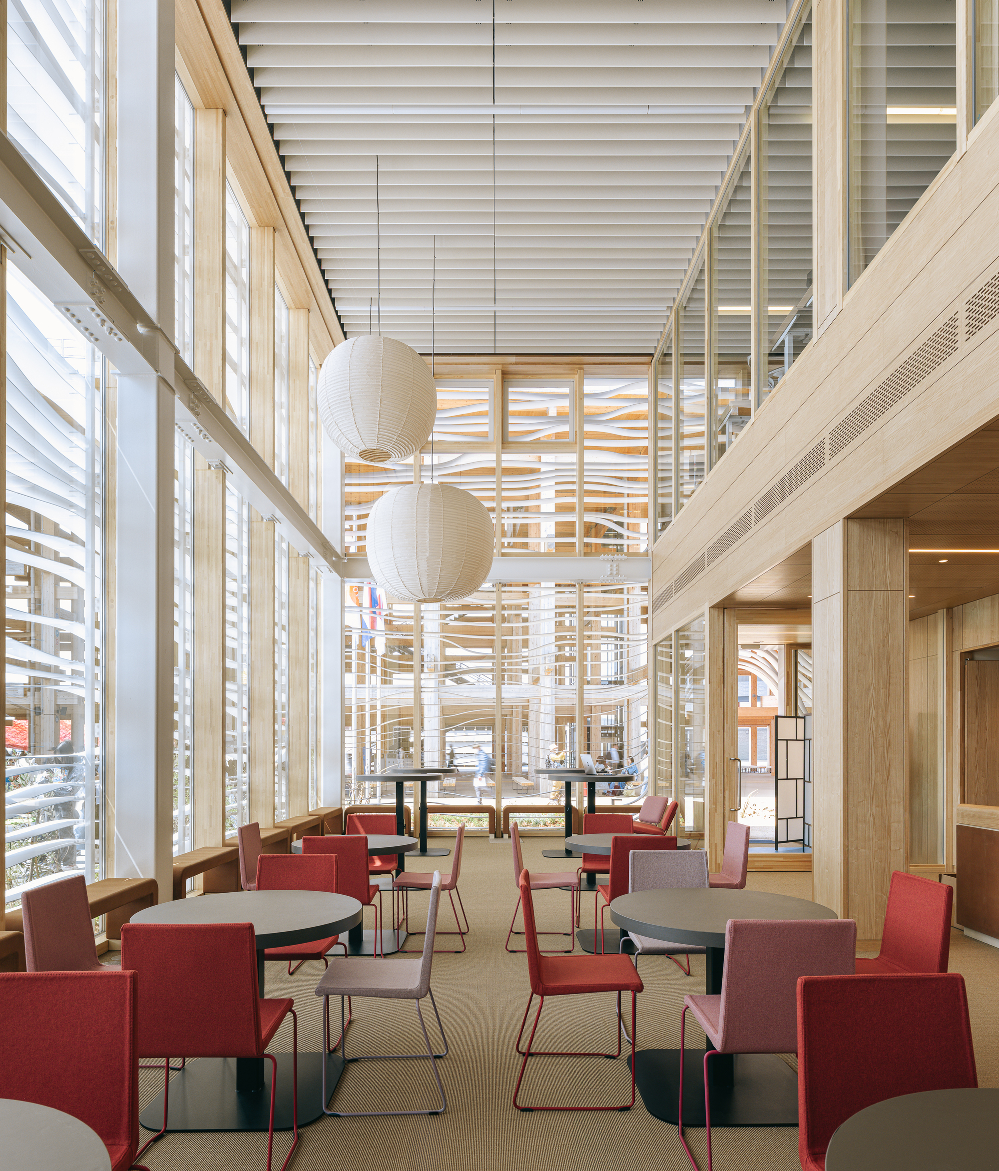 내부 공간은 유리와 목재의 조화로운 사용이 돋보인다. 높은 천장과 개방된 구조는 자연광을 최대한 활용하며, 투명함과 따뜻함이 공존하는 분위기를 조성한다. 좌석 공간에 배치된 밝은 적색 의자는 중성적인 색조의 공간에 생동감을 더하며, 대화와 교류를 위한 편안한 환경을 제공한다.