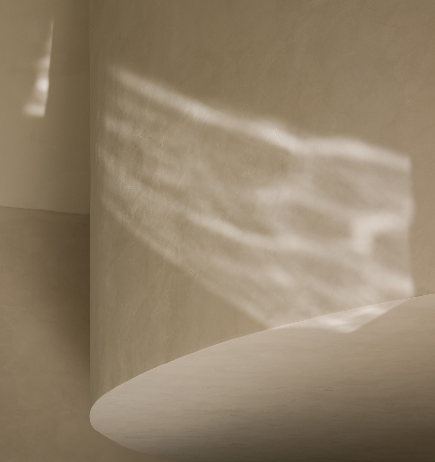 세 개의 중정이 이 집의 핵심이다. 거실과 침실의 중정은 안과 밖의 경계를 흐릿하게 만든다. 곡선 벽이 날카로운 모서리를 지우고, 분리는 부드러운 전이가 된다. 자연광이 스며드는 은밀한 공간이 생긴다. 침실과 거실 사이 세 번째 중정은 더 내밀하다. 이곳은 위층 녹음실에 빛을 보내면서 생활 공간 사이의 시각적 연결을 만든다.