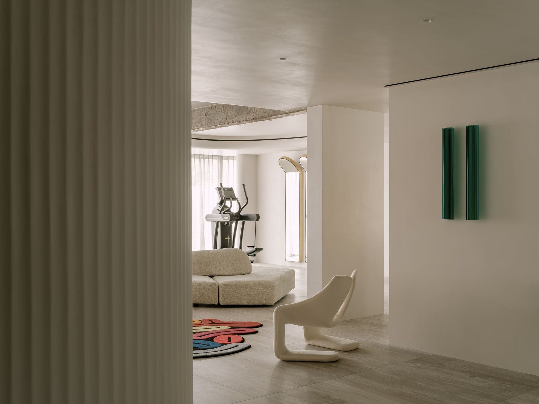 Inside, it’s a different story altogether. What was once a decorative pastiche is now a pared back environment of minimalist sophistication defined by flowing lines, textured surfaces, and a monochromatic palette. Drawing from the language of automotive aerodynamics, in what is a nod to the owner’s passion for cars, every wall, ceiling, and built-in element is shaped in continuity. Sinuous partitions, rounded corners, and curvaceous bulkheads blur the boundaries between rooms, creating a sense of motion and fluidity, while arched openings and sculptural furnishings amplify the home’s spatial rhythm.