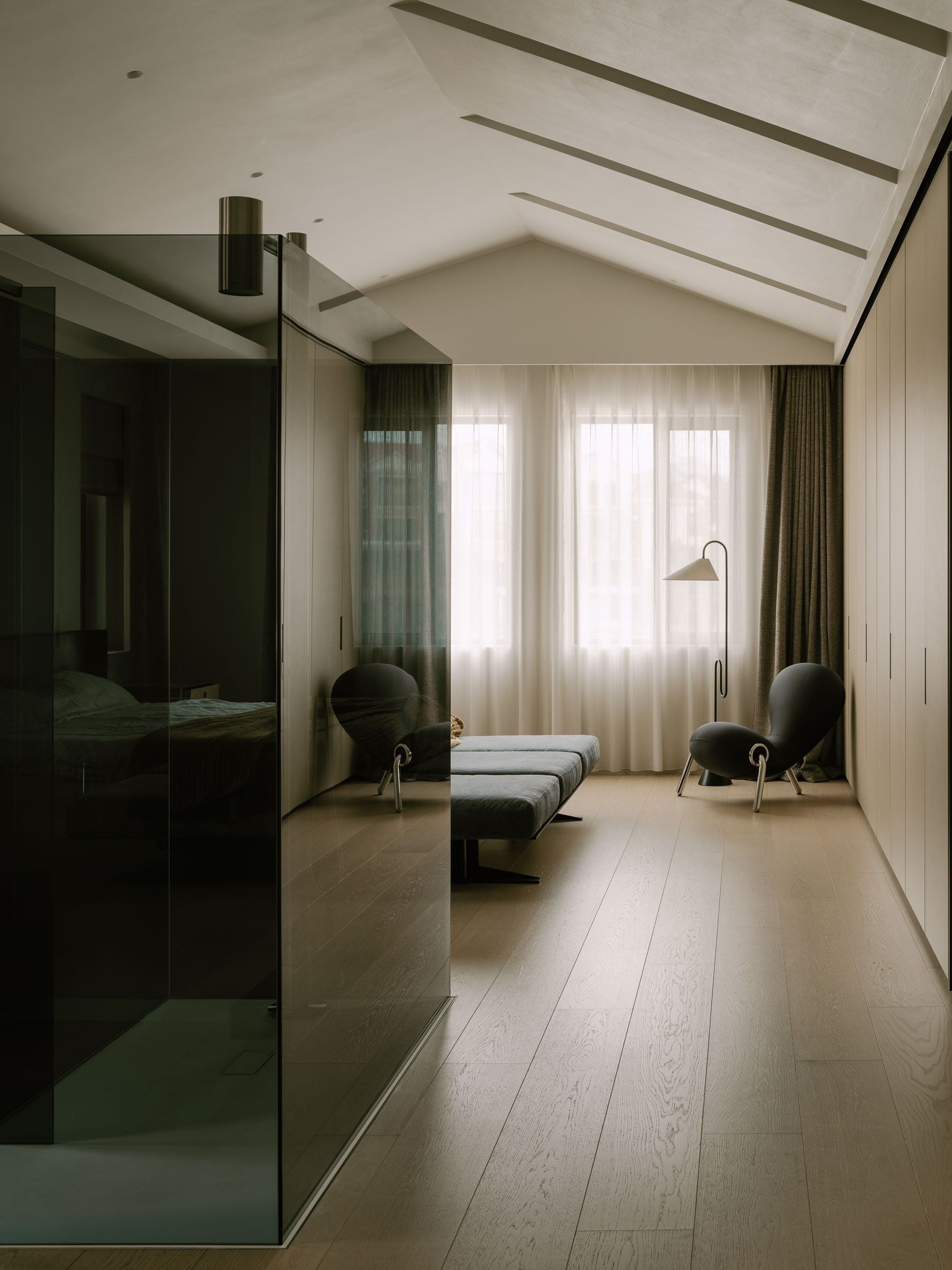 내부는 전혀 다른 이야기다. 한때 장식이 뒤섞인 공간은 이제 흐르는 선과 질감 있는 표면, 모노크롬 팔레트로 만들어진 미니멀한 세련미의 환경이 되었다. 건축주의 자동차 열정을 담아 유선형 곡선을 끌어온 이 공간에서는 모든 벽과 천장, 붙박이 요소가 끊김 없이 이어진다. 물 흐르듯 휘어진 칸막이, 둥근 모서리, 부드러운 천장 곡면이 방과 방 사이의 경계를 흐릿하게 만들며 움직임과 유동성의 감각을 만들어낸다. 아치형 개구부와 조각적 가구가 집의 공간 리듬을 더한다.