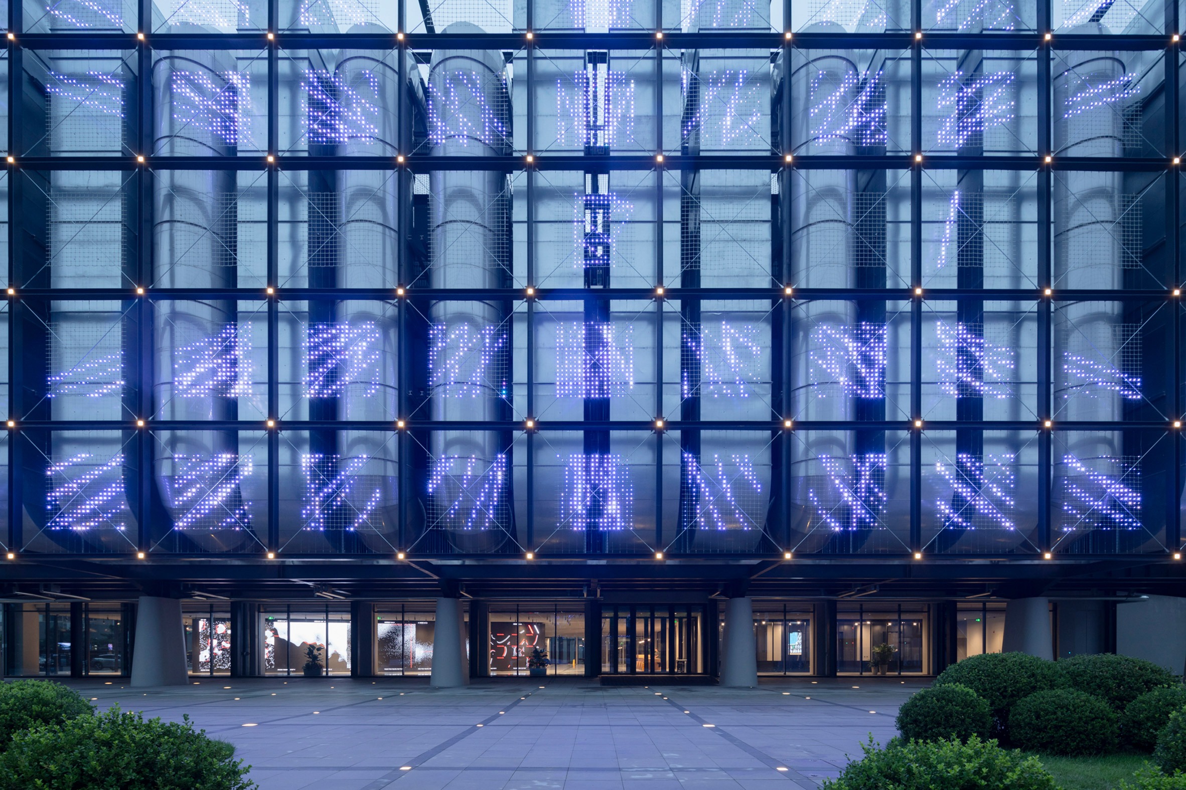 넓은 공공 광장 앞에 선 건물은 첫눈에 그 정체를 드러낸다. 거대한 원통형 냉각 덕트들이 파사드의 주인공이다. 서버의 열을 식히기 위해 필수적인 이 시설을 LLLAB은 숨기는 대신 그대로 노출시켰다. 강철 그리드가 건물 전체를 감싸고, 그 안에 LED 네팅을 채웠다. 낮 동안 건물은 투명한 격자 너머로 은빛 덕트들을 드러내며 단단한 실체로 다가온다. 밤이 되면 LED가 켜지며 건물은 완전히 다른 얼굴을 보인다. 청백색이던 빛이 뜨거운 적색으로 변모하면서 형태가 사라지며 도시의 디지털 풍경 속으로 녹아든다.