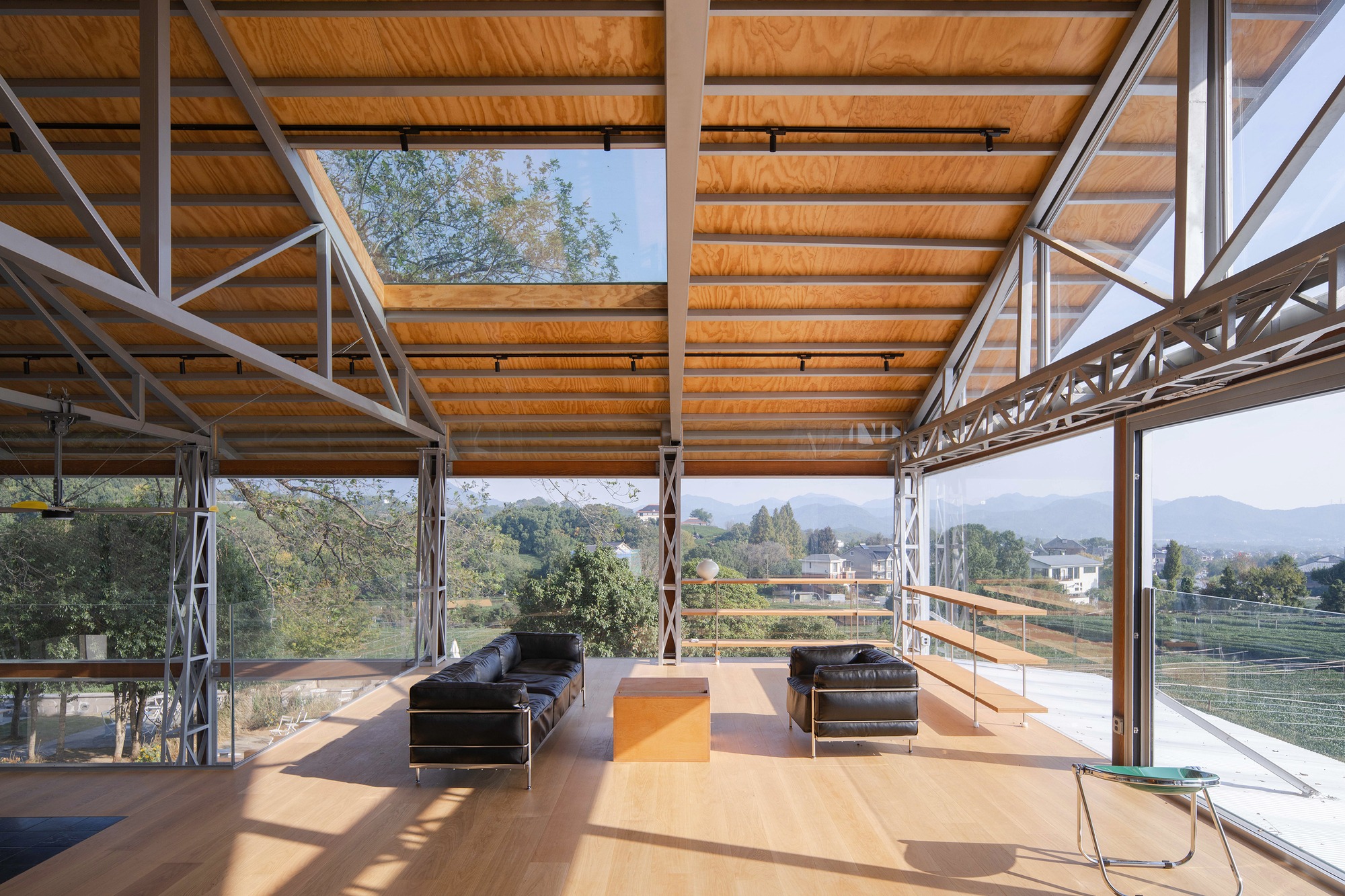 건물을 감싸고 있는 아름다운 차밭 경관은 설계의 핵심 과제가 되었다. 설계팀은 차밭 풍경을 실내로 온전히 끌어들이기 위해 최대한 투명한 시야를 확보하고자 했다. 구조 프레임과 필수적인 기능 공간의 칸막이를 제외한 나머지 벽체는 모두 투명한 유리 파티션과 폴딩 도어, 창호로 설계되었다. 건물 동쪽과 북쪽에는 금속 캔틸레버 처마를 설치하여 회랑을 만들었다. 이 중간 영역은 실내와 실외를 자연스럽게 연결한다. 동시에 식당의 좌석도 늘려주며, 공간 활용도를 높인다.