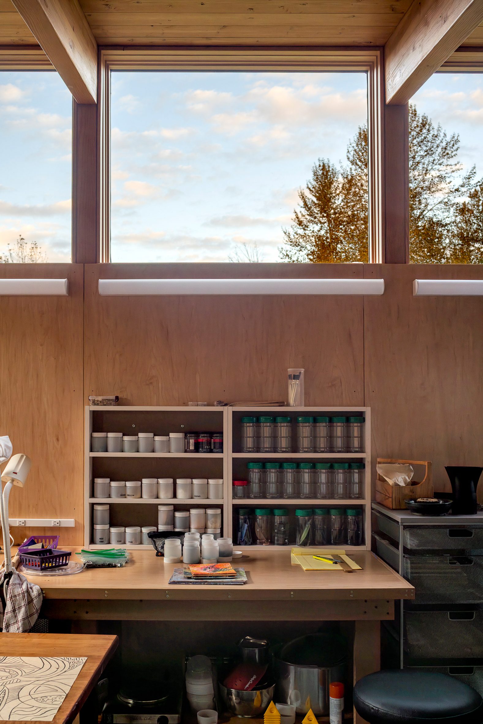 The shed roof lifts up for clerestory windows on the north side that draw even, diffused light into the studios.