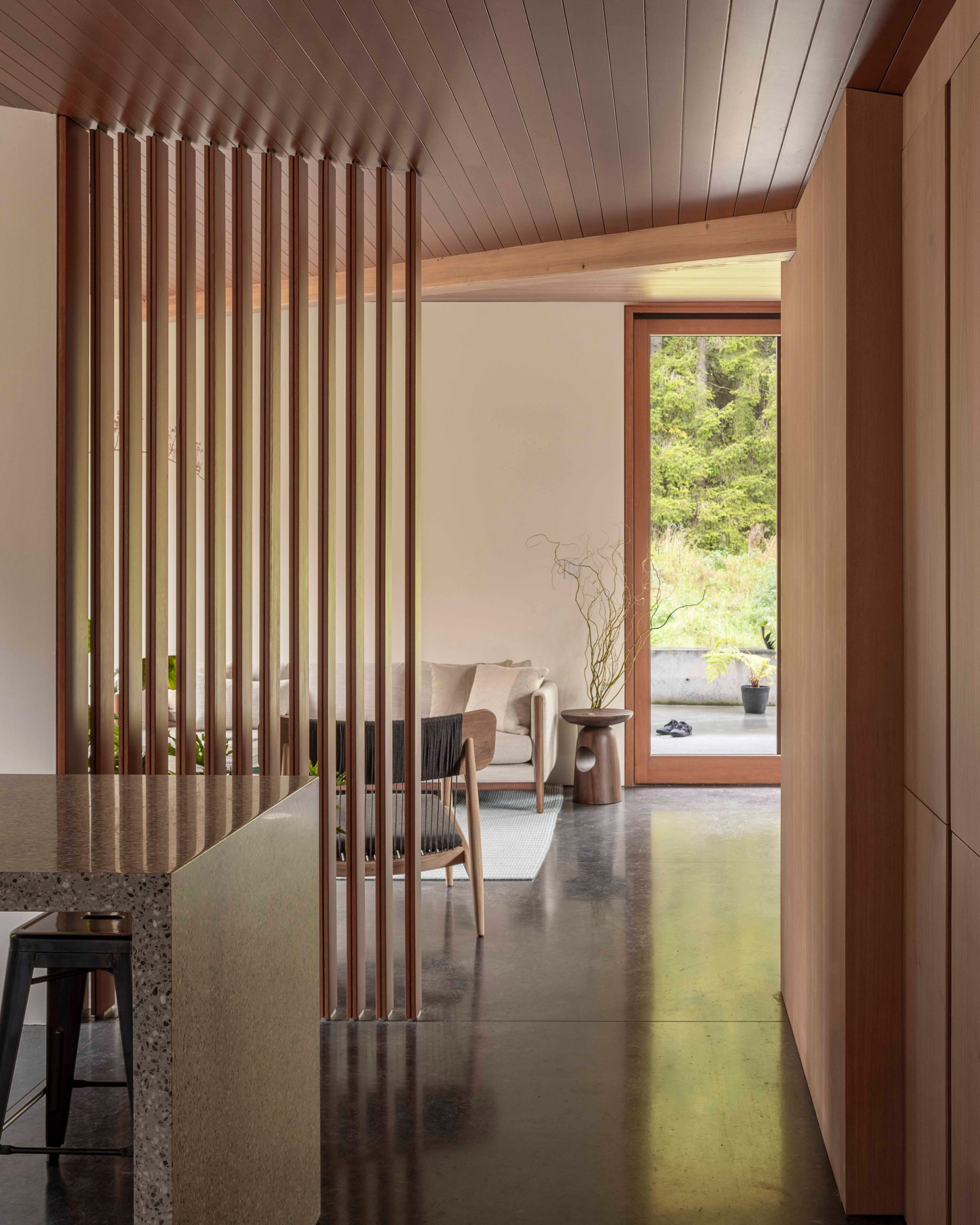 "Locally sourced fir and cedar complement terrazzo and concrete surfaces, while reddish brown soffits and a vivid blue kitchen wall introduce a playful note."