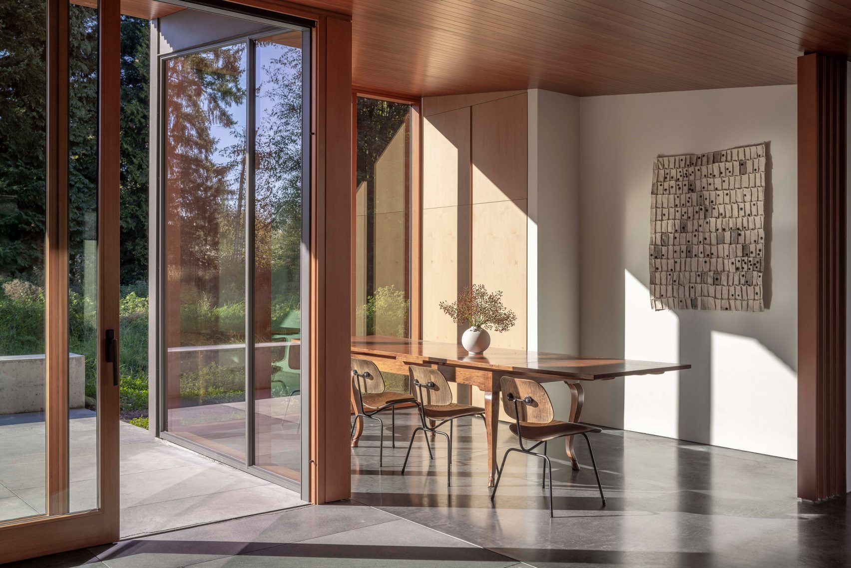 The single-level house is designed for ageing-in place and multigenerational living with wide doorways, flush thresholds and sandblasted concrete floors that were cast-in-place with hydronic radiant heating.