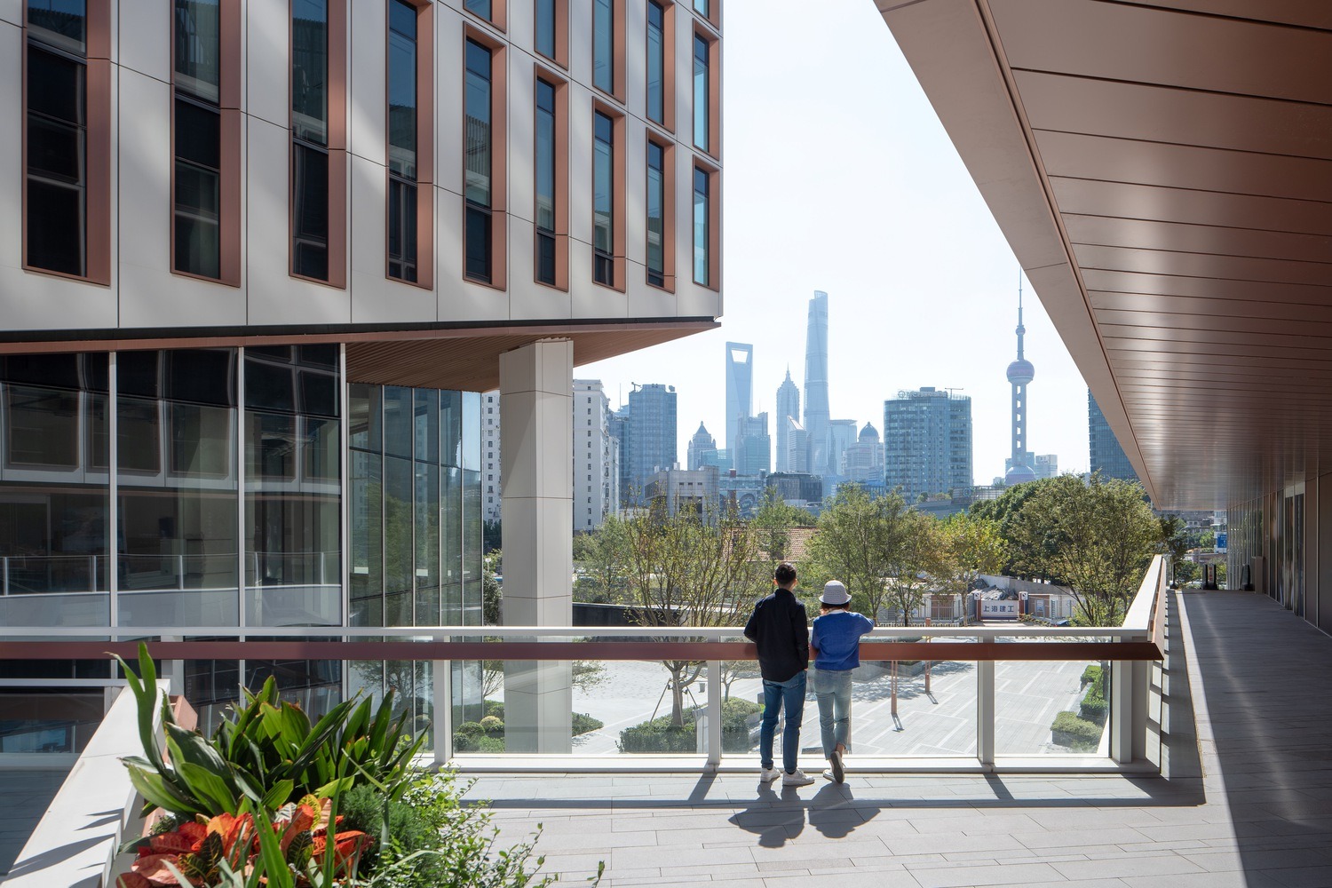 Rather than placing a singular tower at the center of the site, two office volumes are shifted to the perimeter, unlocking a 3,000-square meter public plaza at its core. This decentralized massing strategy establishes a porous urban living room within a dense business district and strengthens pedestrian continuity across surrounding blocks. Elevated volumes create shaded gray spaces at ground level, softening the transition between private development and public life. An inverted roof gesture reinterprets traditional pitched forms as an "outdoor ceiling," mediating between contemporary vertical density and Shanghai's architectural memory.