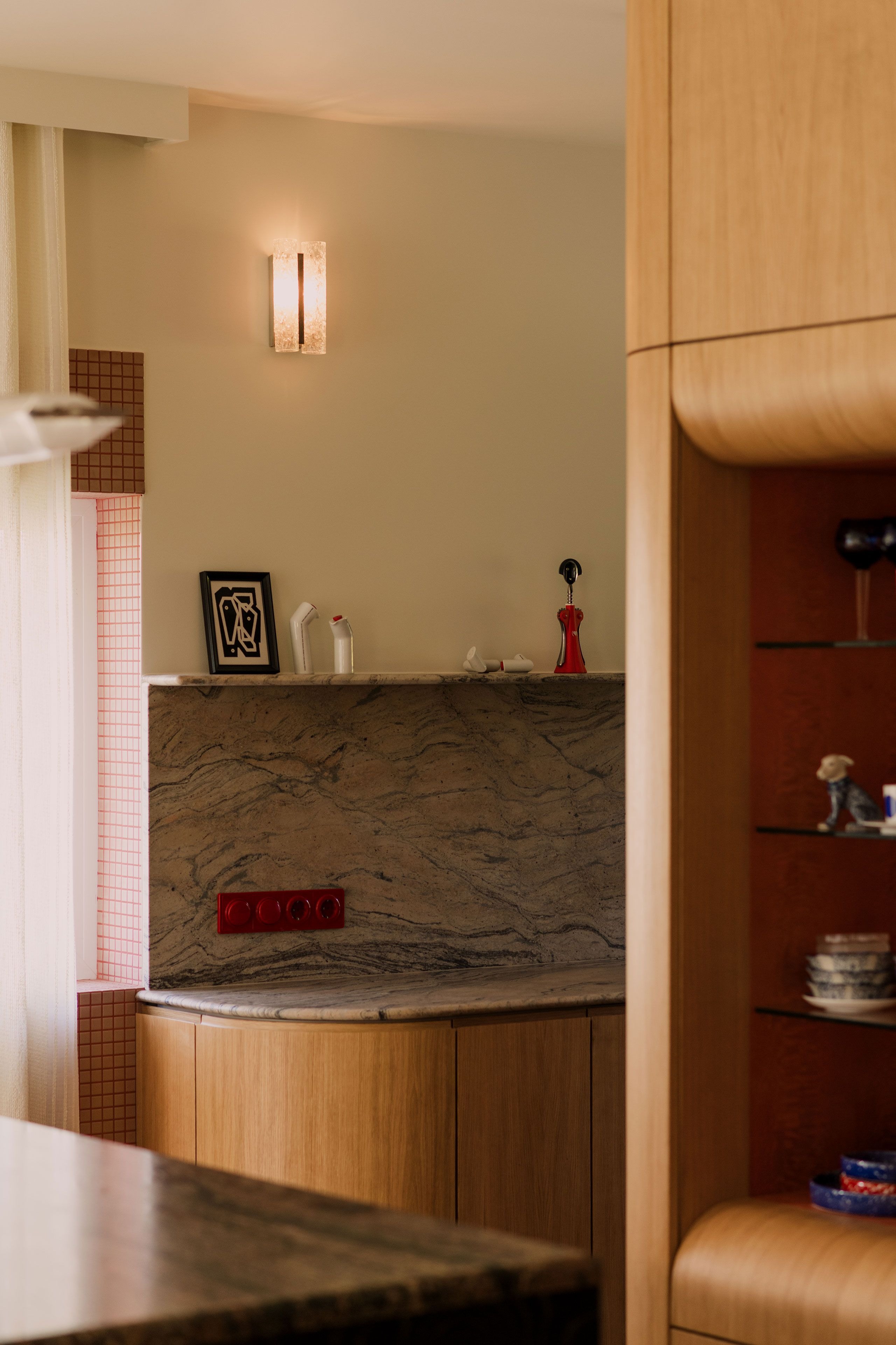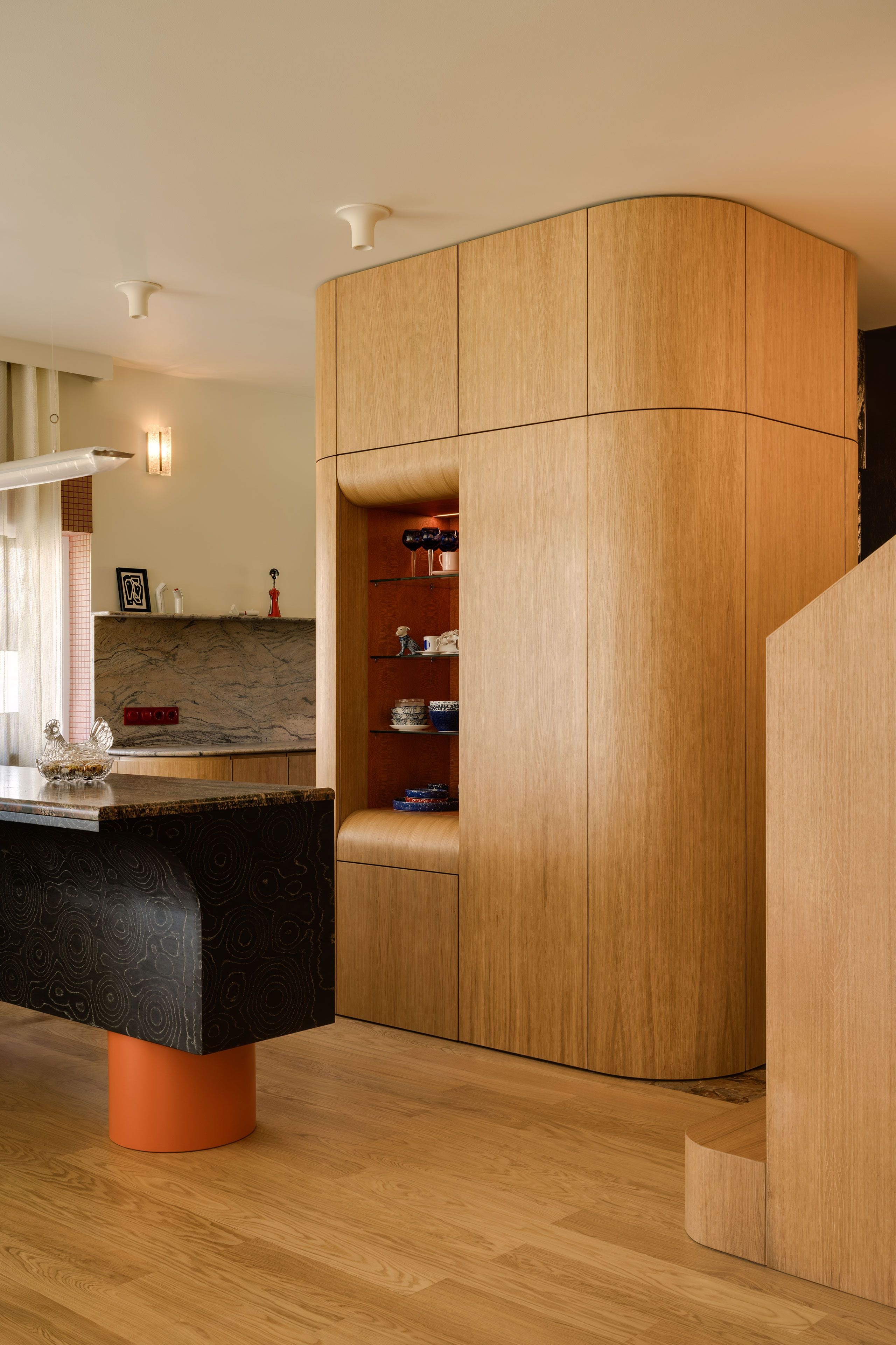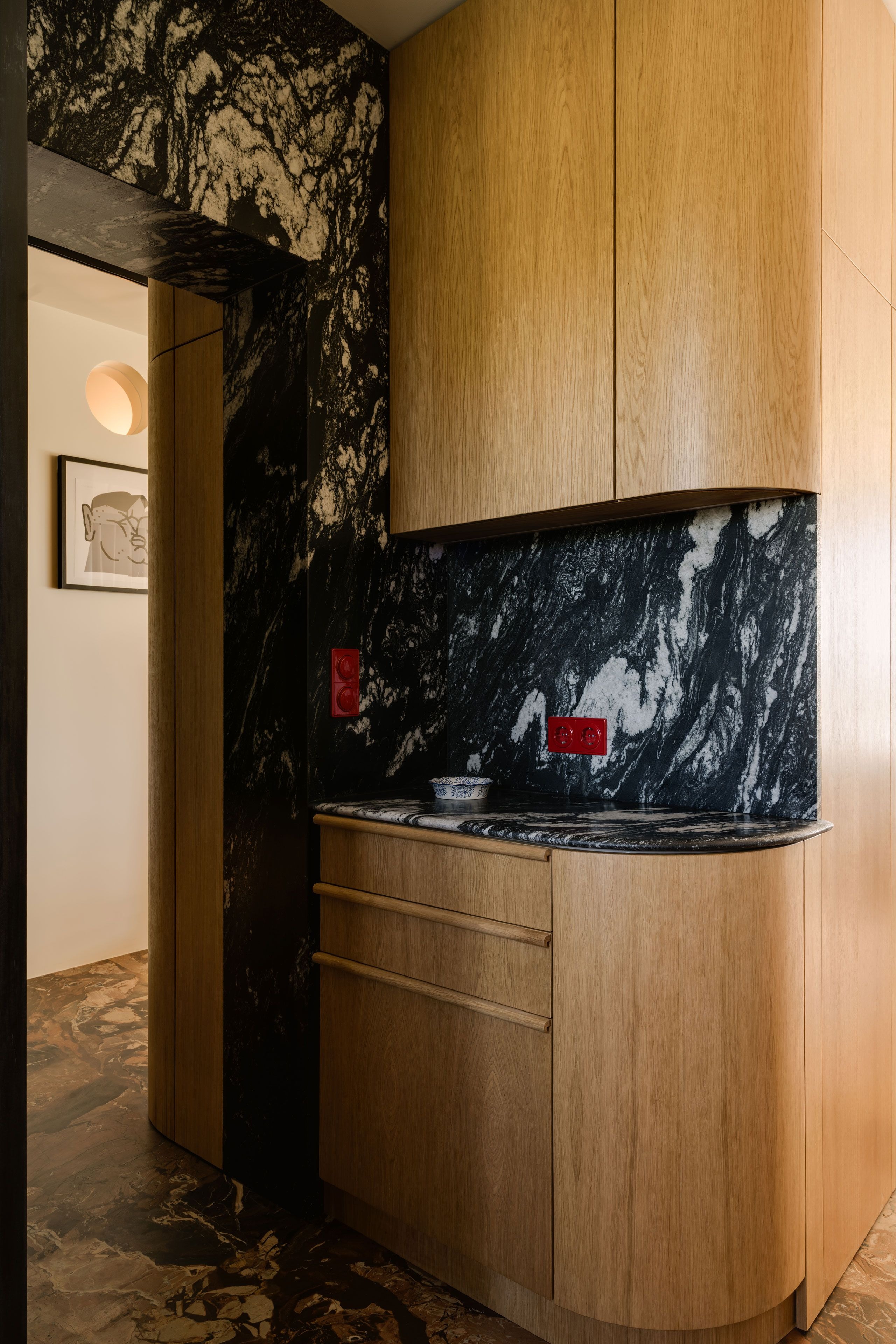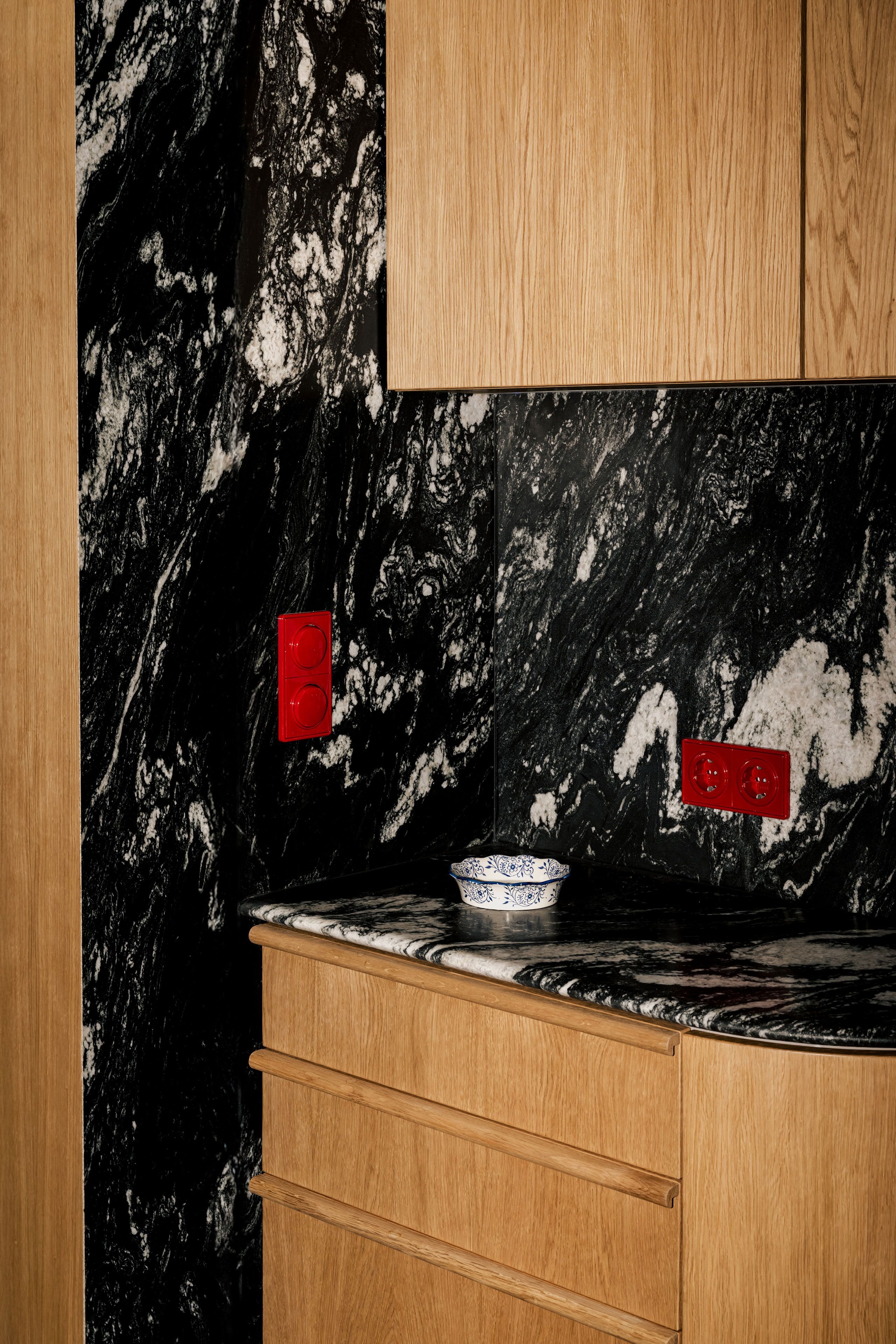With its gently rounded corners, this central volume establishes a soft architectural rhythm that is echoed in a series of curved elements throughout the interior. Featuring a recessed alcove lined with a decorative veneer and a compact coffee station wrapped in dramatically veined black-and white marble, it also sets the tone for a palette that moves between warm timber surfaces and graphic accents. Nearby, oak cabinetry, again featuring softly curved edges is paired with worktops and a backsplash in pinkish Prada Gold granite, while vivid red switches punctuate the composition like precise graphic marks—a subtle nod to the owners’ profession. A curvaceous stainless-steel extractor casing, custom-designed by Marcin, playfully introduces an industrial note.