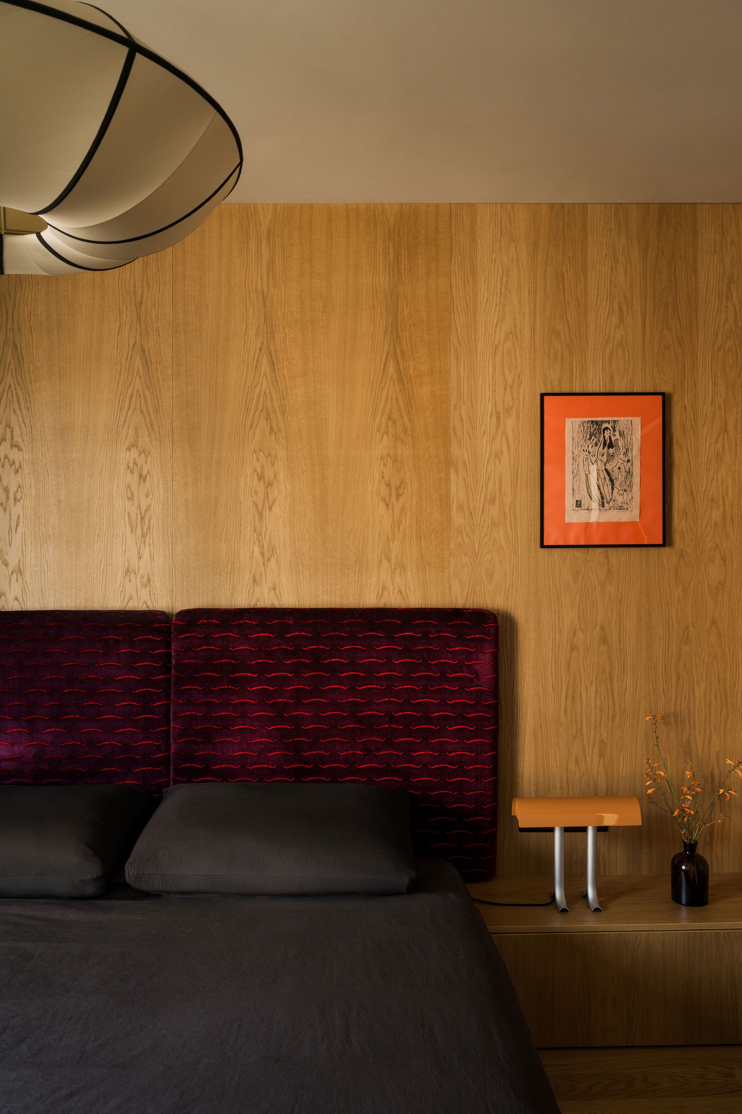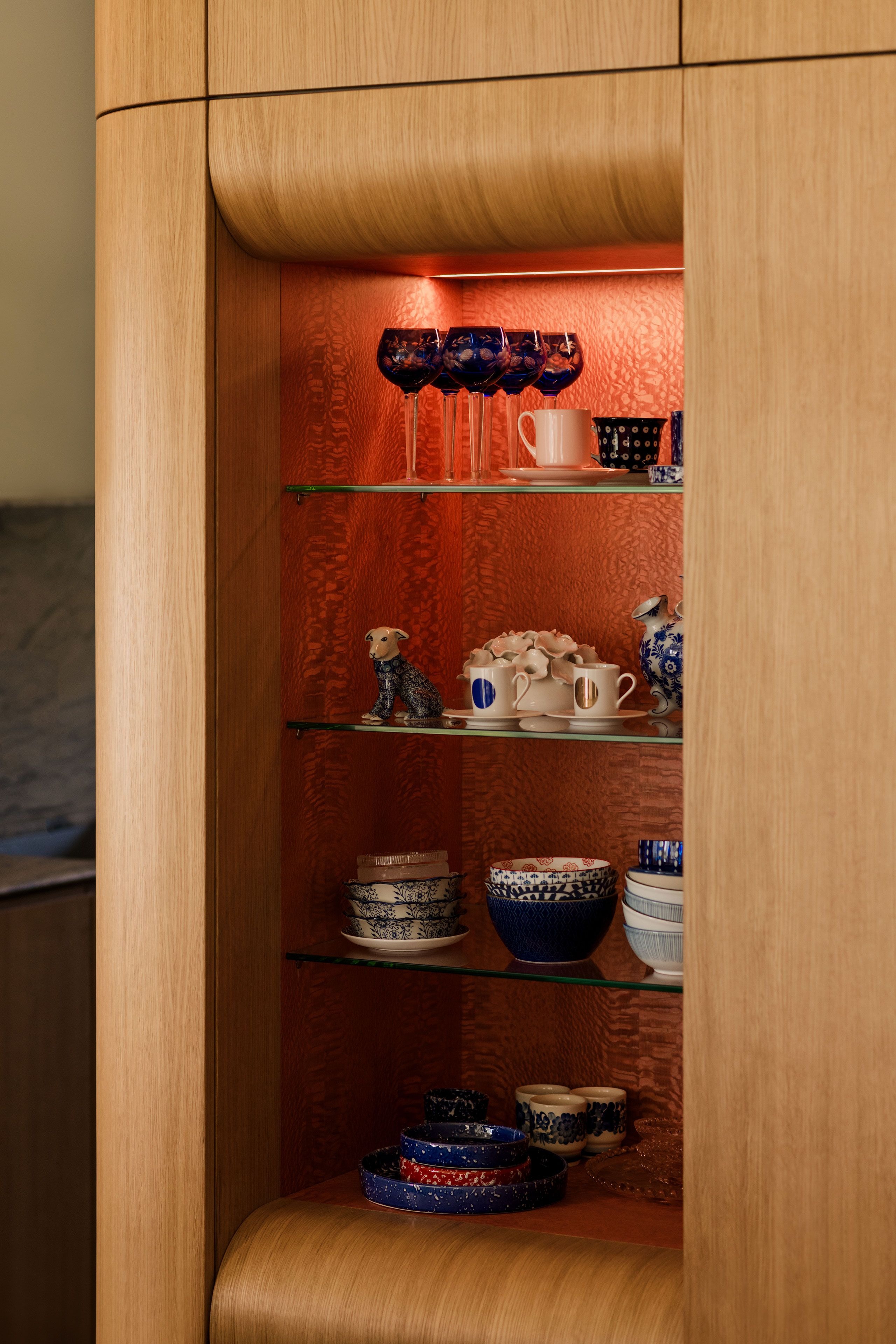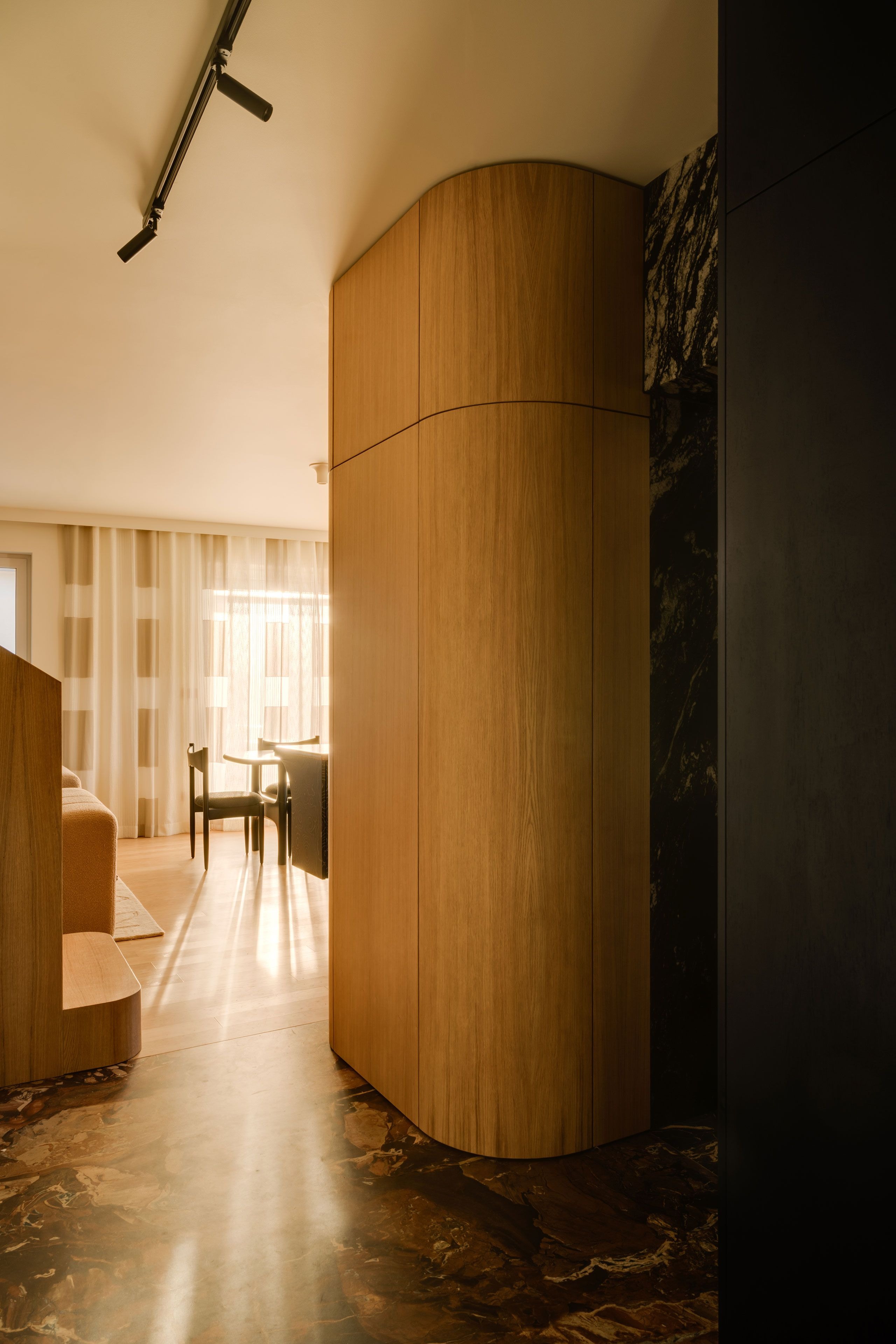 With its gently rounded corners, this central volume establishes a soft architectural rhythm that is echoed in a series of curved elements throughout the interior. Featuring a recessed alcove lined with a decorative veneer and a compact coffee station wrapped in dramatically veined black-and white marble, it also sets the tone for a palette that moves between warm timber surfaces and graphic accents. Nearby, oak cabinetry, again featuring softly curved edges is paired with worktops and a backsplash in pinkish Prada Gold granite, while vivid red switches punctuate the composition like precise graphic marks—a subtle nod to the owners’ profession. A curvaceous stainless-steel extractor casing, custom-designed by Marcin, playfully introduces an industrial note.