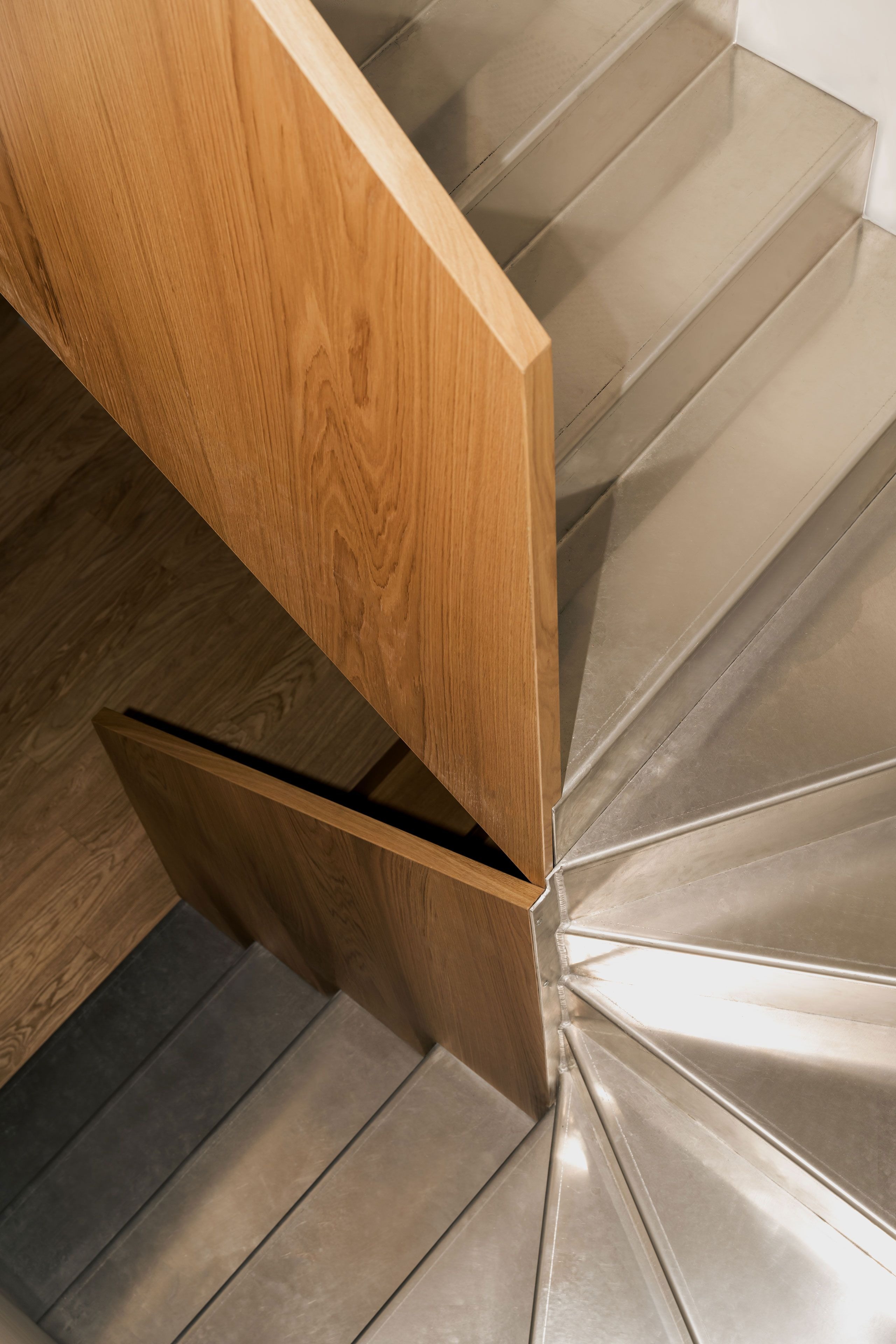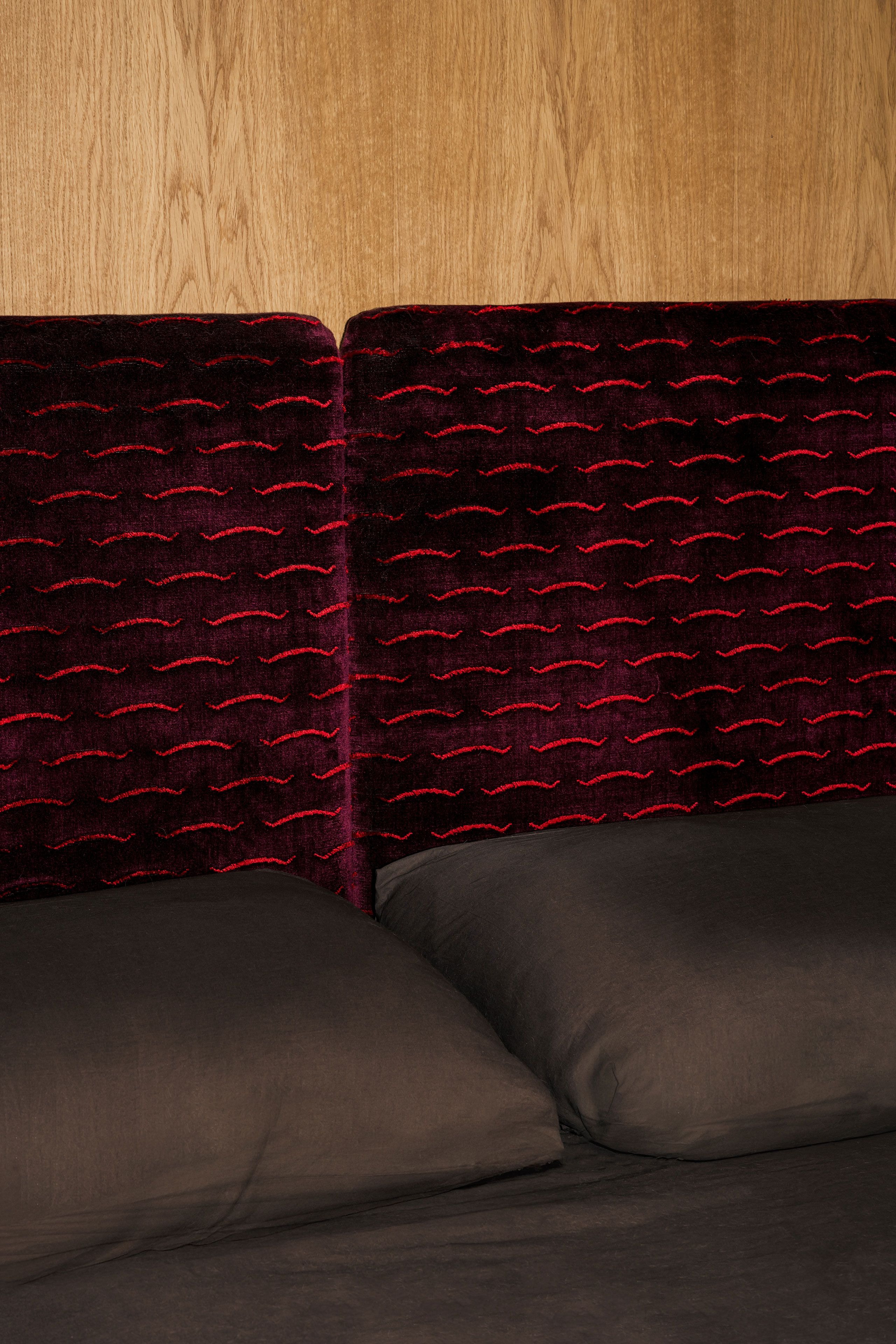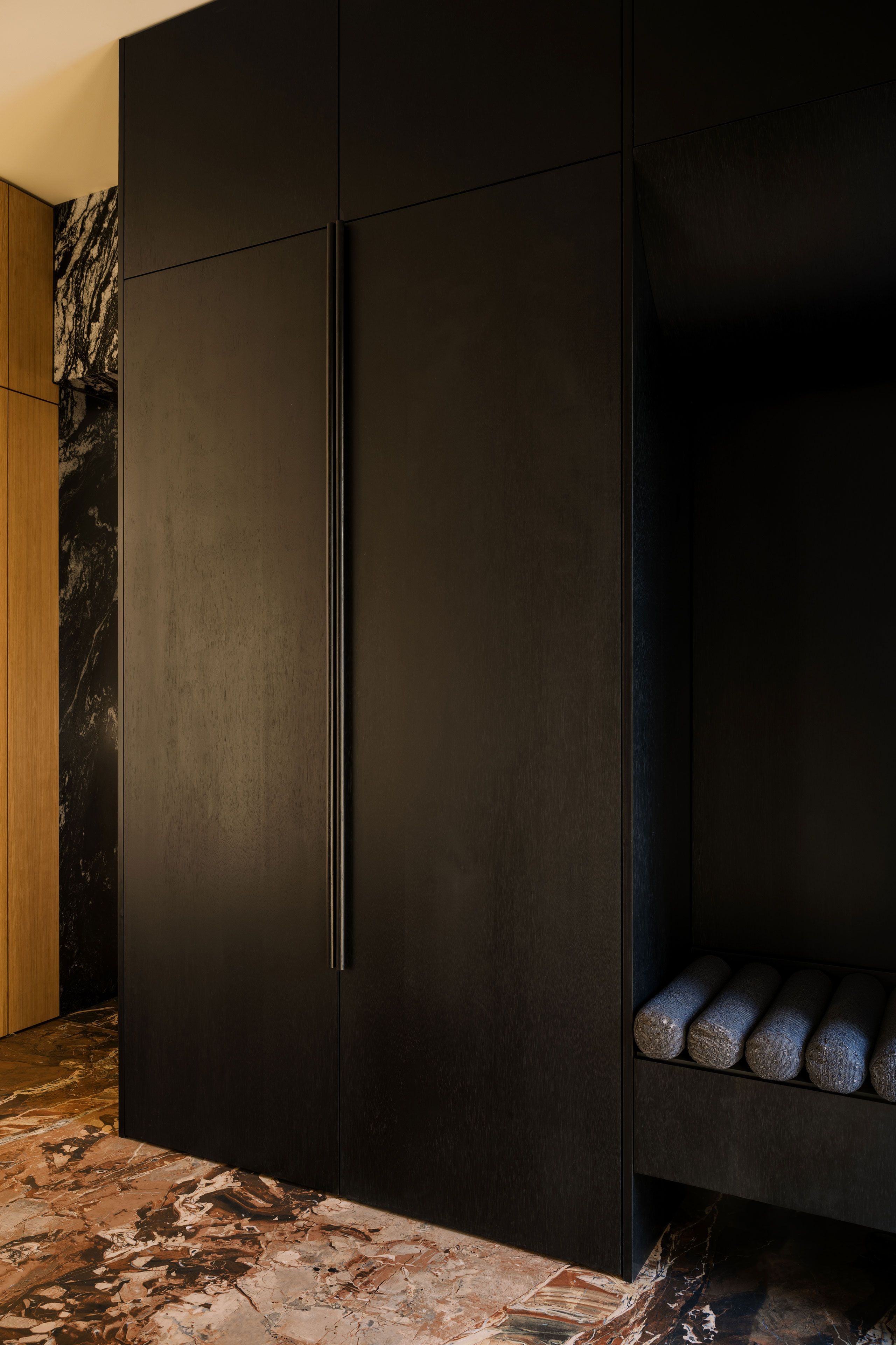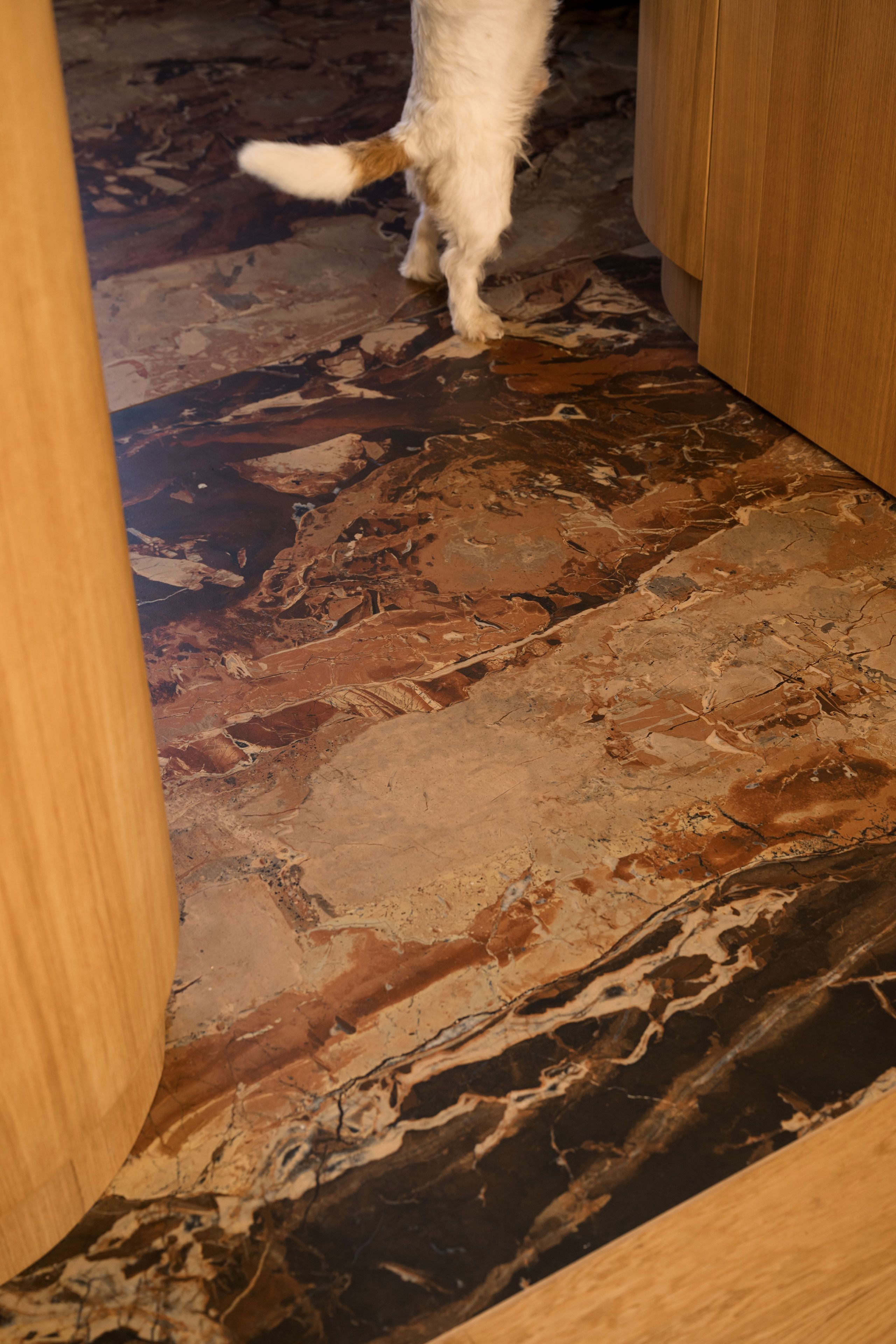 With its gently rounded corners, this central volume establishes a soft architectural rhythm that is echoed in a series of curved elements throughout the interior. Featuring a recessed alcove lined with a decorative veneer and a compact coffee station wrapped in dramatically veined black-and white marble, it also sets the tone for a palette that moves between warm timber surfaces and graphic accents. Nearby, oak cabinetry, again featuring softly curved edges is paired with worktops and a backsplash in pinkish Prada Gold granite, while vivid red switches punctuate the composition like precise graphic marks—a subtle nod to the owners’ profession. A curvaceous stainless-steel extractor casing, custom-designed by Marcin, playfully introduces an industrial note.