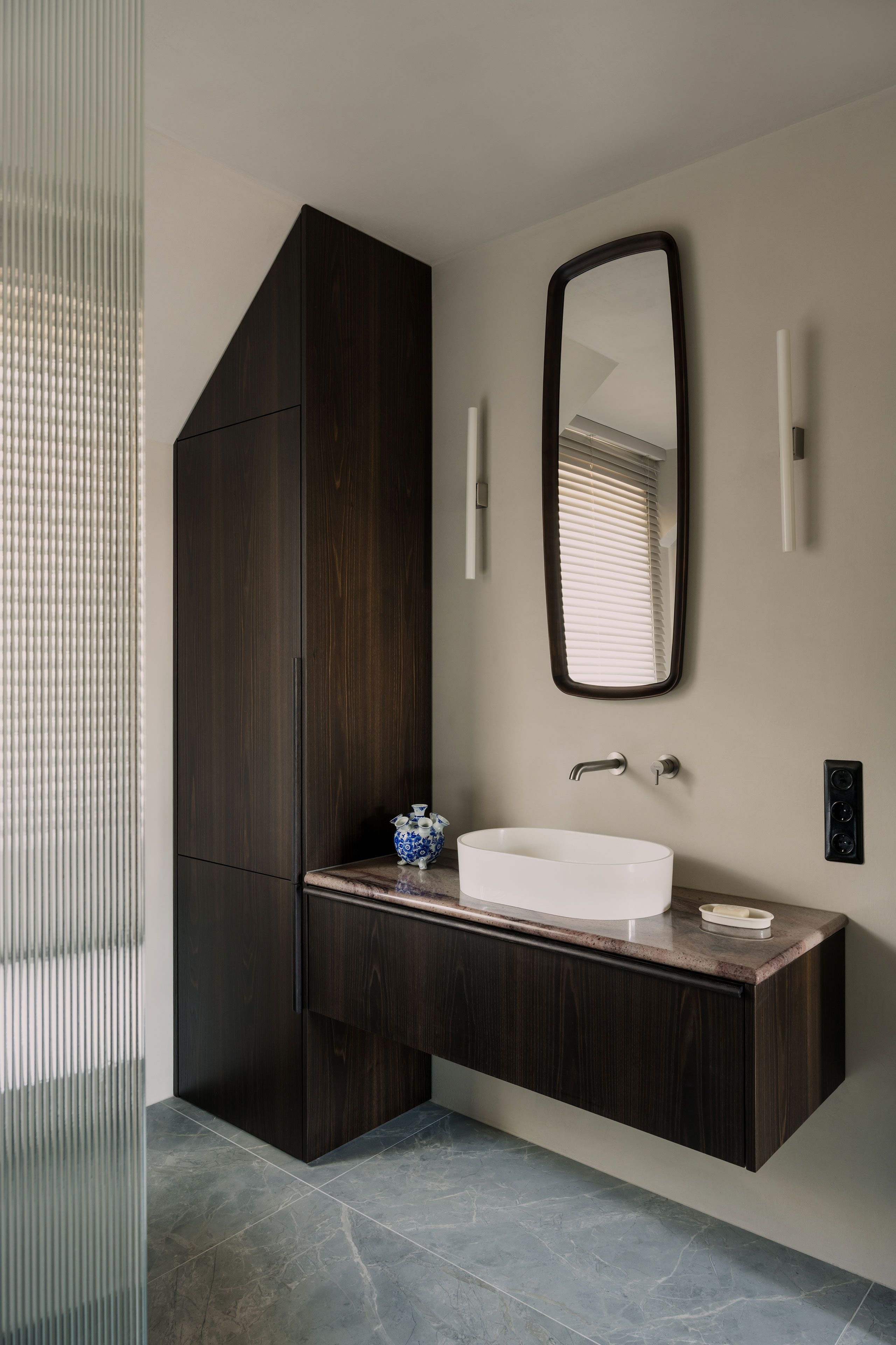 Moving upstairs, the atmosphere gradually shifts toward a more centred sense of calm where oak surfaces define the bedroom and dressing area combined with soft textiles create a subdued retreat. The upstairs bathroom adopts an equally restrained palette with smoked-oak joinery, a textured glass shower screen shaped into a gentle arch, and a vintage wall lamp that casts a warm glow.