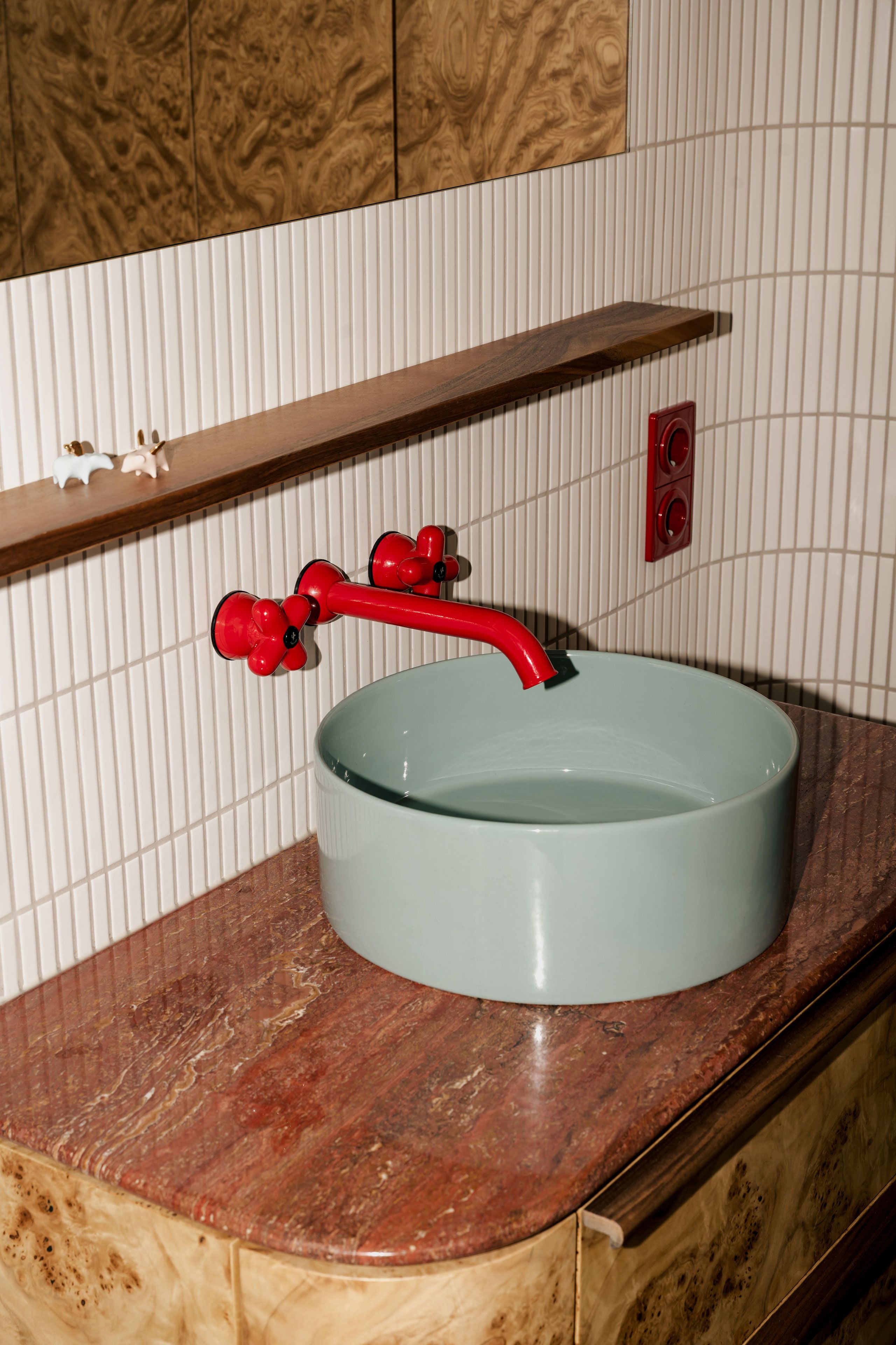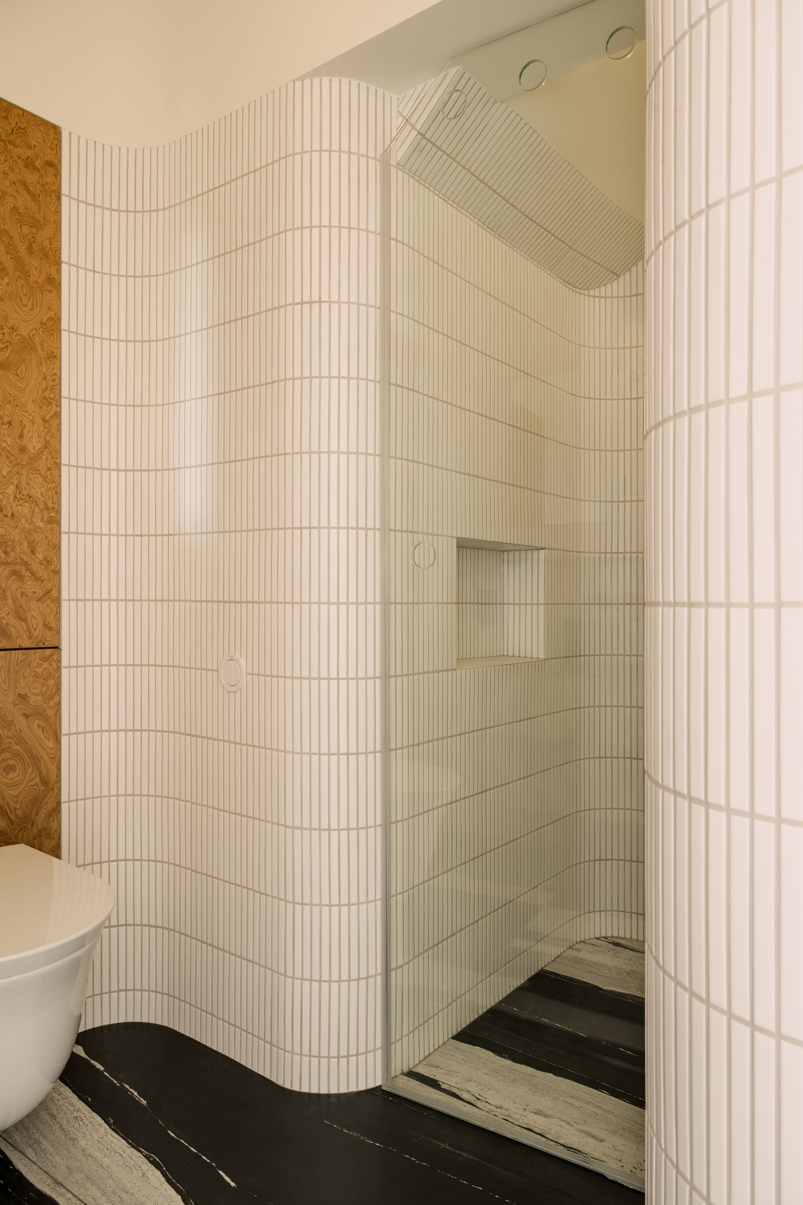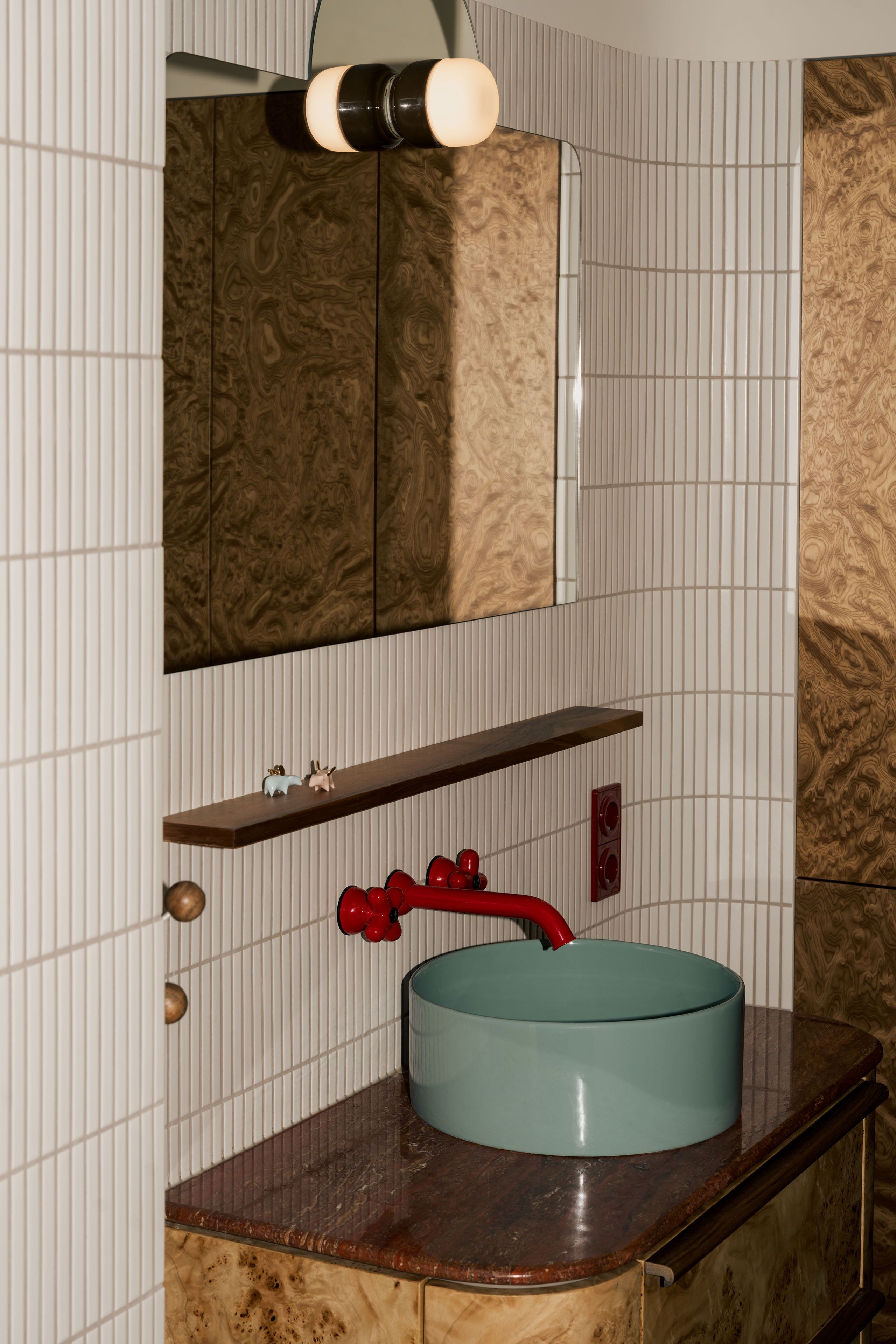 Even the compact ground floor bathroom becomes an exercise in spatial invention and playful material contrasts. Wrapped in an undulating wall of white vertical tiles, the windowless space is animated by burr wood veneer cabinetry, a mint-toned basin and red tap fittings, with a black and white stone flooring adding to the design’s zany flair.