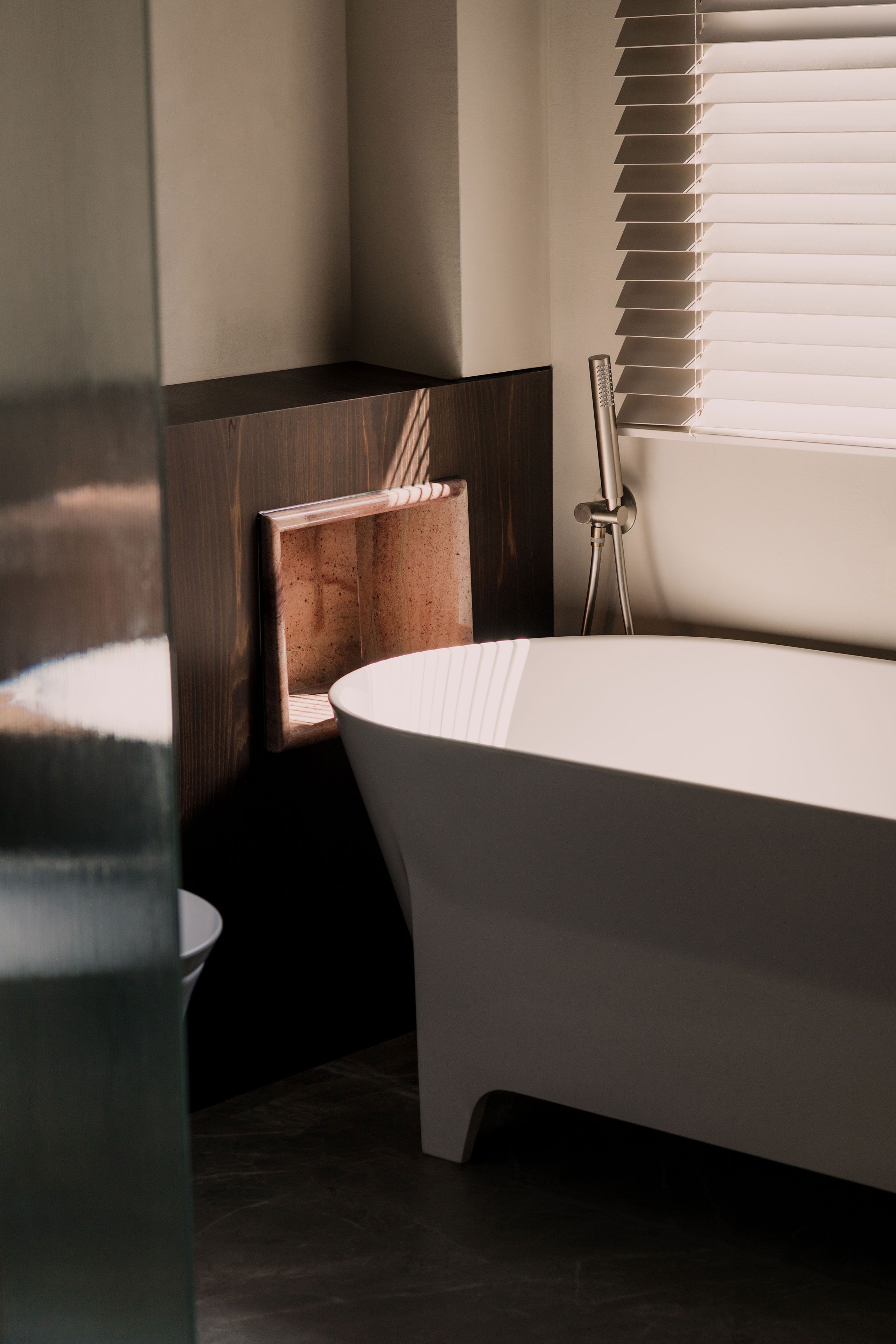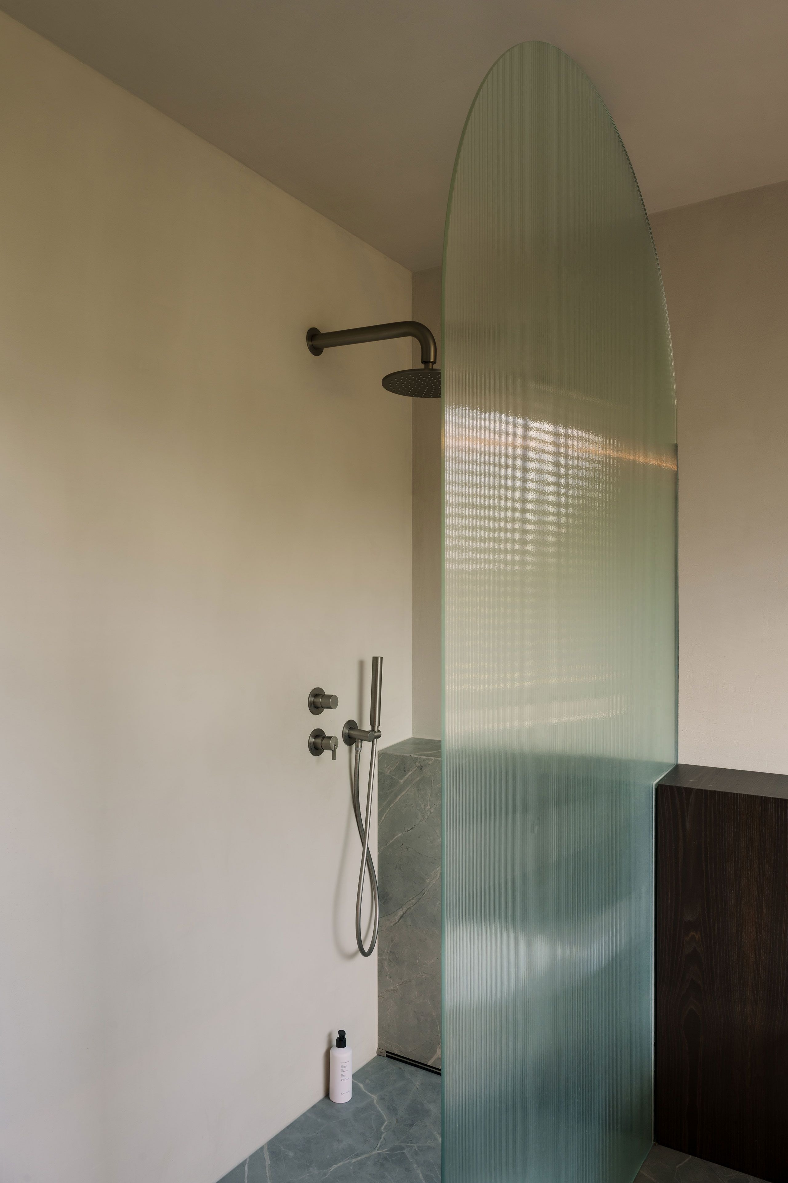 참나무로 짠 구조적인 계단을 밟고 위층으로 올라가면 공간의 분위기는 한결 차분하고 온화한 휴식처로 바뀝니다. 참나무 표면이 침실과 드레스룸의 바탕을 이루고 그 위로 부드러운 직물들이 포개져 아늑함을 완성합니다. 2층 욕실 역시 짙게 그을린 훈연 참나무 가구와 아치 형태로 부드럽게 다듬은 질감 있는 유리 샤워 스크린을 활용했습니다. 여기에 따뜻한 빛을 머금은 빈티지 벽 조명을 더해 1층보다 한층 덜어낸 색감과 차분한 질감을 유지합니다.
