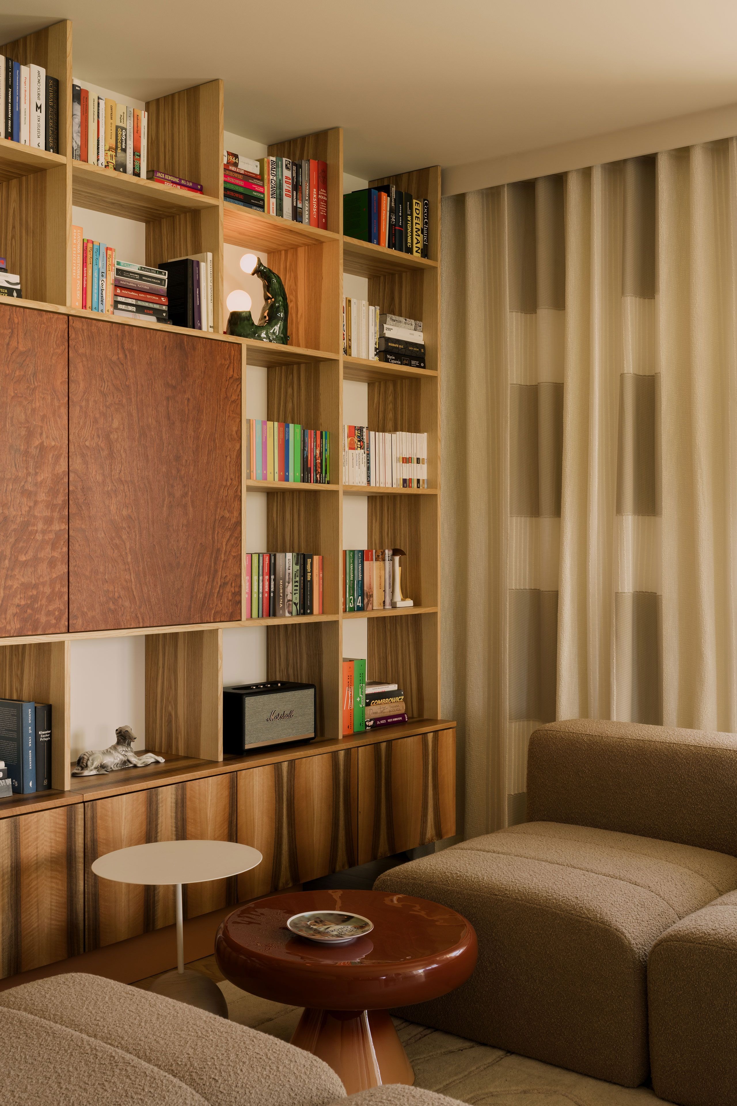 In the adjacent seating area, a wall spanning bookcase provides both storage and visual rhythm. Undoubtedly, one of the most refined interior elements in the house, its lower section is crafted from walnut, its vertical divisions from tinted ash, and the drawer fronts from exotic bubinga wood. The composition accommodates the couple’s extensive book collection while discreetly concealing the television, maintaining the room’s calm visual order.