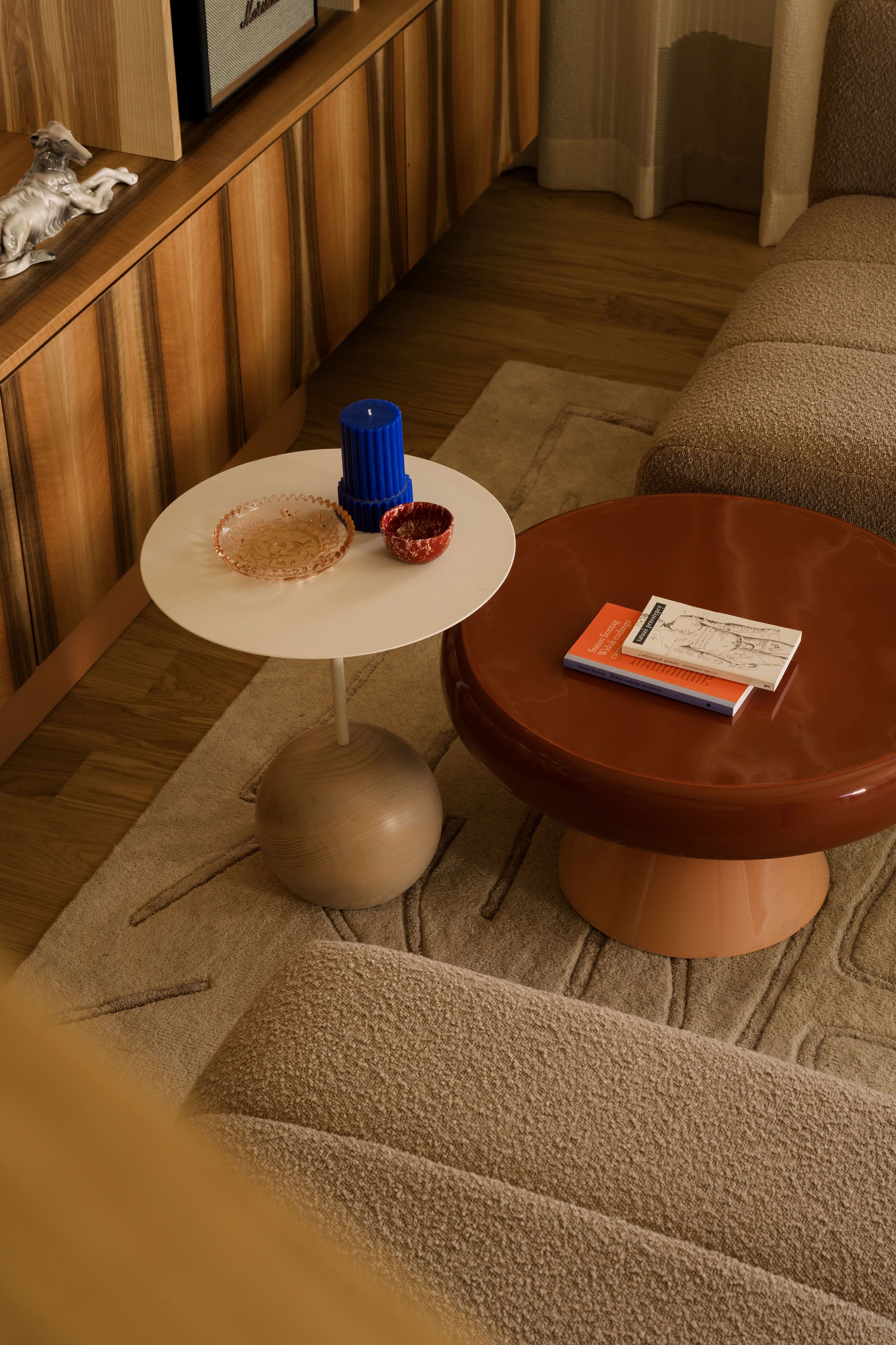 1층에서 단연 시선을 사로잡는 요소는 조각품을 닮은 주방 아일랜드입니다. 선명한 오렌지색 원통이 아일랜드 식탁을 든든하게 받치고 있습니다. 몸체는 소용돌이치는 그래픽 패턴의 검은색 베니어로 둘렀고, 상판은 주방 조리대와 같은 질감의 돌을 얹어 마무리했습니다. 그 위로는 잉고 마우러의 둥근 펜던트 조명인 블로우 미 업이 가볍게 떠 있습니다. 이 조명은 아래에 놓인 묵직한 소재들과 대비를 이루며 자유롭고 상징적인 매력을 뽐냅니다.