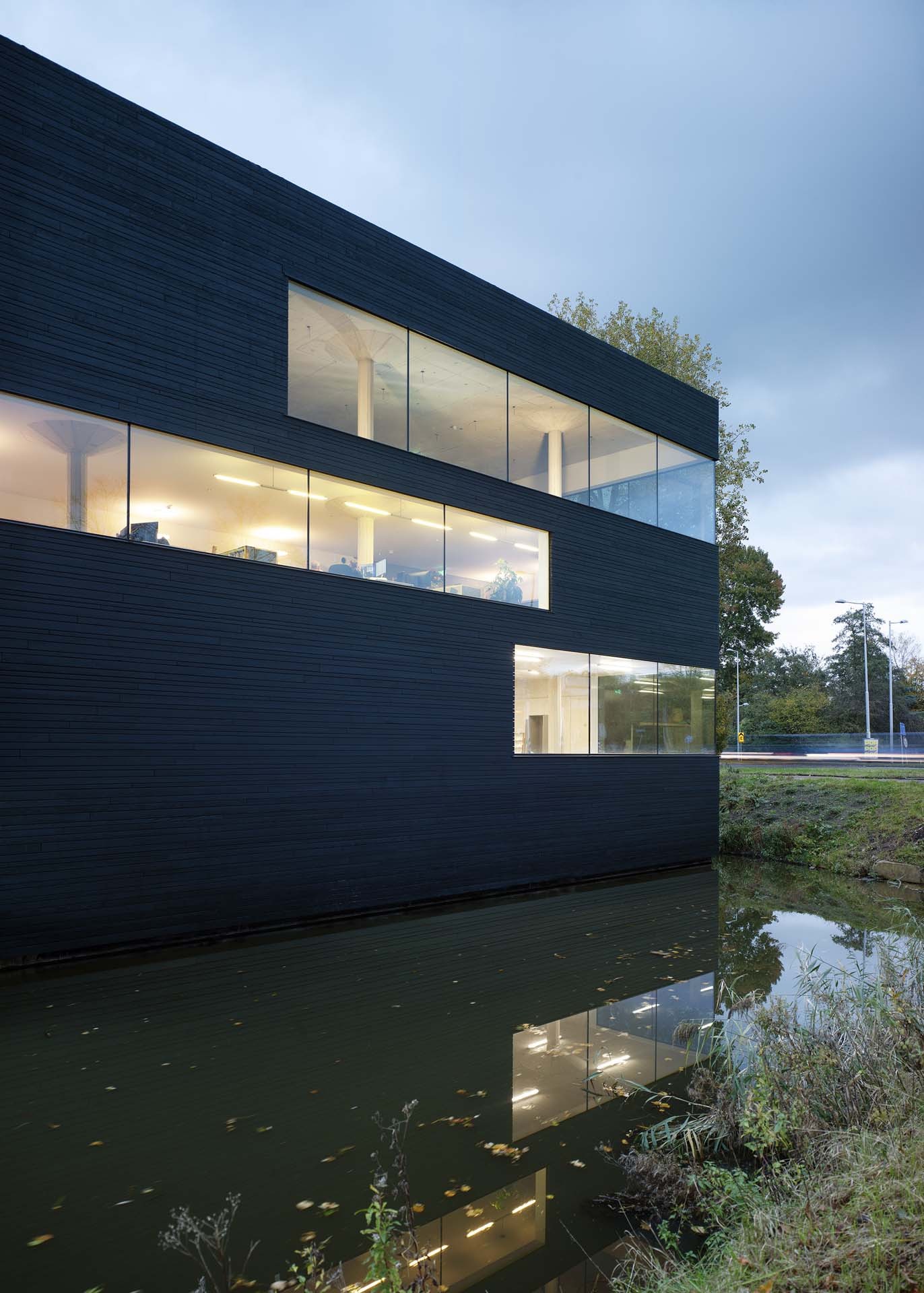 Terbregsehof 11 is the new headquarters office, workshop and showroom for interior design and build company 13Speciaal. At a corner in the canal, the building is located in a kind of ‘no man’s land’ beside a highway crossroad on the outskirts of Rotterdam. The building replaces a abandoned house that was bought by the client in 2016 and had been squatted for years. The building stands directly in the water on two sides, with its exterior forming the retaining walls of the canal. The design comprises a ground floor workshop, first floor office and a showroom to exhibit the company’s work that has expansive views on the third floor. Like a timber Stanley Kubrick monolith with openings punched in for the sun to shine through, the building overlooks the busy traffic intersection as well as the wooded park Kralingse Bos diagonally opposite.
