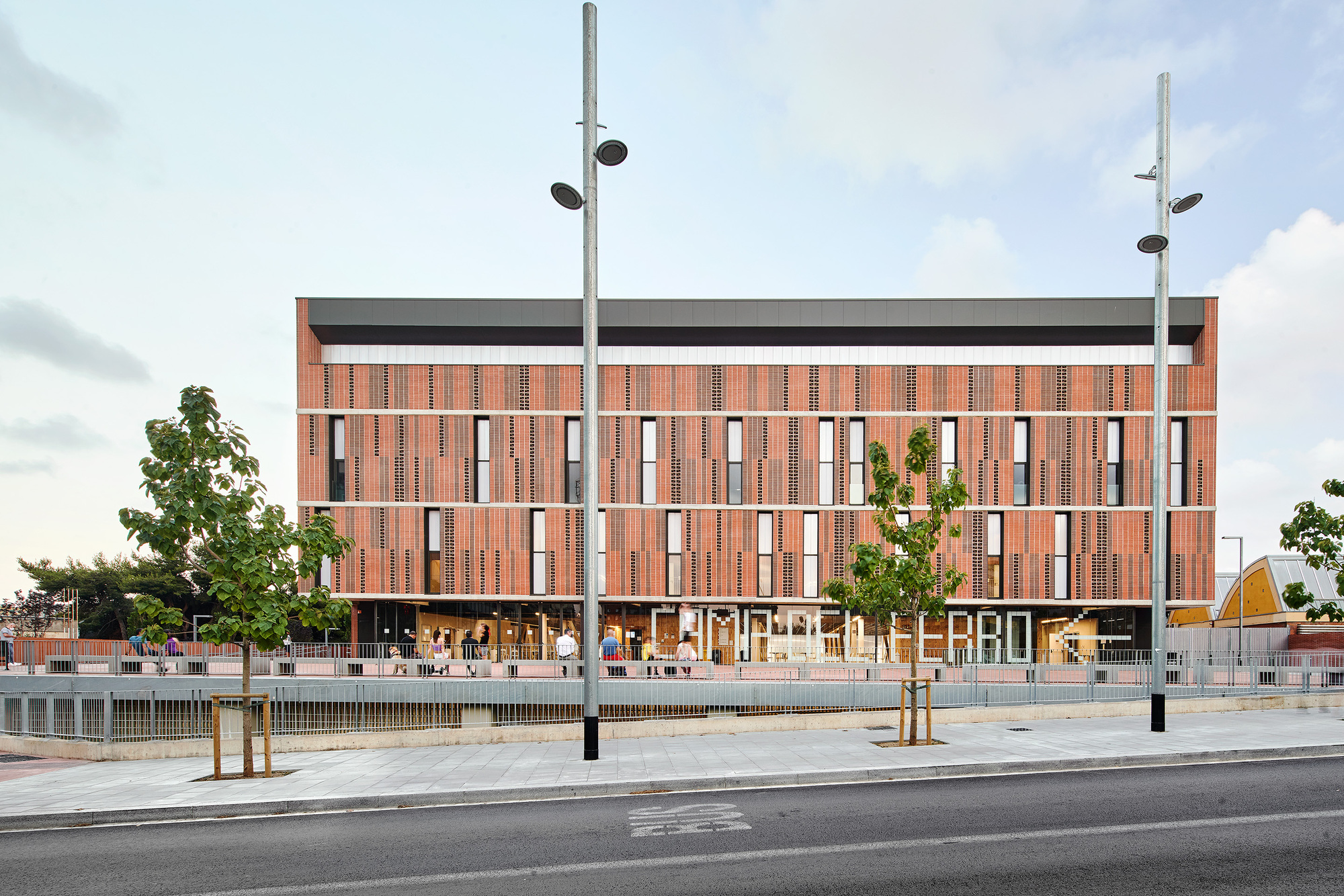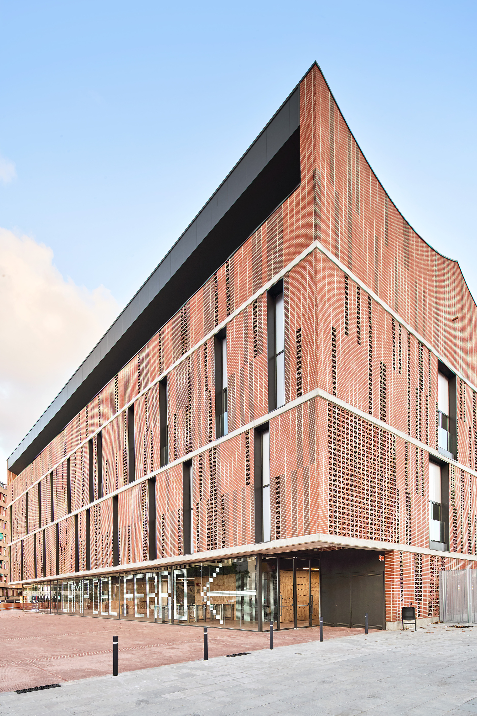 The used construction process arises from the understanding and recovery of the local traditions through the use of materials such as ceramics, very common in old factories, warehouses, workshops and neighbouring industrial buildings. Following the criteria of austerity of resources and means, the construction system itself constitutes in a large part of the building itself and its final finish, avoiding overlapping elements. As in the facades, exposed materials ensure good ageing and long duration. With the aim of lightening the building on all its facades, opaque, translucent or transparent voids and bodies alternate, using ceramic pieces of different formats and colours.
