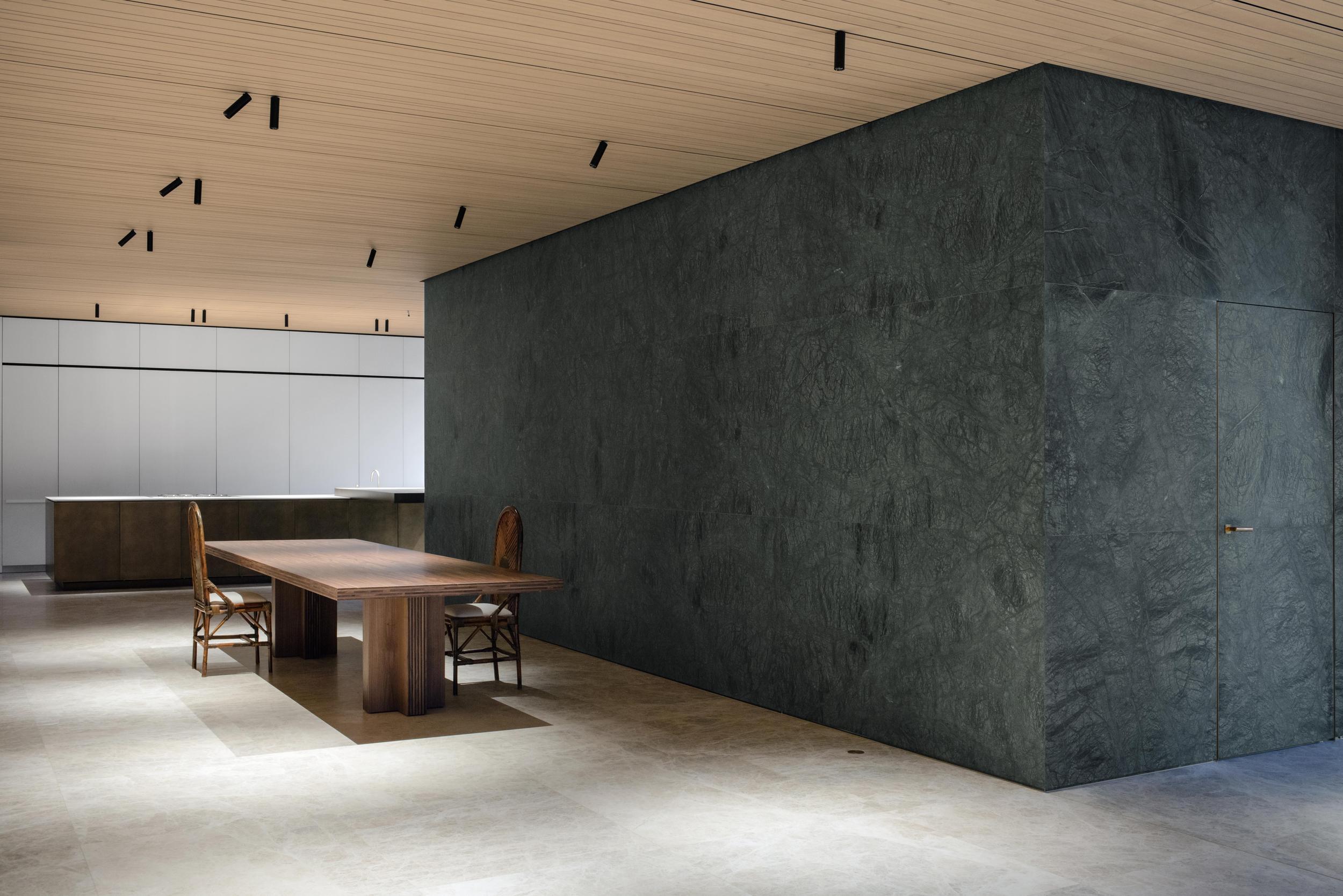 The wooden ceiling, custom developed for this project, not only hides the utility lines, but also provides sound/acoustic insulation. The kitchen island in patinated bronze and ceramic stone, seamlessly blends into the environment in a similar fashion. The monumental wall in Guatemala Verde marble, contrasting sharply with the rather low-key environment, dominates the dining room. The jade-green box of Pentelico marble covering all four planar surfaces of the master bathroom. When all sliding doors are open, a kaleidoscopic perspective en enfilade unfolds, revealing four rooms with similar proportions but with diverging functionalities and finishes. The guest bathroom is entirely executed in Arabescato. The whimsical patterns of this impressive marble not only cover the floor and walls but continue into the face of the cabinets.