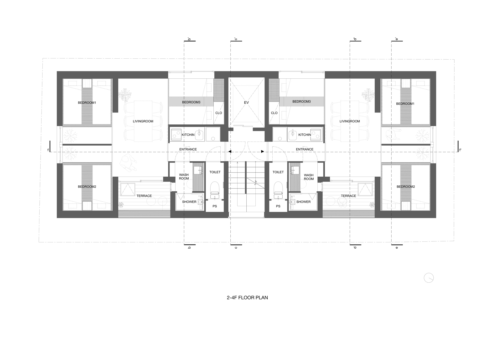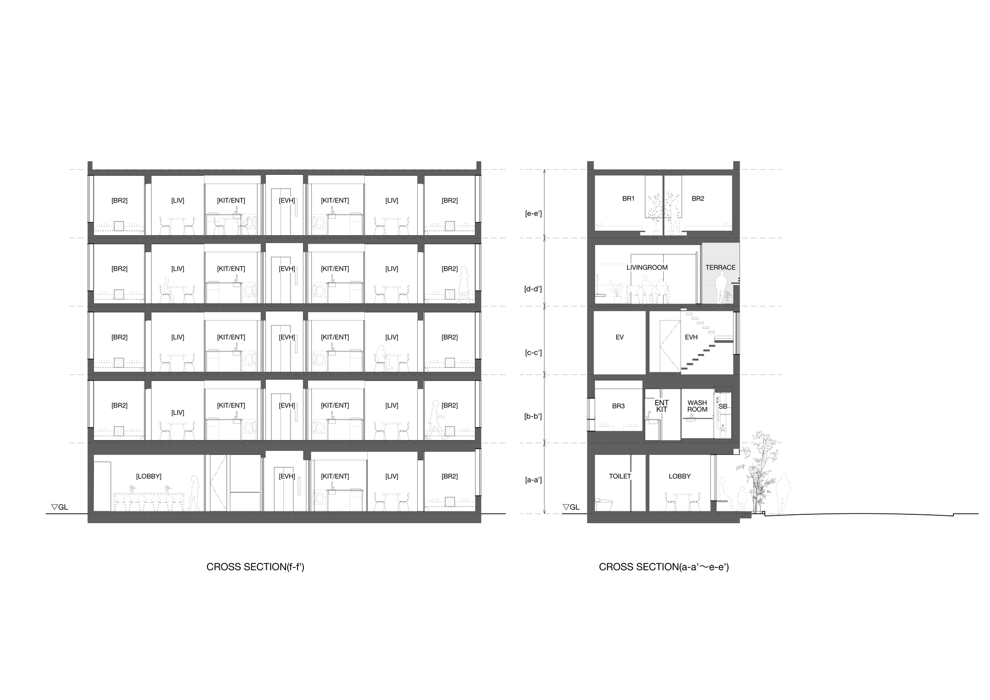 Reinterpreting a traditional style of housing in the present day - The general composition adopts the stairwell style, similar to public housing during Japan's period of rapid economic growth. Two accommodation rooms of approximately 40 m2 are allocated on each floor across the staircase. With the aim to be distinguished from Tokyo's offer, where the majority of the rooms are single, twin or double beds, we propose nine rooms able to accommodate a large number of family members or friends. Each room is equipped with a kitchen and a washing machine, which can be used by up to six people. This way, a possible conversion into apartments can be considered in the future.