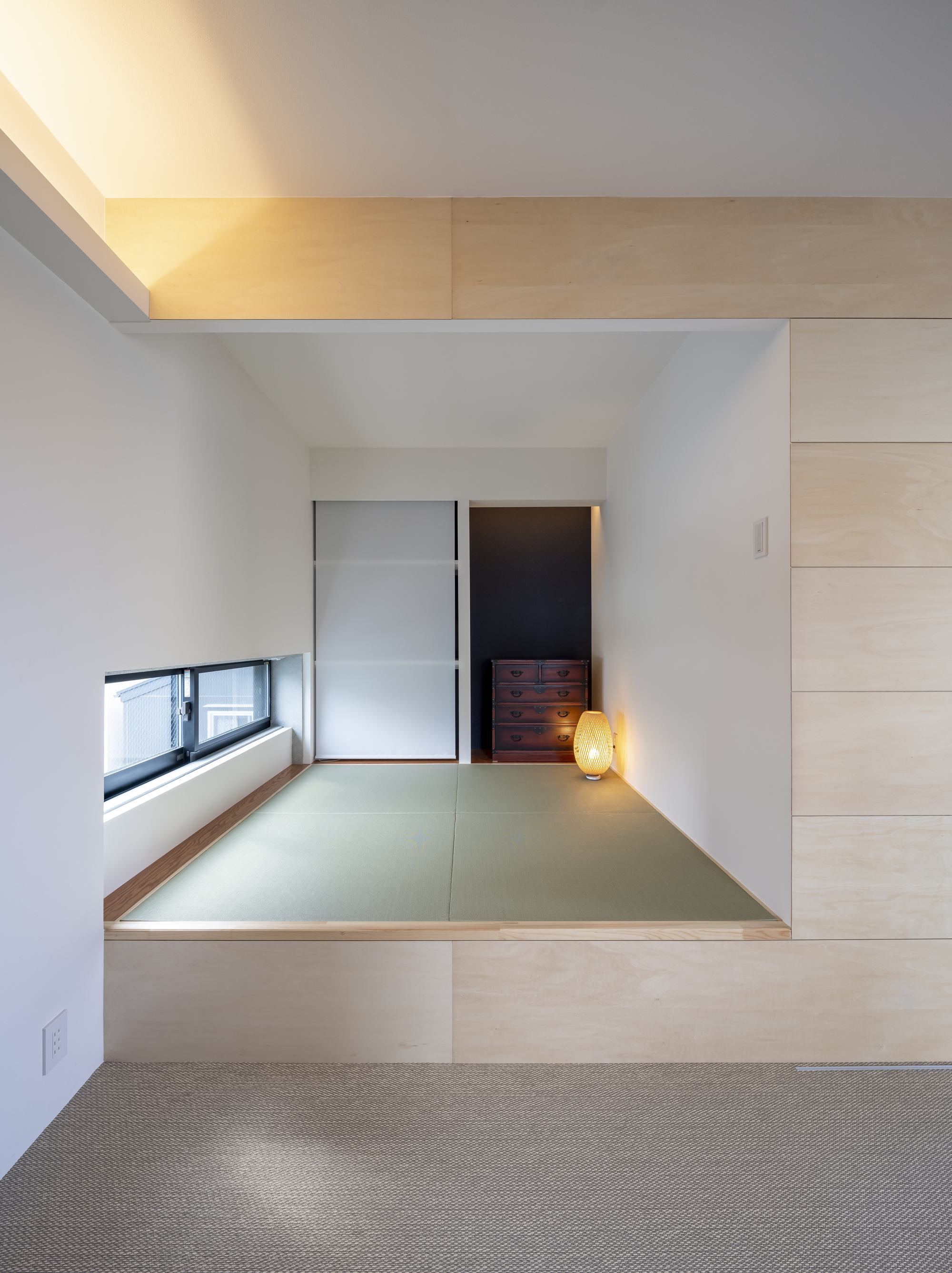 We chose to use a modern structure made of reinforced concrete, while keeping a Japanese traditional way to conceive the space. For example, the reversed concrete beam is used for the upper tatami room, while the lower floor contains a traditional sitting table and lower chairs. This configuration ensures privacy from the outside, and a sense of security. On the other hand, by widening the opening on the ceiling, we encourage the line of sight upwards. This gives a feeling of openness to the outside surroundings, and the opportunity to admire the exceptional location and feel a sense of unity with the city.