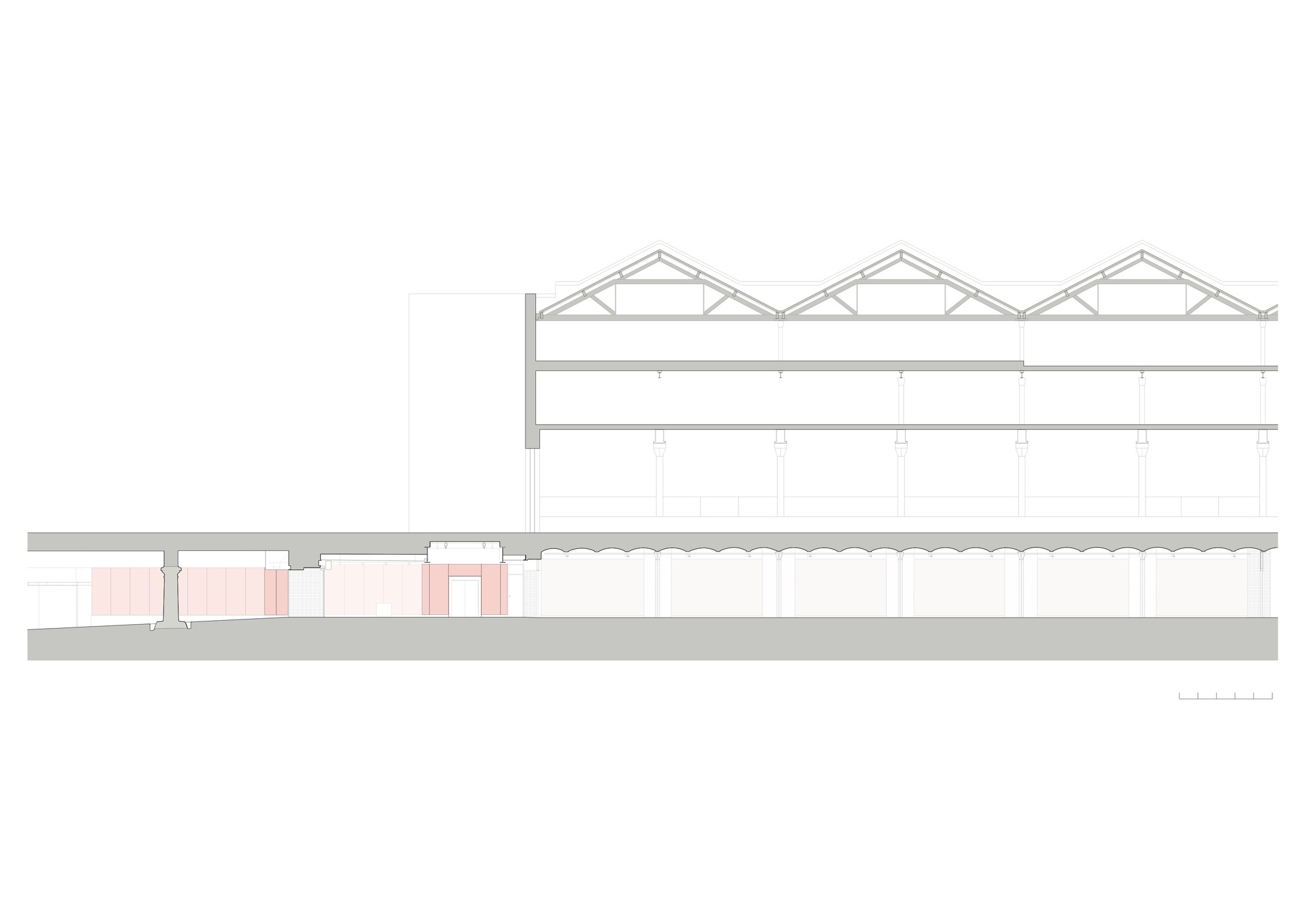 The new entrance from the museum’s Lower Yard rehabilitates the vaulted under- croft of the historic viaduct, also known as the “Pineapple Line” (over which railway tracks run into the New Warehouse), now transforming this area into a bright and welcoming space, which clearly orientates visitors and provides an uplifting arrival.