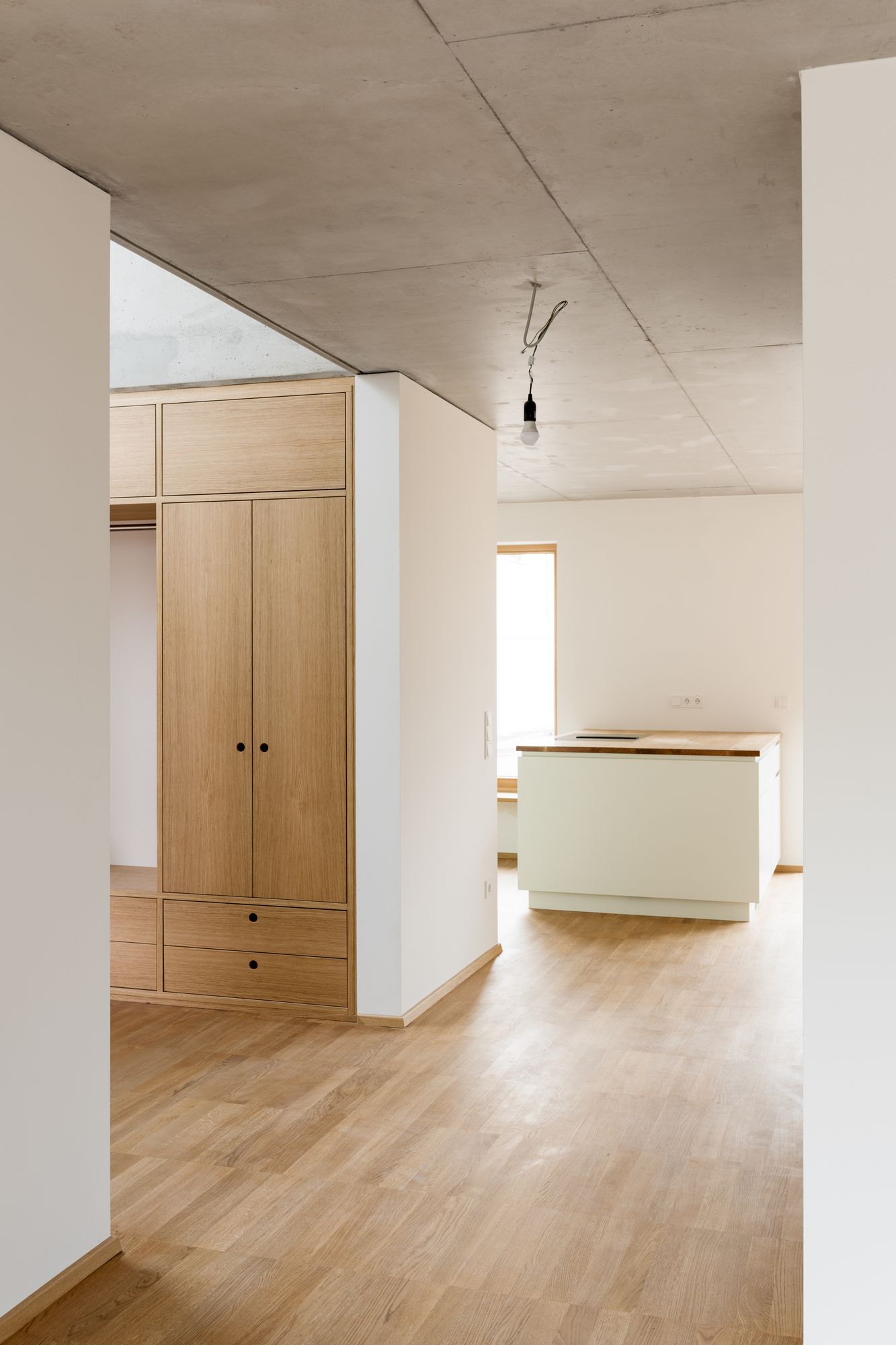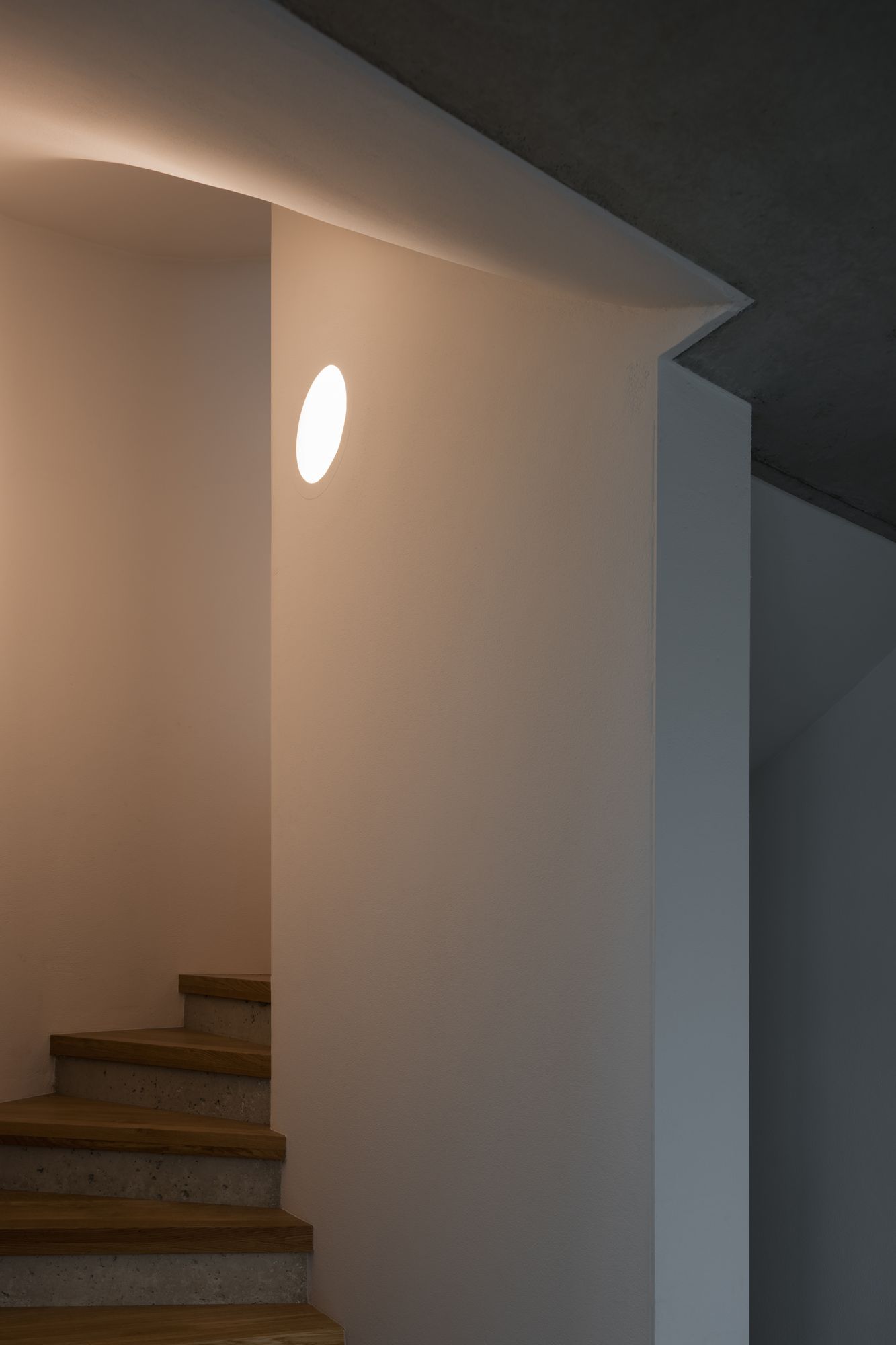 On the ground floor the internal corridor opens up to the living room to the west and the kitchen and dining to the east, creating an inner enfilade. On the first floor the symmetrical shape turns into a cross-shaped division that accommodates two children rooms, a big bathroom and workspace. On the roof floor the distribution space turns into an open circulation of the parents realm: a bathroom, a small retreat and a bedroom located under the ridge and lightened by a big round window. The absence of thresholds in the floor of wooden boards provides an open circulation between the rooms. Also the ceiling of exposed concrete is continuous, whereby the individual rooms appear like white cubes set into a vast envelope.