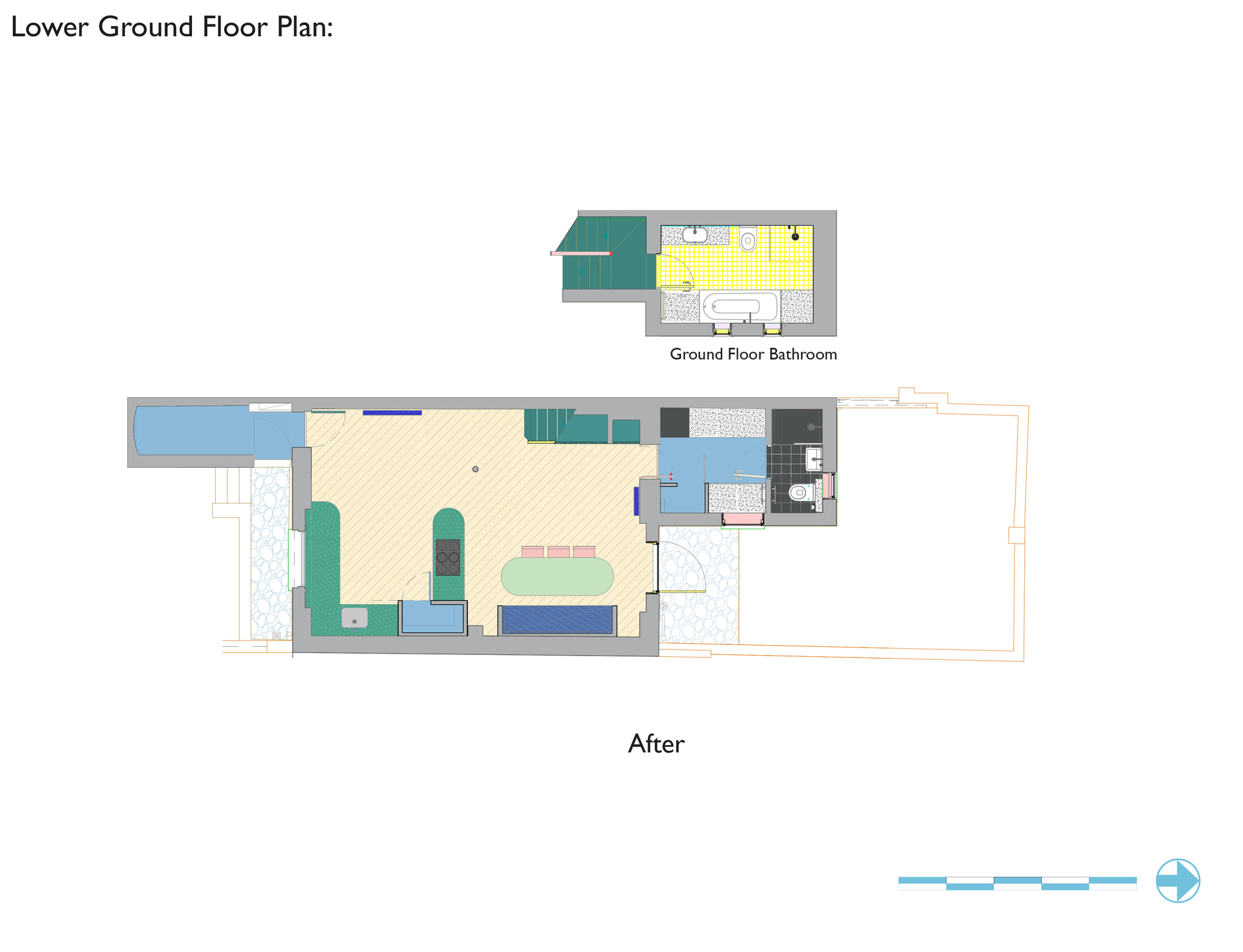 The reimagined lower ground floor now features an open plan, dual aspect kitchen and dining space achieved by removing internal walls, and a further two bathrooms and utility space. More unusually, the architects have designed all the furniture and deployed colour, mirrors and lighting to dramatic effect.