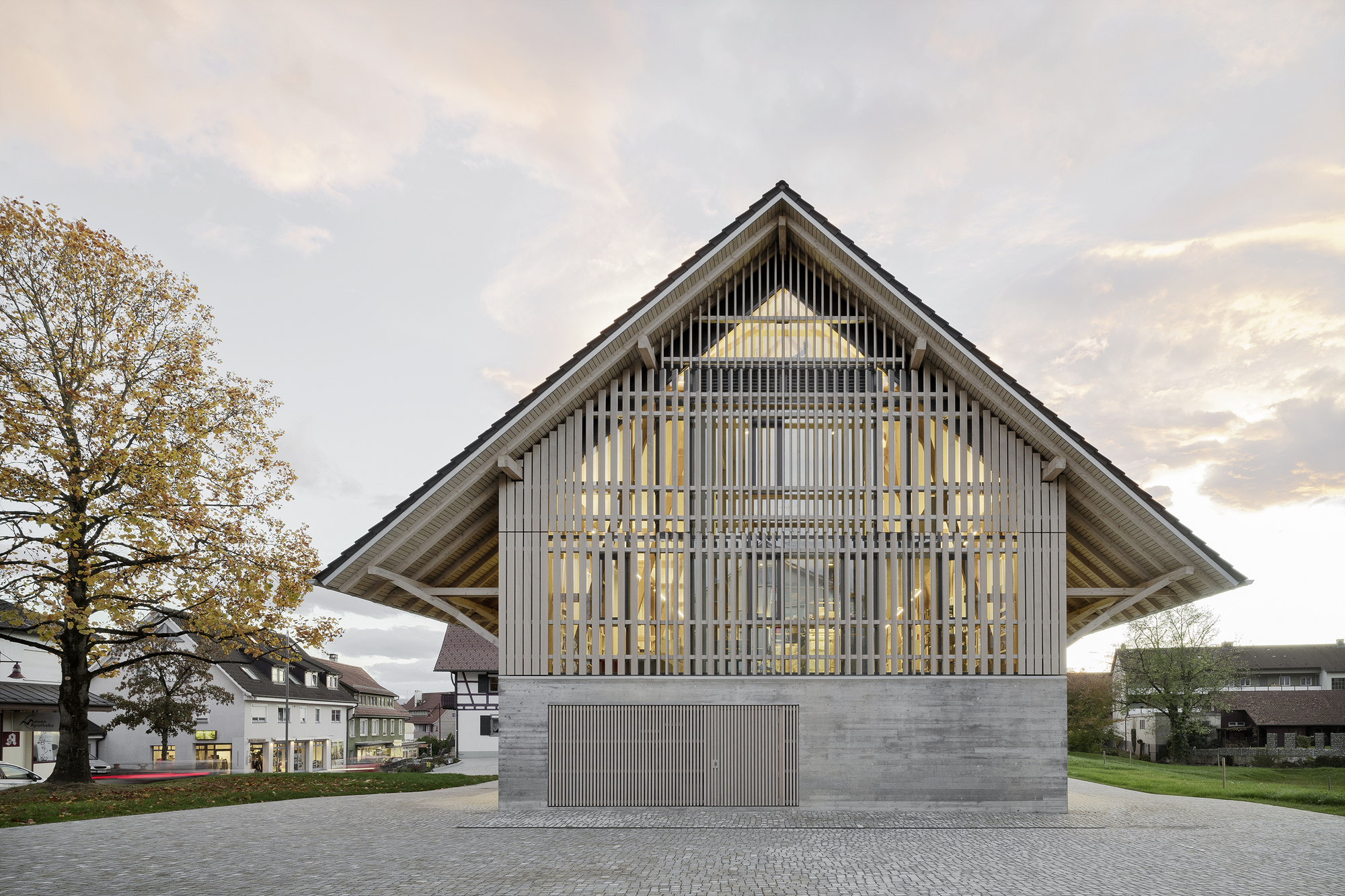 At its prominent location within the village, close to both the town hall and the festival hall, the barn’s new public use as a library and community center has established an important connection that now links the three separate buildings. An inviting forecourt and a broad outdoor terrace reinforce the barn’s new public character and encourage people to linger. The erstwhile, rather introverted storage building has become an open house that conserves its familiar image, with the solid base and large, open timber roof structure, while at the same time speaking an unequivocally modern language with the materials used and the large openings on the ground floor.