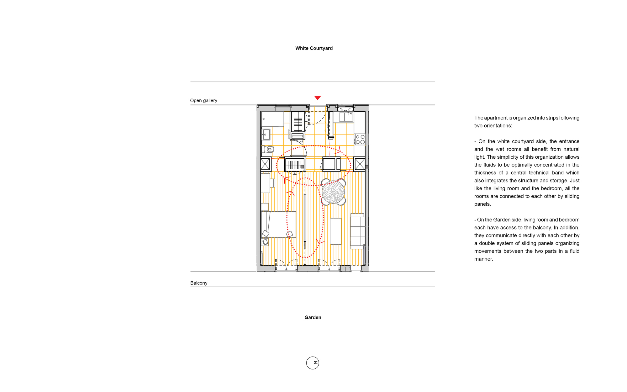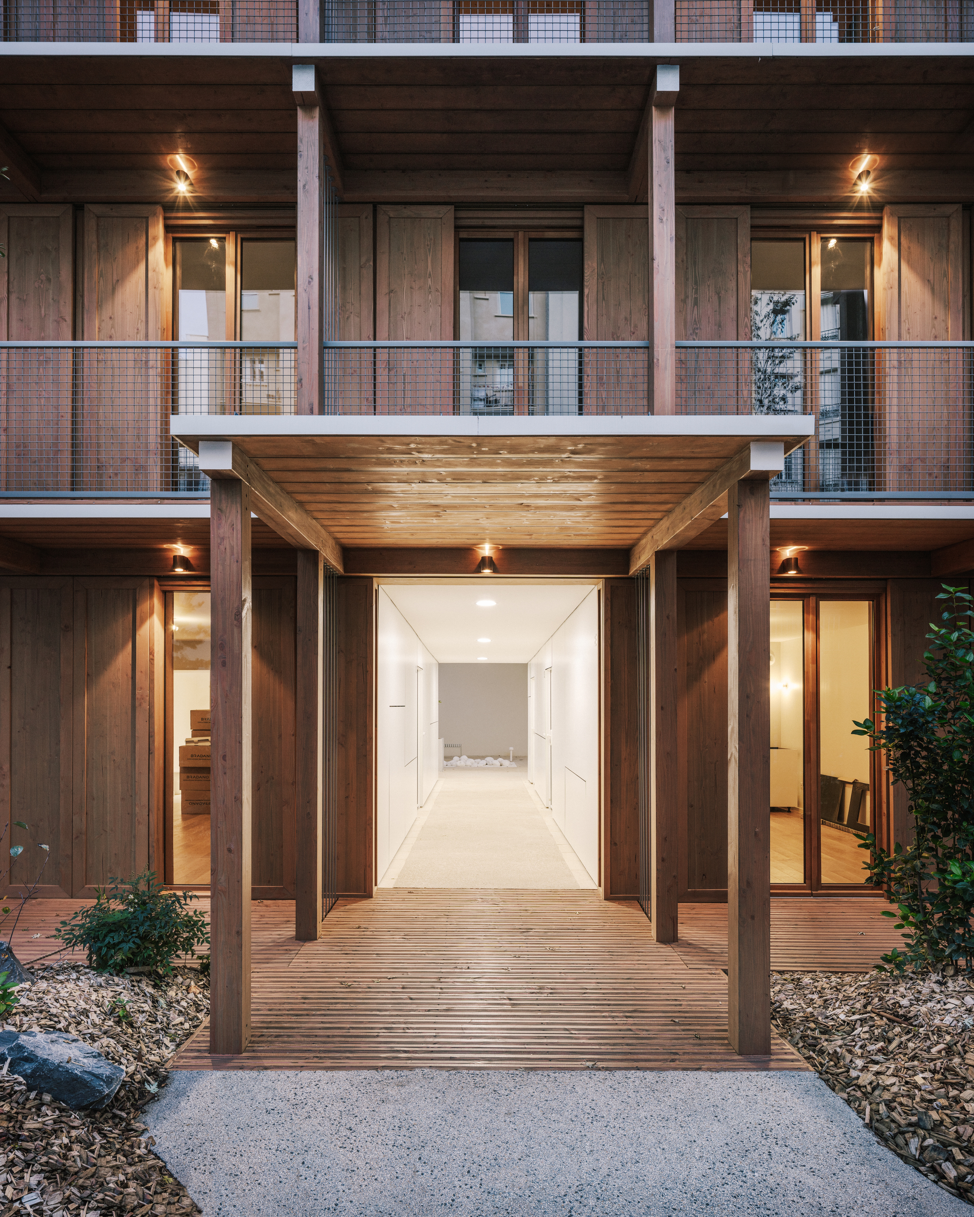 It results from the repetition of decisions taken at the scale of the window, decisions motivated by structural constraints and by the search for durability with the protection of wood against bad weather thanks to the projecting balconies and the white protective paint that protects the ends of the wooden beams and which creates a rhythm on the facade, giving it its own identity.