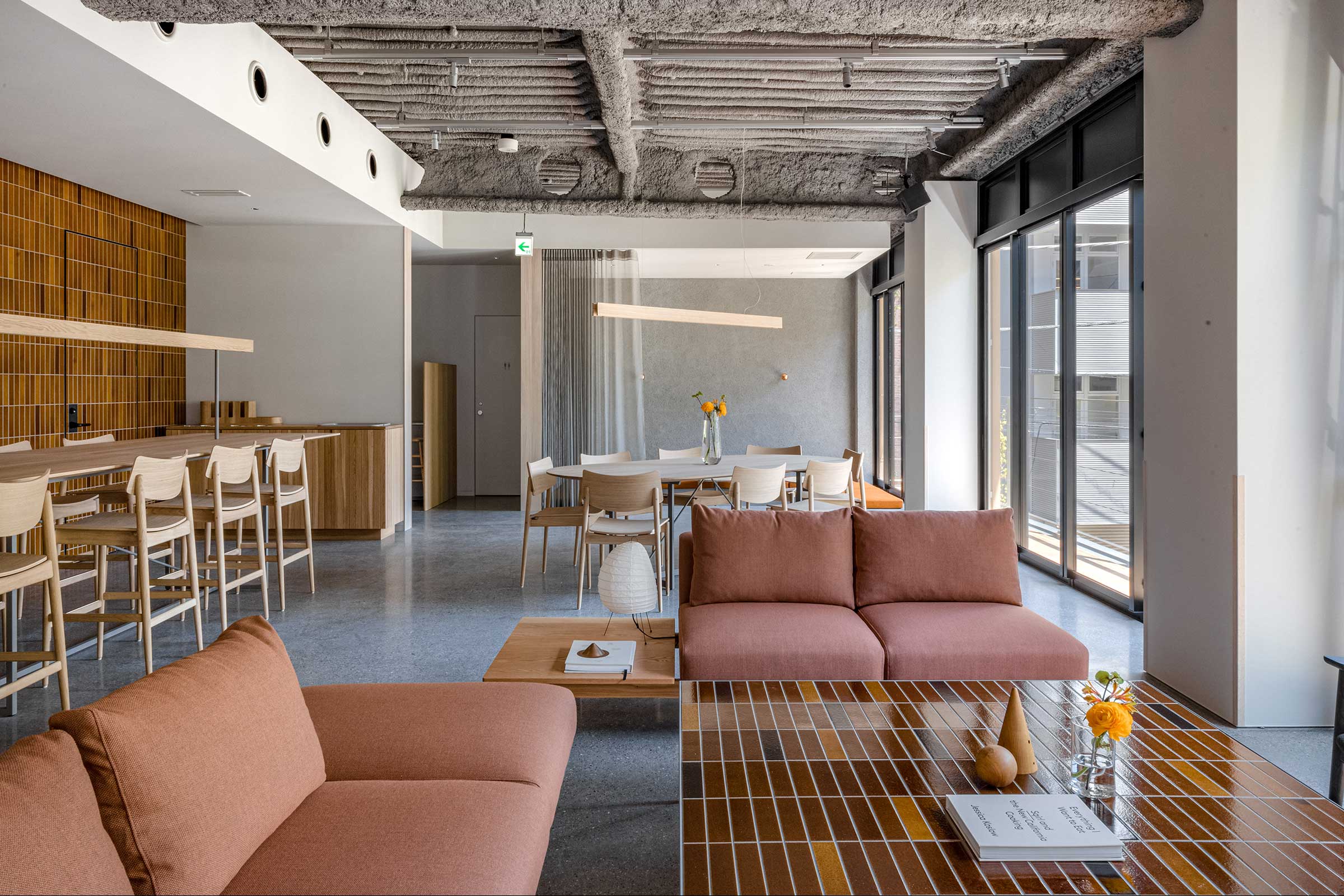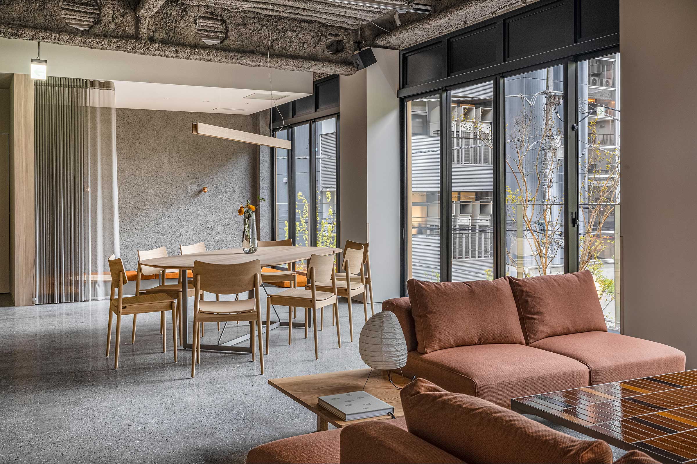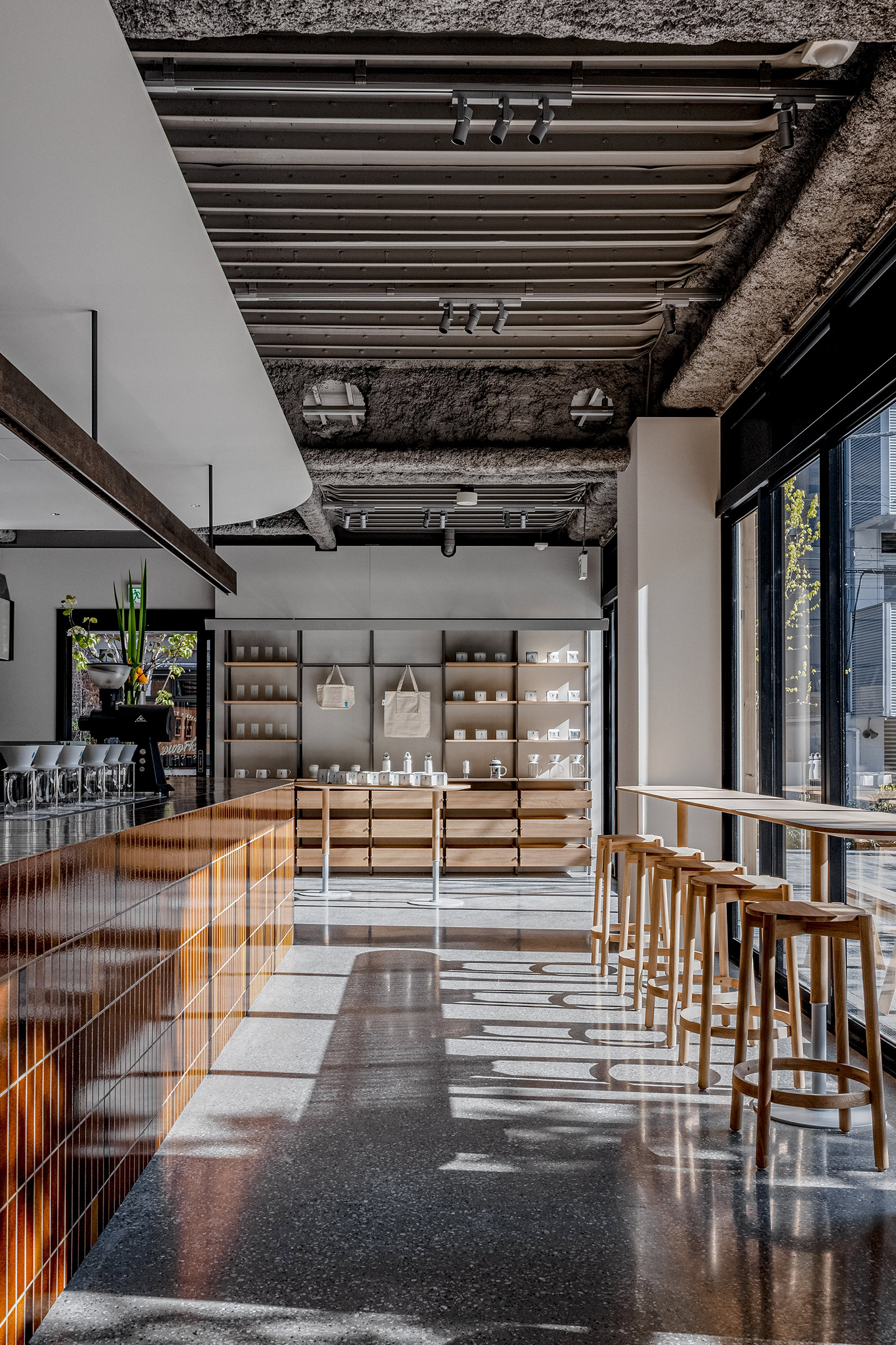 An oval dining table in the center provides a casual, communal atmosphere for sitting around, and a high counter table with a library-like light allows for quiet groups and singles to sit at the rear of the space. At the far end, a low, tiled coffee table is surrounded by comfortable lounge chairs and sofas. In addition to the early morning coffee/food menu, appetizers and natural wine will also be available in the evening. The studio hope that visitors will enjoy the warm atmosphere as if they had been invited to visit the welcoming house of a close friend.