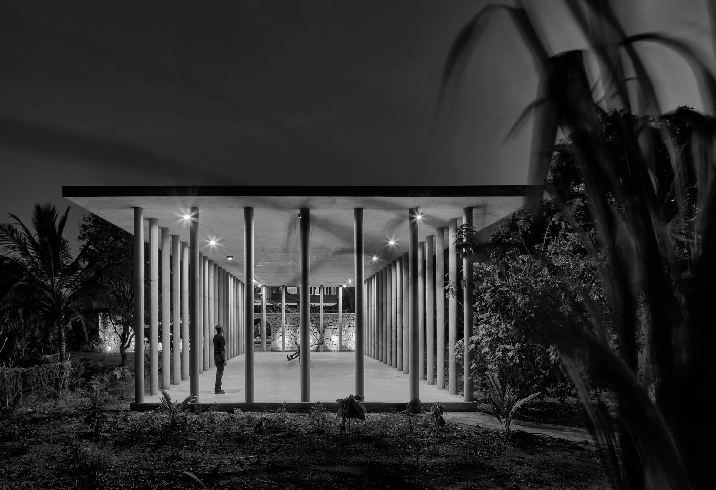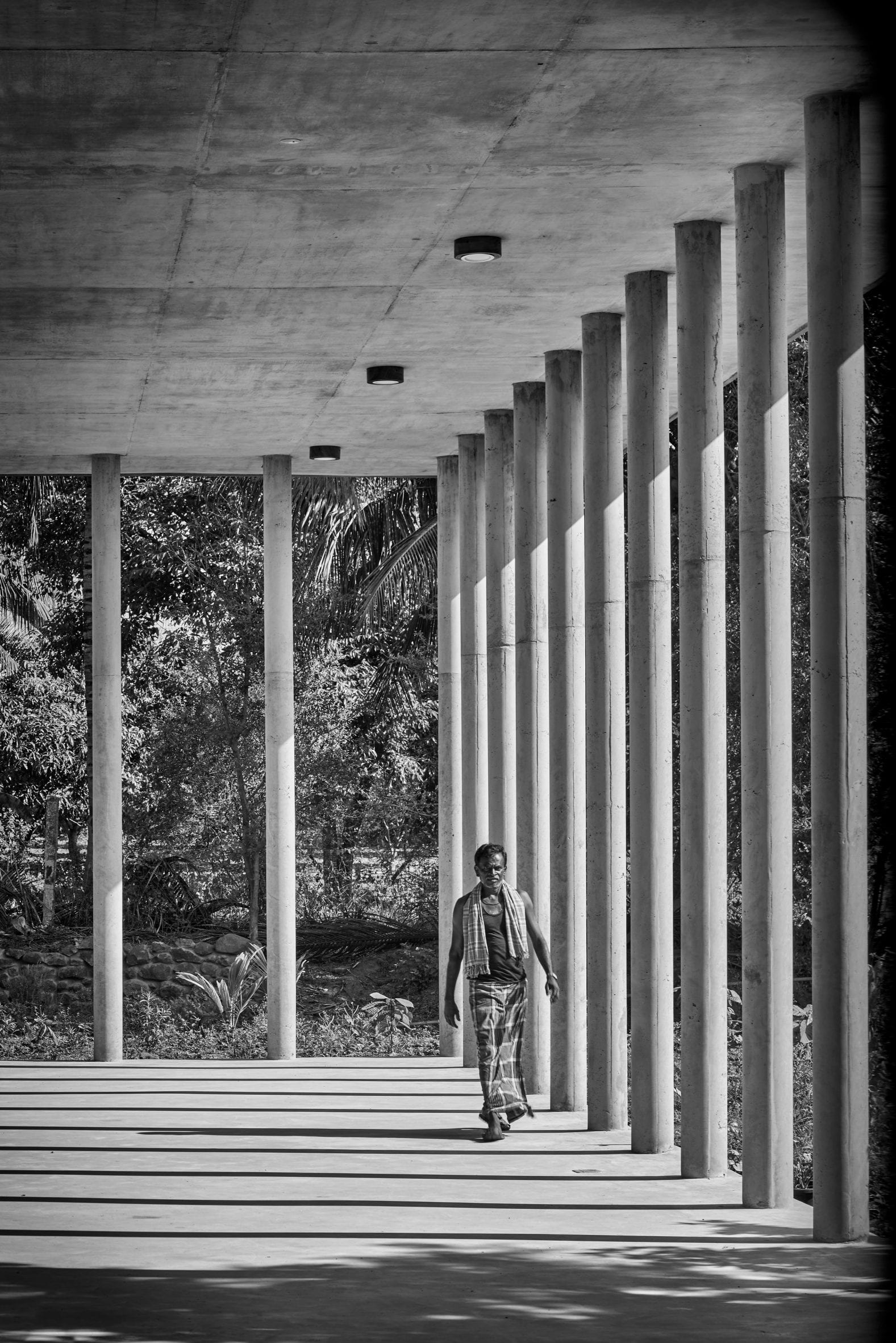 "The unbounded spatial configuration is consciously kept devoid of unwanted wall envelopes," they said, "for experiencing the natural elements like the refreshing monsoons, the warmth of the morning sunlight, birds chirping and the aroma of the flora sprinkled all over the site."
