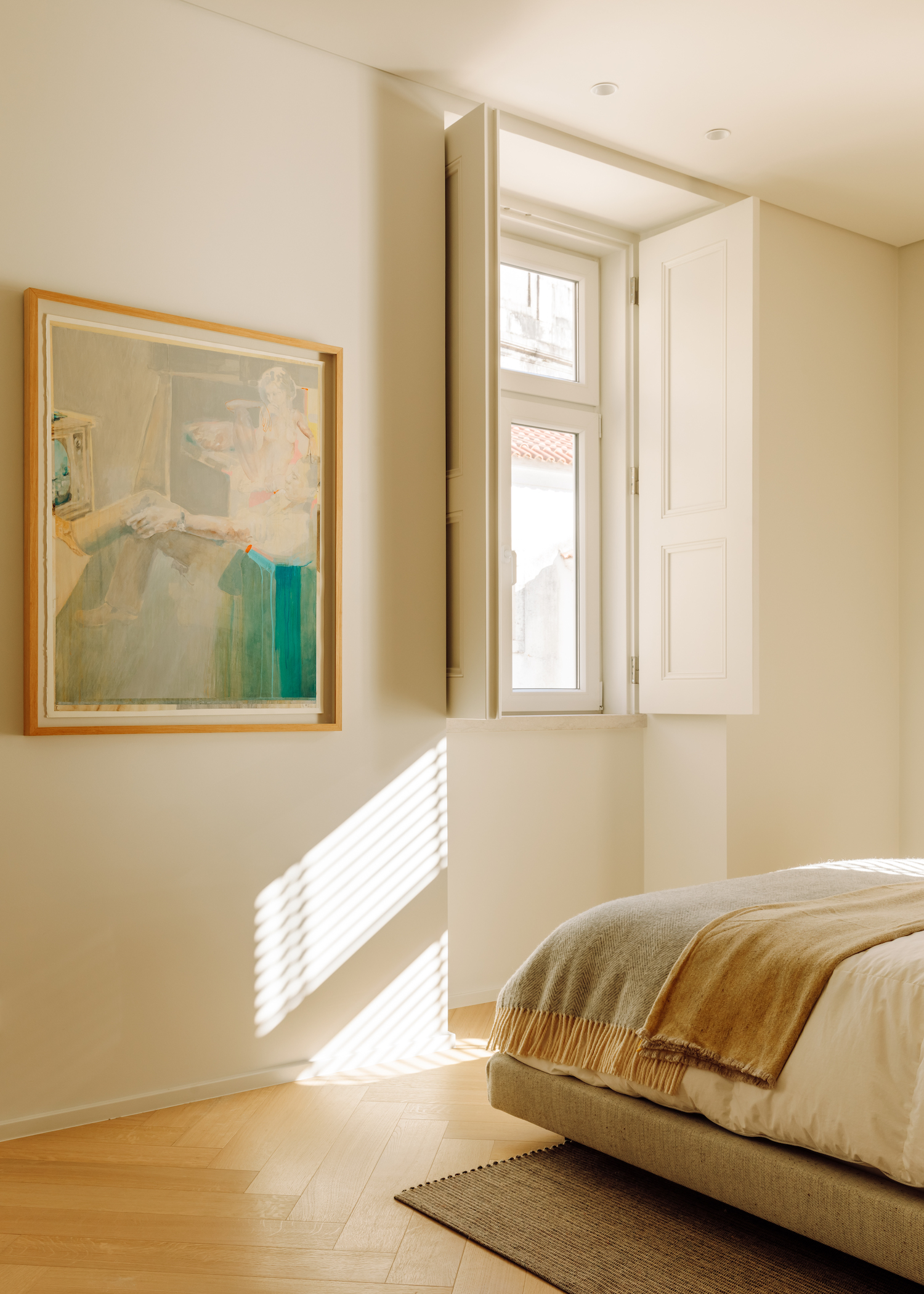 The house has large windows on three sides and is nicely isolated from the exterior with refined Venetian wooden blinds which con- tribute to create a soft and calm atmosphere. The general color palette of neutral beige-grey tones is punctuated with some touches of accent colors.The XIX century old house had to be renovated into a contemporary space but with traditional architectural Portuguese elements such as the large stone window frames, the decorative metal work balconies and the carved wooden entry door.