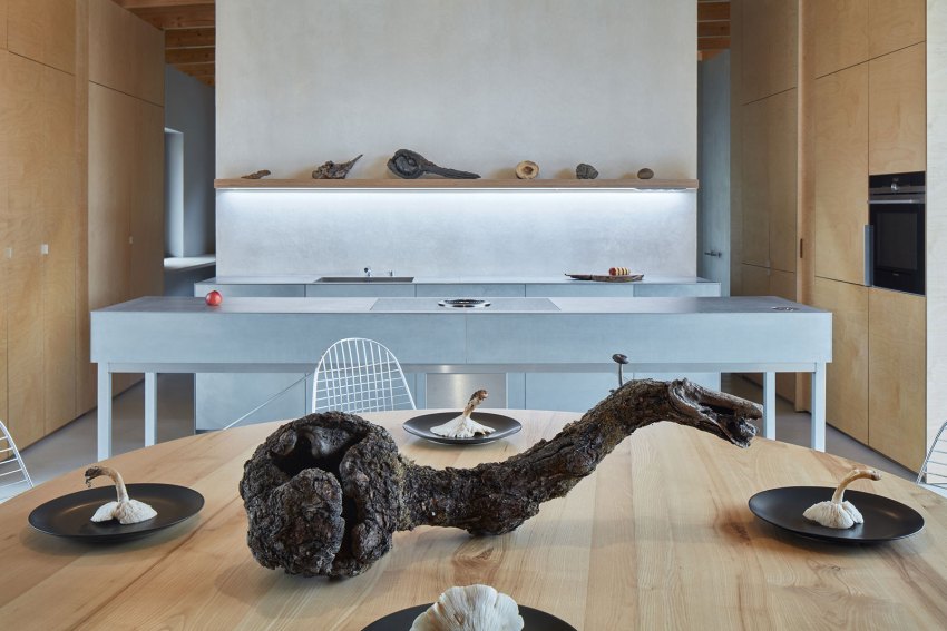 House LO is defined by three elements: two perforated stones and a thin wooden sheet. The void in between the stones is the living space of the house. It is separated from the surrounding nature by large sliding windows that allow the space to become part of the outdoors and frame picturesque views. The two stones contain an entrance, two bedrooms, and a bathroom. The house has a cellar with technical facilities, a photo chamber, club room, and storage.