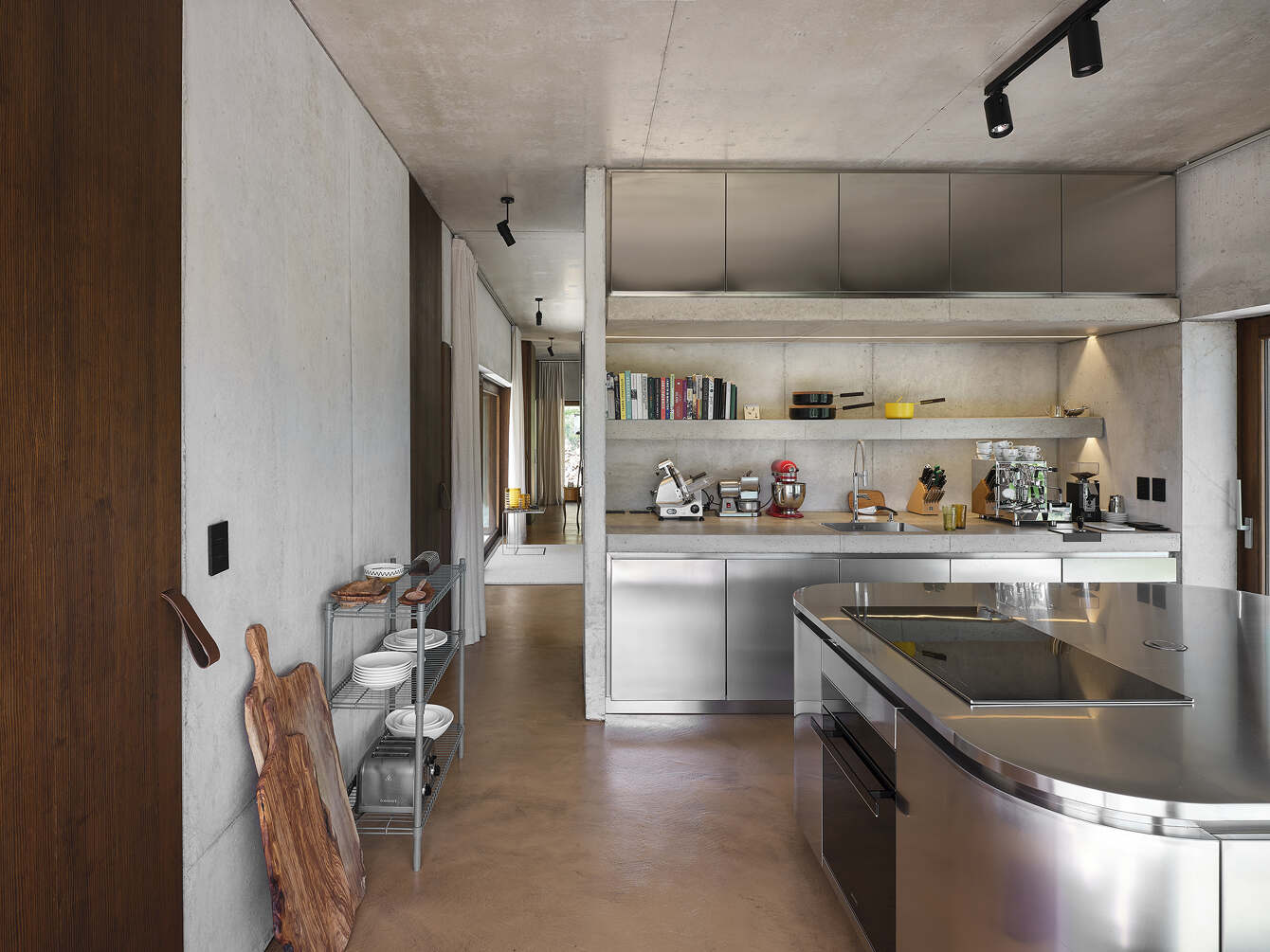 The spaces in the house are geometrically configured around a central patio of Roman-Italic reminiscence: “Atrium Tusculanum”. The interior is just structure and raw materials aimed at celebrating the contemporary approach to detail solutions. The floor is made of cementitious resin and it has the color of sun-scorched grass in the warmer months and chestnut leaves in autumn. Natural wood completes the volumes and all the furnishings are customized. A steel kitchen island and a monumental cast-in place cement table celebrate the rite of good Italian cuisine emphasizing the convivial character of the house.
