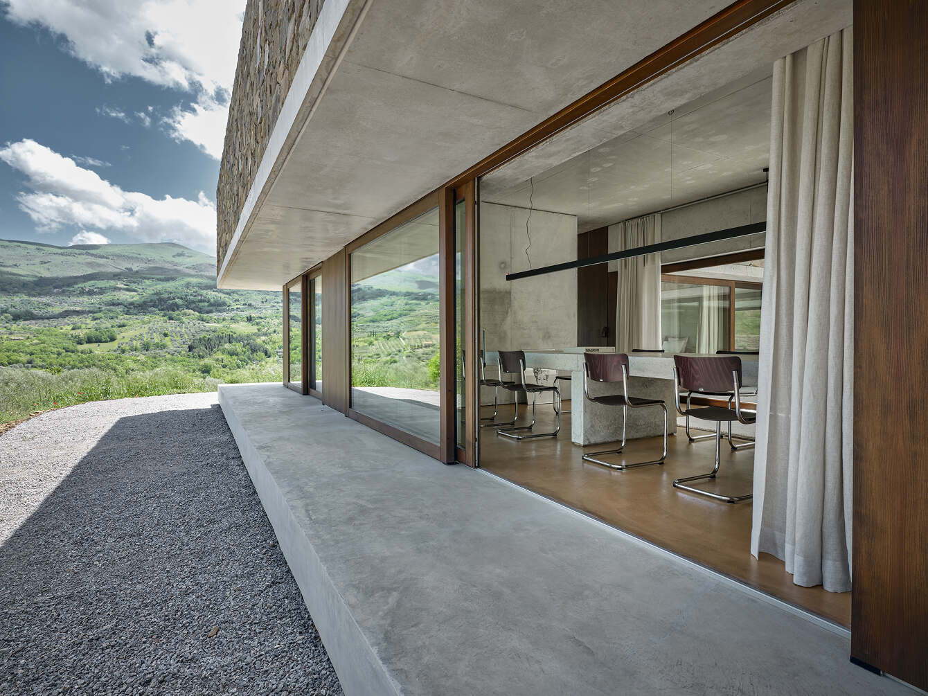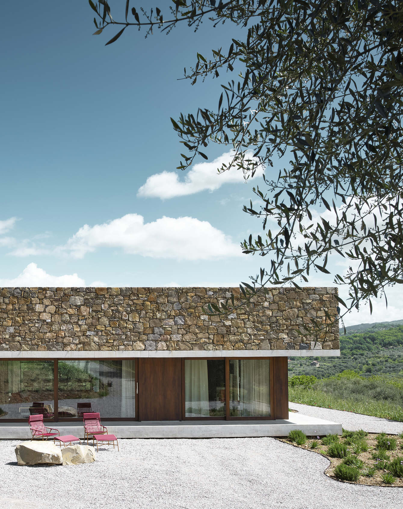 The table is the secular altar in the centre of the visible scene from every room in the house. The facility is a spatial continuum between the intimate hearth and the olive grove without blackout filtering elements except the light linen curtains. Outside the rigor of geometry is compact and cohesive in proportions and it honors the local country building tradition of “dry stone” walls on anthropized soil, whereas the wood infills recall the locking elements of the amiatini traditional rural buildings called “seccatoi” –dryers for chestnuts -. In this way, the building merges with the landscape and ties it profoundly into its own history.