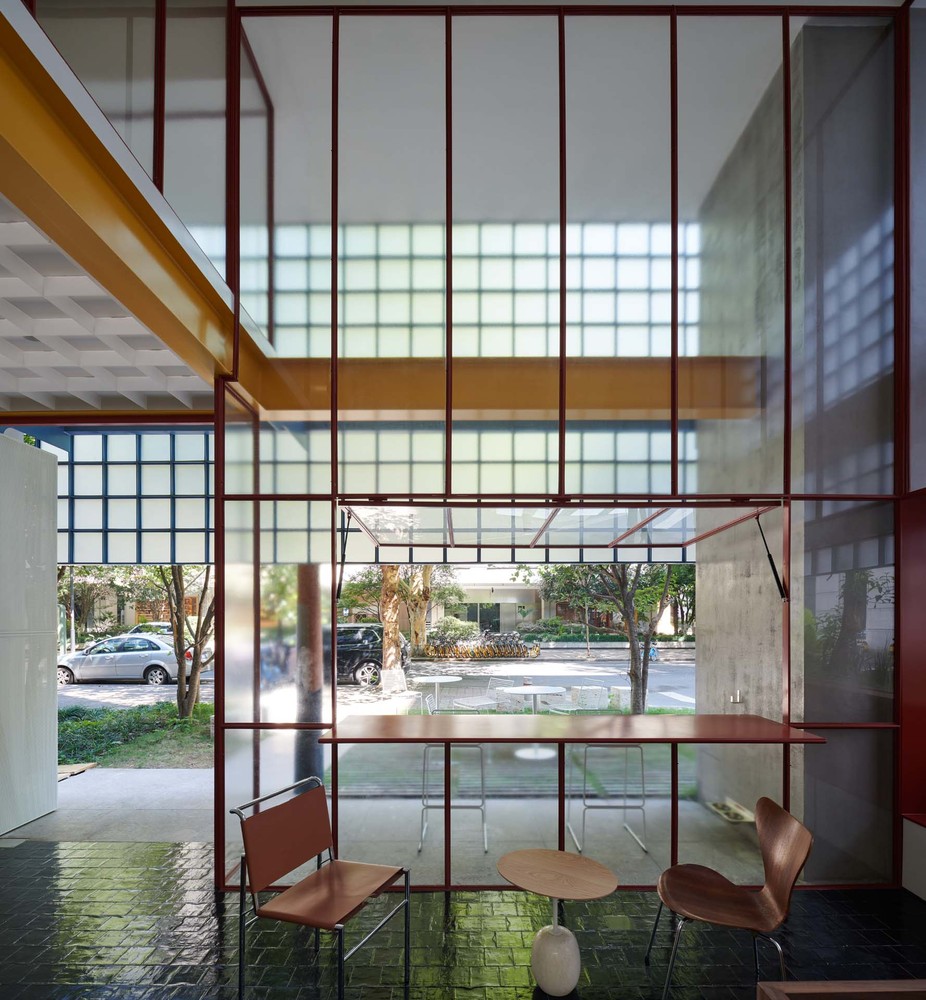 The massive grid facade is raised by 2.1m on stone columns, creating a striking contrast in volume, while the metal grid of the facade extends to the other side of the building facade, where there are no columns to support it, and the entire grid system seems to hover lightly on the outside of the building. The blue metal grid is filled with sand-blasted glass, and above 2.1m, the interior light becomes blurred and soft through the glass, while below 2.1m, the interior space can be seen directly through the windows.