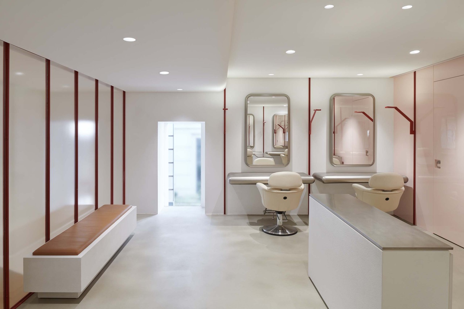 Elegant growth. The site is located at the corner of Lakeside Apartments on General Road, with two main facades. Say started from the concept by setting up a stone column on the entrance side, formed by the interlocking of various stones, from which the whole Reef is generated. During construction, this column was also the first component to be positioned and placed on-site, and the entire construction process is the process of Reef’s growth. Reef starts from the stone column, which serves as the origin, and the whole space is set in a 300*300 grid system, starting from the façade, all the separations and elements in the space are positioned in the whole grid system. Behind the grid system are the three main spaces of Reef, the men's barber, the women's salon, and the coffee area. The coffee area runs through both floors and connects the salon on the second floor with the barber on the ground level.