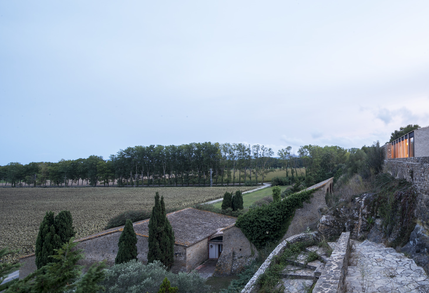 We are in Baix Empordà. On top of a small cliff, overlooking a set of fields full of sunflowers. Facing the sea, strongly stalked by the Tramontana winds. Behind an old wall of a house, which guards its farmhouse and annex territory in ruins.