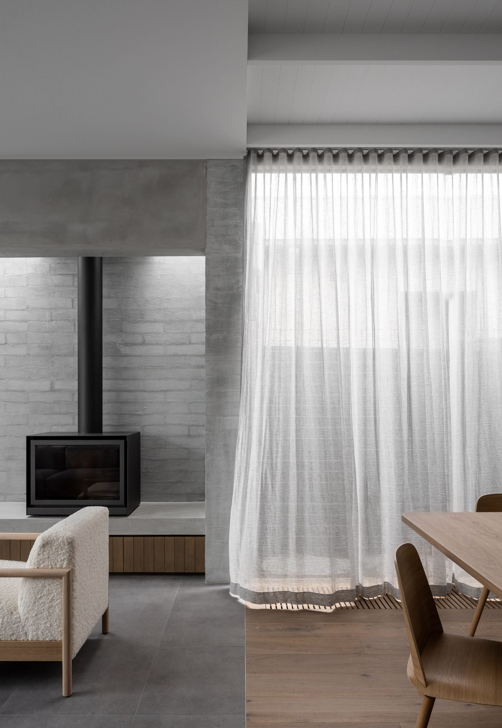 A grey linen sofa and a couple of boucle armchairs lie at the heart of the lounge, accompanied by a wood burner and low-lying bench.