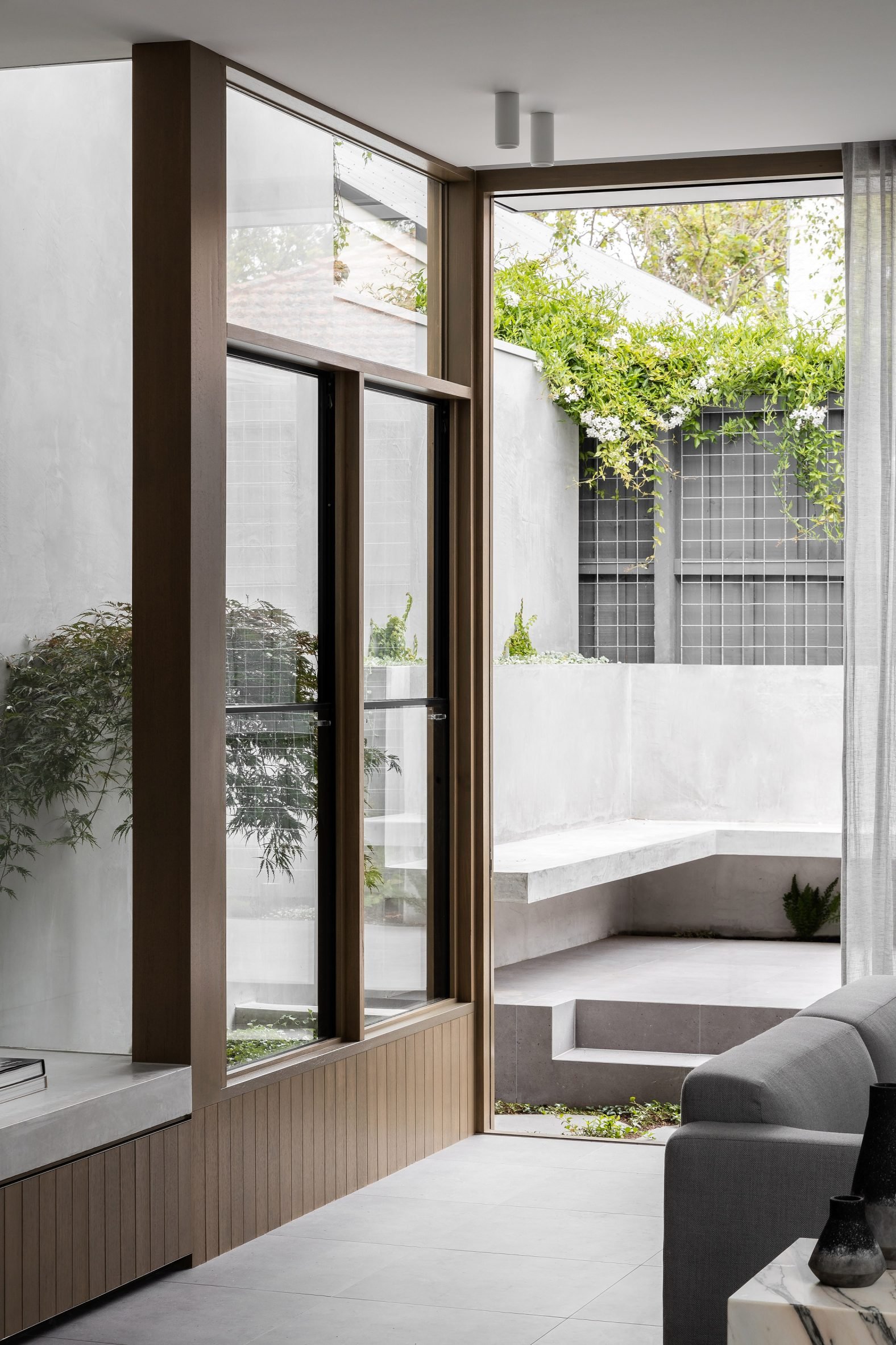 These can be slid back to grant the owners access to a paved garden with an L shaped concrete seat in its corner, which is inset with a greenery-filled planter.