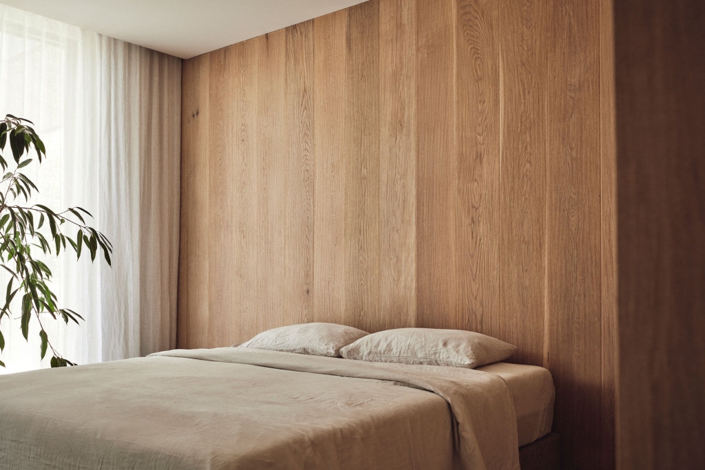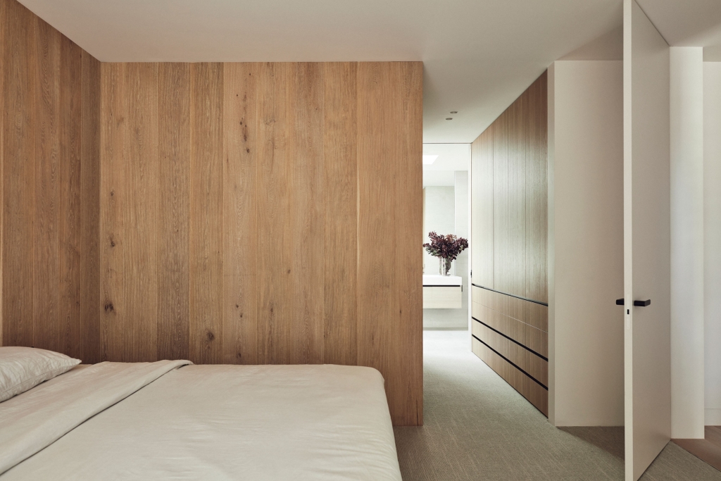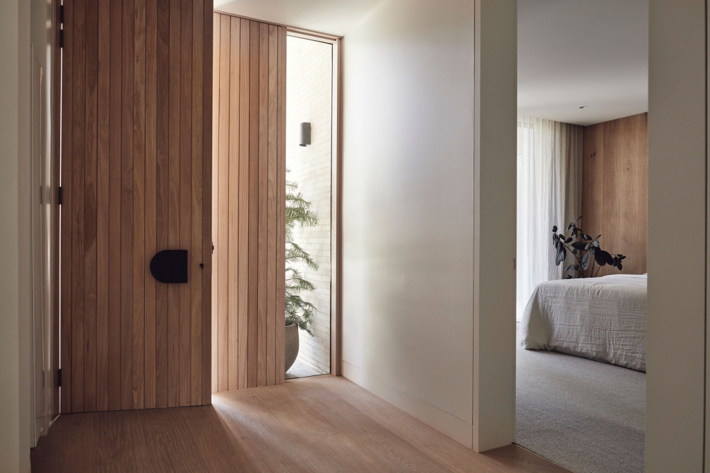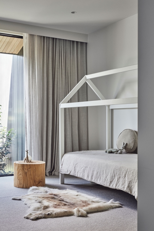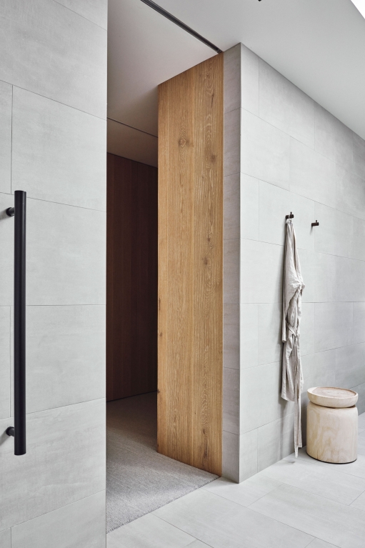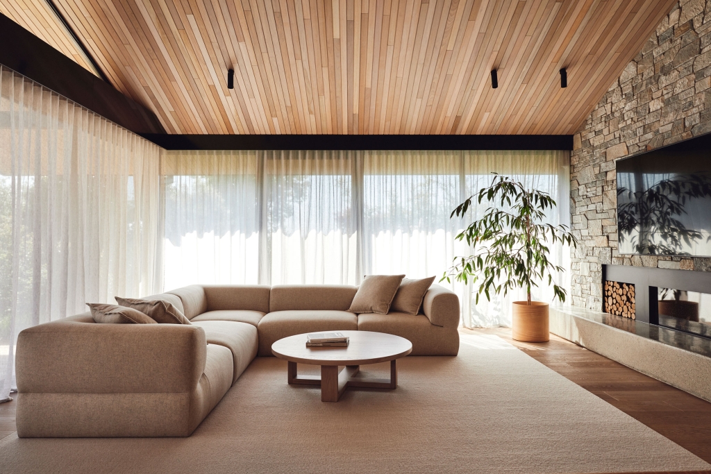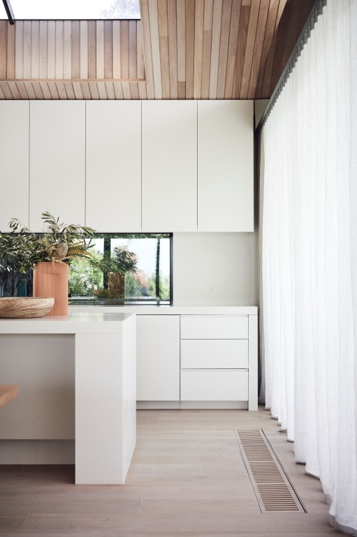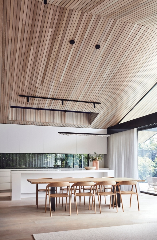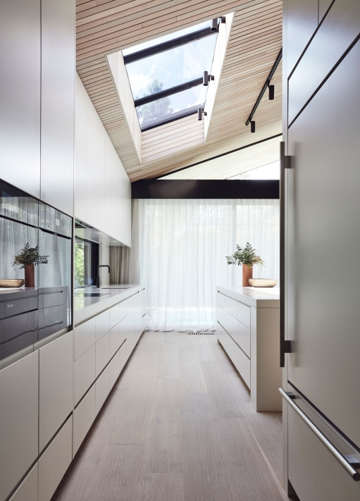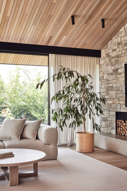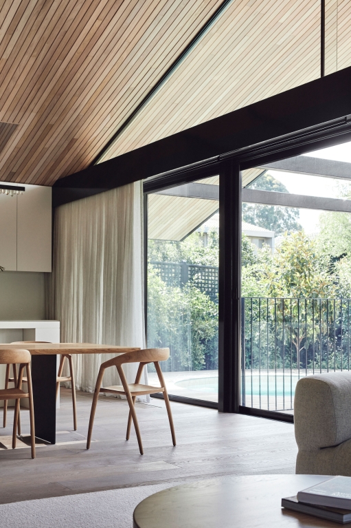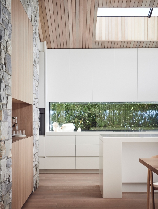 Binding all of the natural and expressive gestures is a sense of restraint used throughout. By extending the ceiling plane upward and utilising the peaked underside of the roof internally, the shared spaces feel larger and more generous; moments of compression in other areas then create a sense of intimacy and match their more passive functions. Throughout, artificial lighting has been reduced where possible, with a focus on bringing natural light in and connecting the interior to the surrounding landscape, both visually and through façade elements that open. While protected and private from the street, the landscape and key vistas are directed to further add to the feeling of seclusion and retreat.