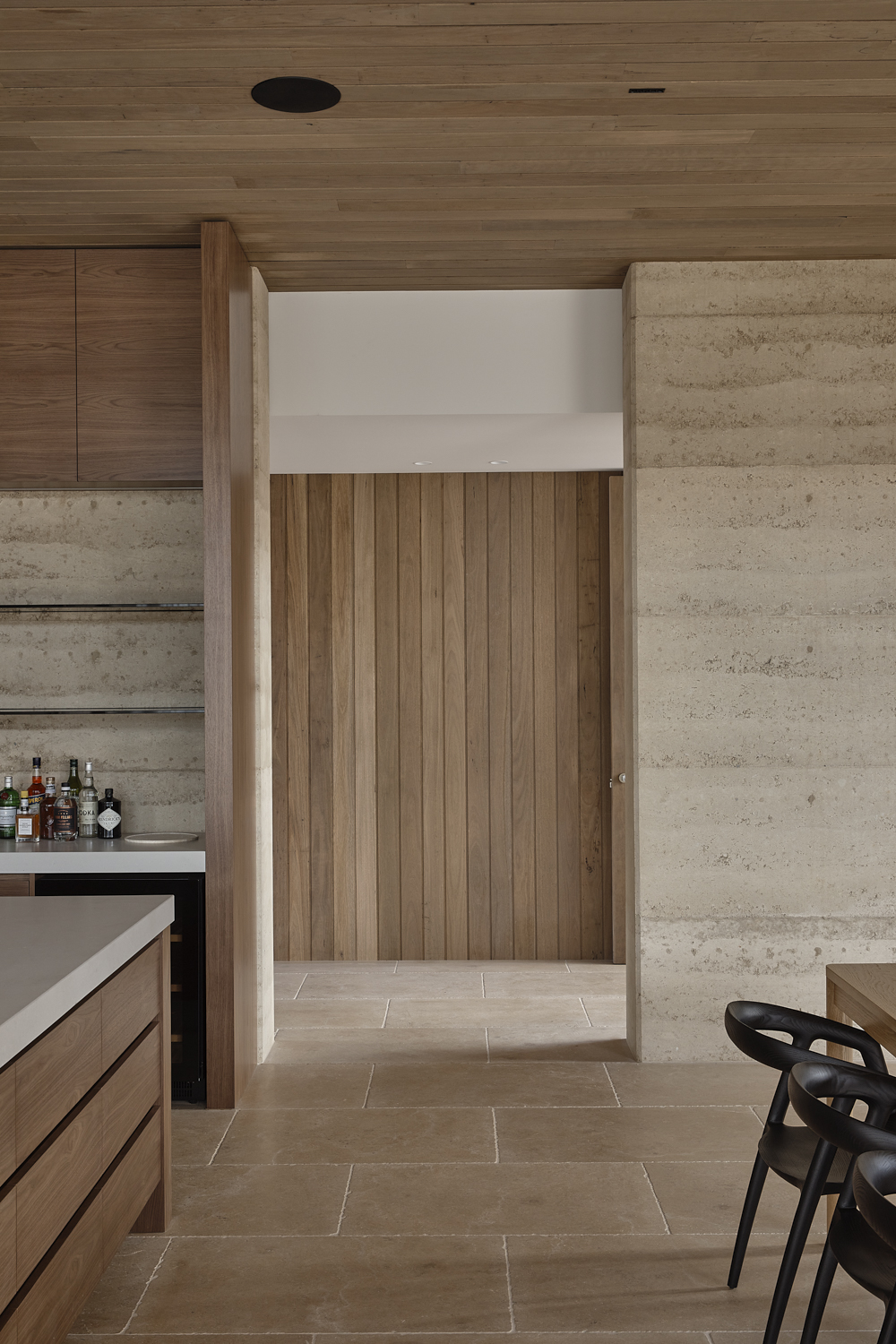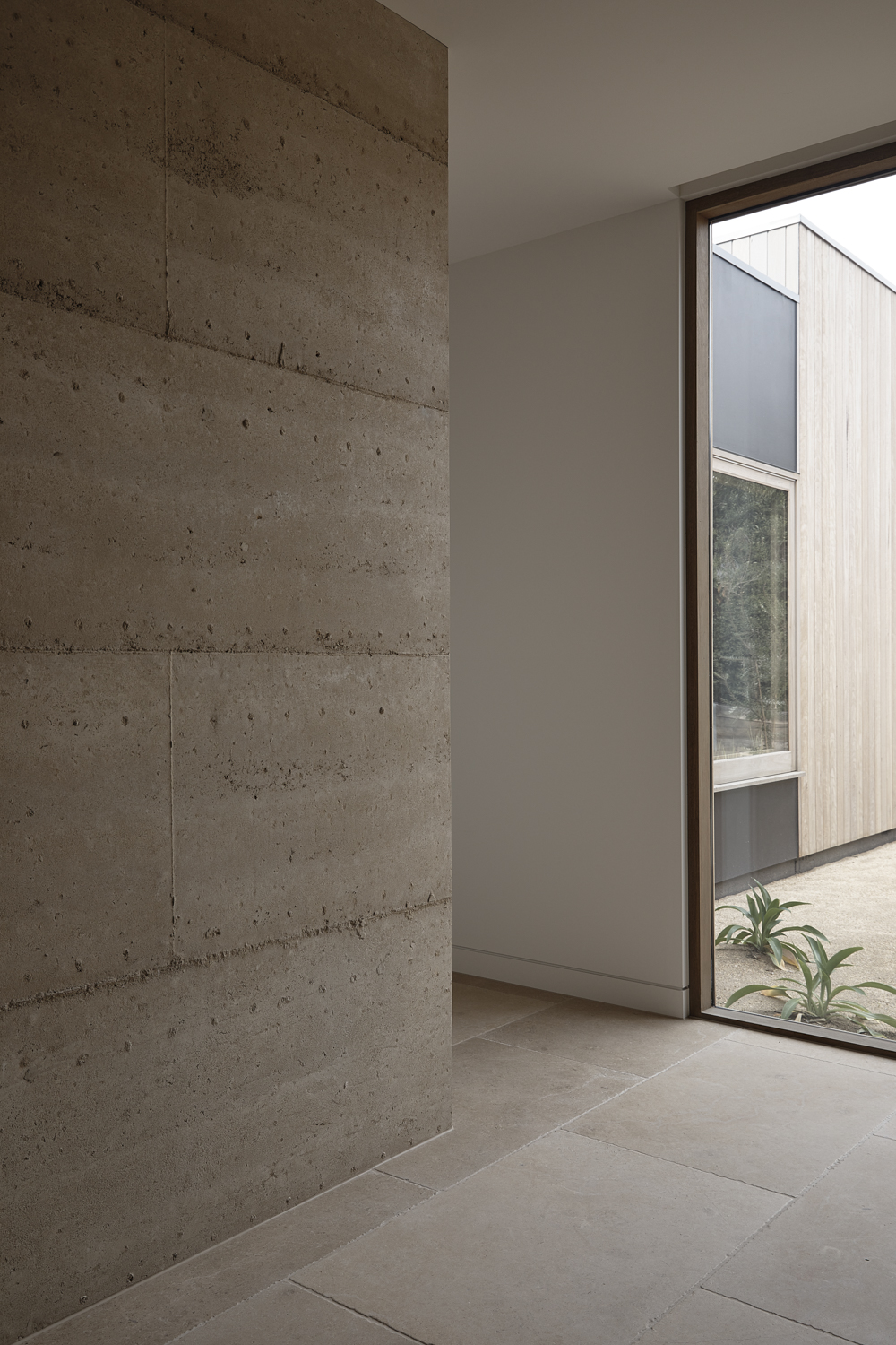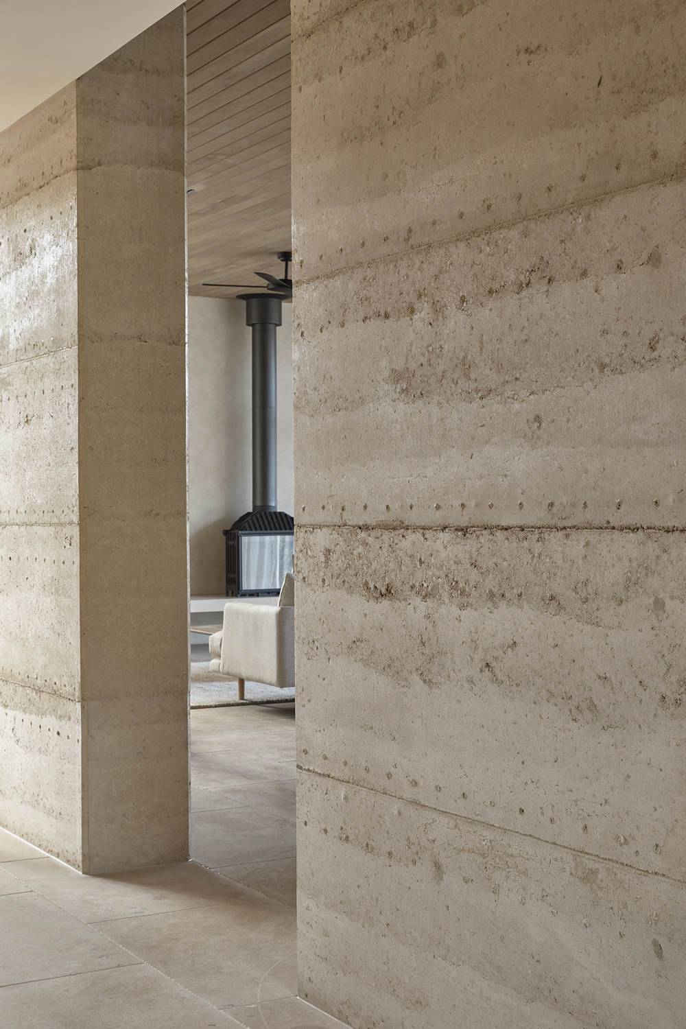 Imagined suiting a number of ages and groupings, the home is generously proportioned at and designed to expand and contract as needed. There are elements that allow the home to be portioned off or segregated, allowing a thermal concentration and the use of less energy for heating and cooling. The extensive use of rammed earth becomes a celebration of its composition, with markings and formwork left untouched as a reminder of process and of its coming together on site. Although crisp edges and concealed joinery and storage allude to a formality, the open nature of the home and the circulation capture a more casual and laidback heart.