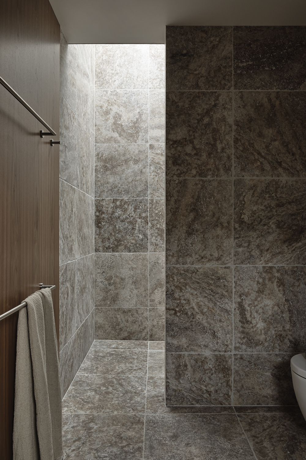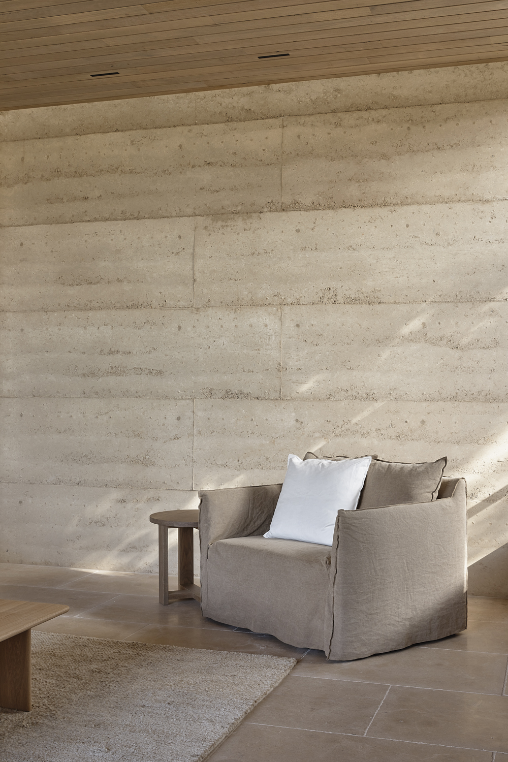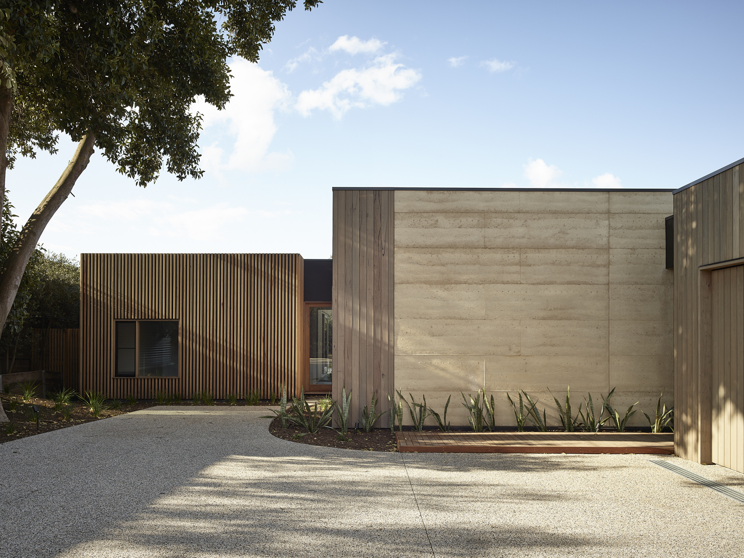 Imagined suiting a number of ages and groupings, the home is generously proportioned at and designed to expand and contract as needed. There are elements that allow the home to be portioned off or segregated, allowing a thermal concentration and the use of less energy for heating and cooling. The extensive use of rammed earth becomes a celebration of its composition, with markings and formwork left untouched as a reminder of process and of its coming together on site. Although crisp edges and concealed joinery and storage allude to a formality, the open nature of the home and the circulation capture a more casual and laidback heart.