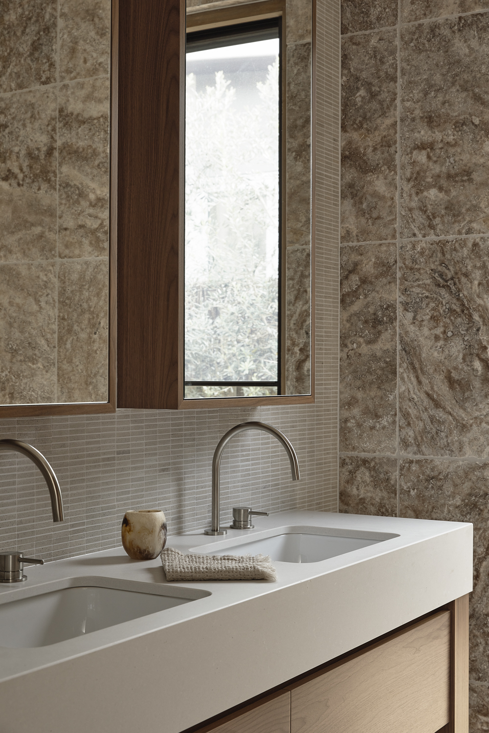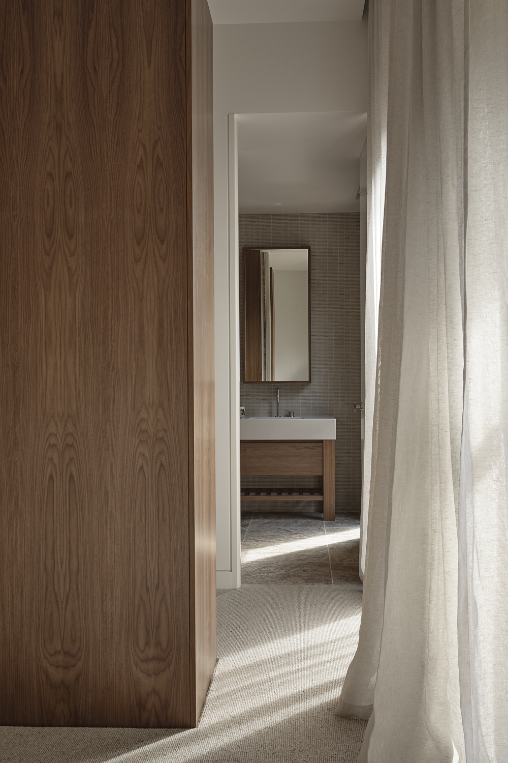 Built by Smith Builders and with landscape design by The Good Garden Co. and Point Nepean Landscaping, the form optimises the unique site, leaning into the undulations in the terrain. The cupping of open areas creates dedicated courtyard spaces, inspiring the home’s namesake, while also creating opportunities for the living areas to extend outward. A focus on inside and outside flow also reinforces a sense of place, while creating areas protected from the sea winds and natural elements when needed. Combining a quiet stillness, the soft and muted neutral palette creates a sense of calm and separation, while openings frame views out.