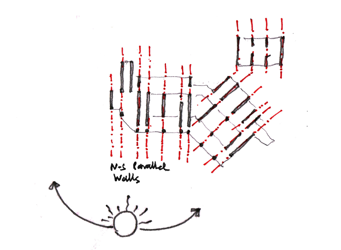 덥고 건조한 기후에 대응하는 건축공간을 제안합니다. 동서방향으로 높고 긴 벽은 음영지역을 만들어, 직사광선을 피하는 동시에 바람길을 통해 내부 온도를 조절한다. 내부에 계획된 7개의 중정은 거실, 식당과 같은 공용공간에 연계됩니다. 침실과 욕실과 연계되는 중정도 함께 계획됩니다.