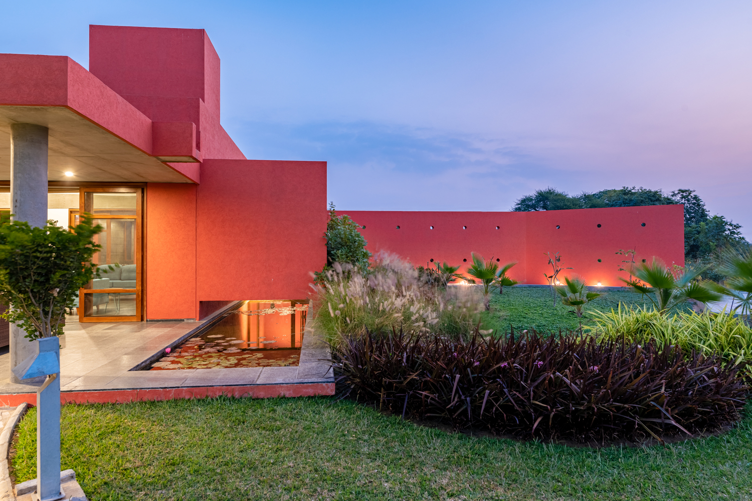 Landscape Design - For the landscape, there was a very strong emphasis on selecting local species of indigenous plants like Champa, garmalo, hibiscus, etc. At the entrance, there was a lily pond along with decorative plants like ferns, traveler’s palms, etc. that were very carefully placed across the site. The kitchen has a garden at the back where there were local species of fruits and plants like tulsi, and mint, that were consumed by the owners. The large lawn was a rolling landscaped area with gentle mounds and a blend of fine grass and elephant grass.