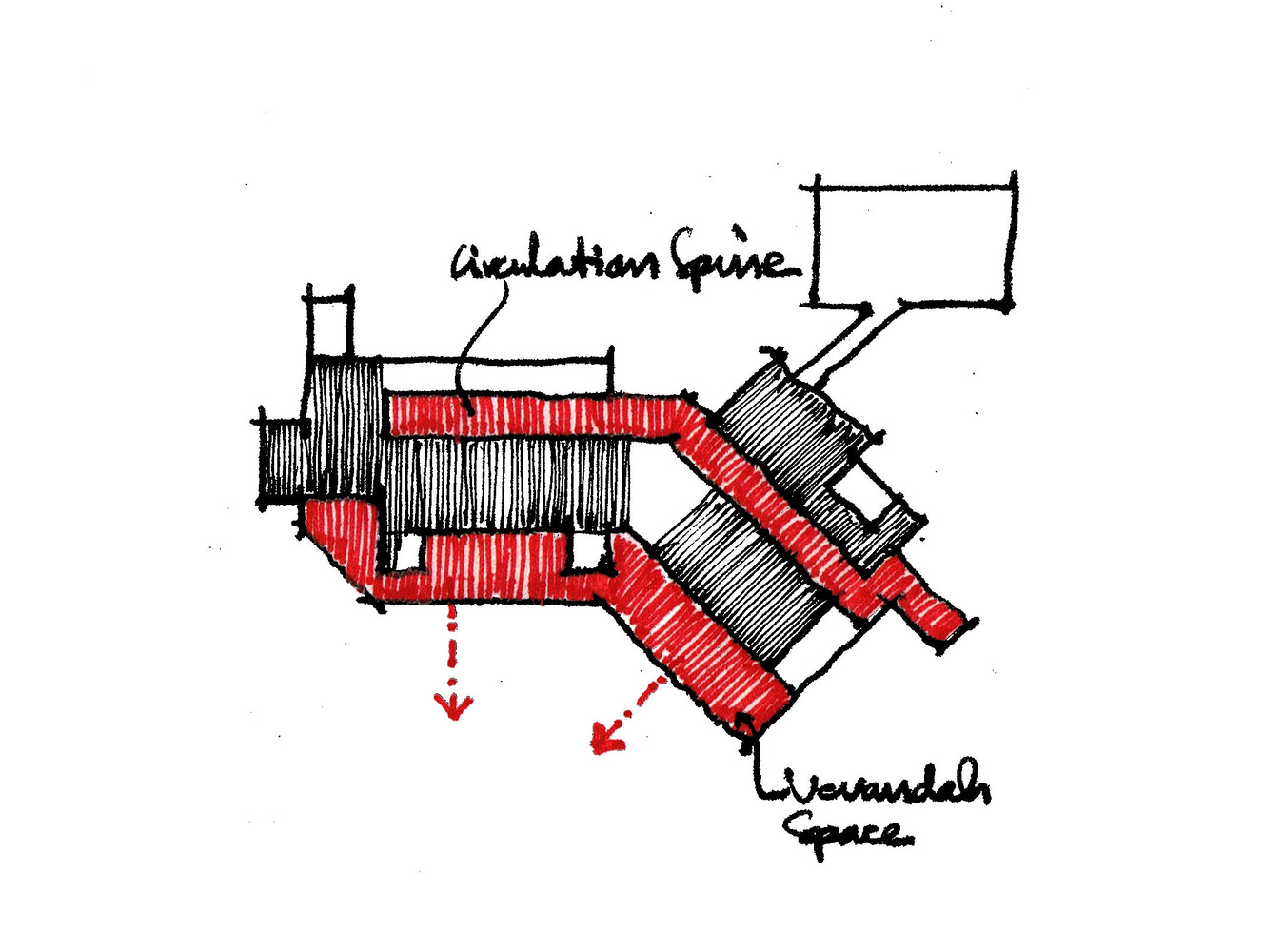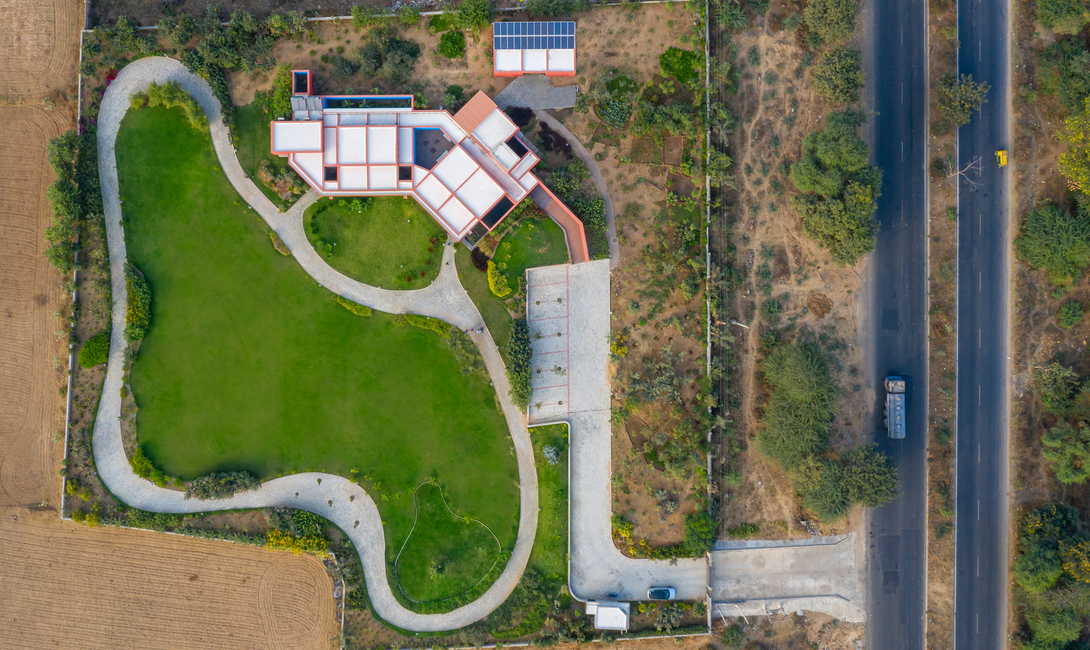 Site Planning - The mass of the house was placed in the Northeast to capture the cool Southwest Breeze. In the East, dense vegetation was planted to act as a visual and noise barrier from the highway. The remaining part of the site is converted into a landscaped lawn with a curved pathway and various landscaped elements and local plants and trees.